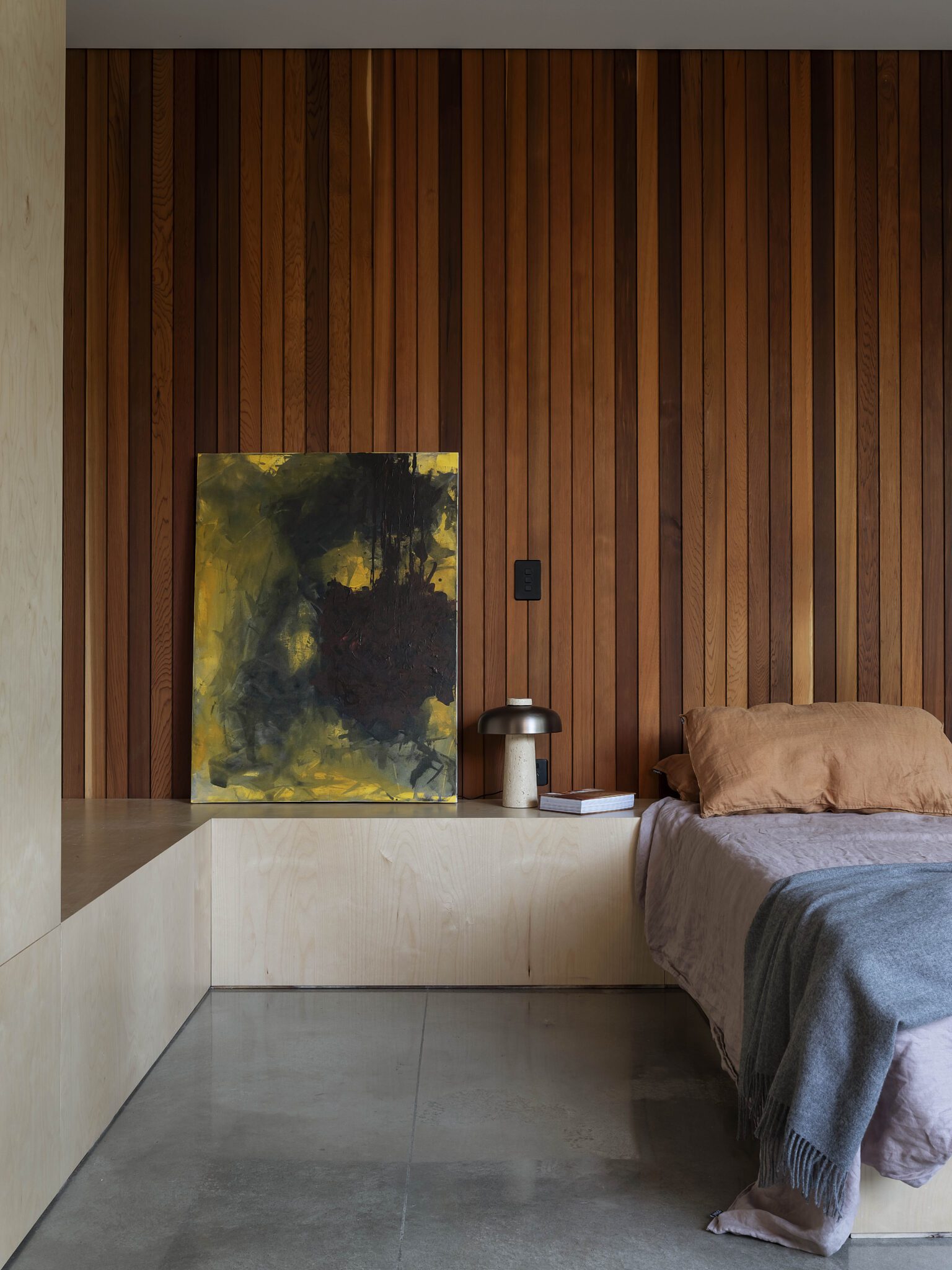 The clients wanted a warm house, both in atmosphere and appearance. Timber linings wrap around curing walls to the interior, and the fireplaces help to wash the walls with a warm glow into the evenings.