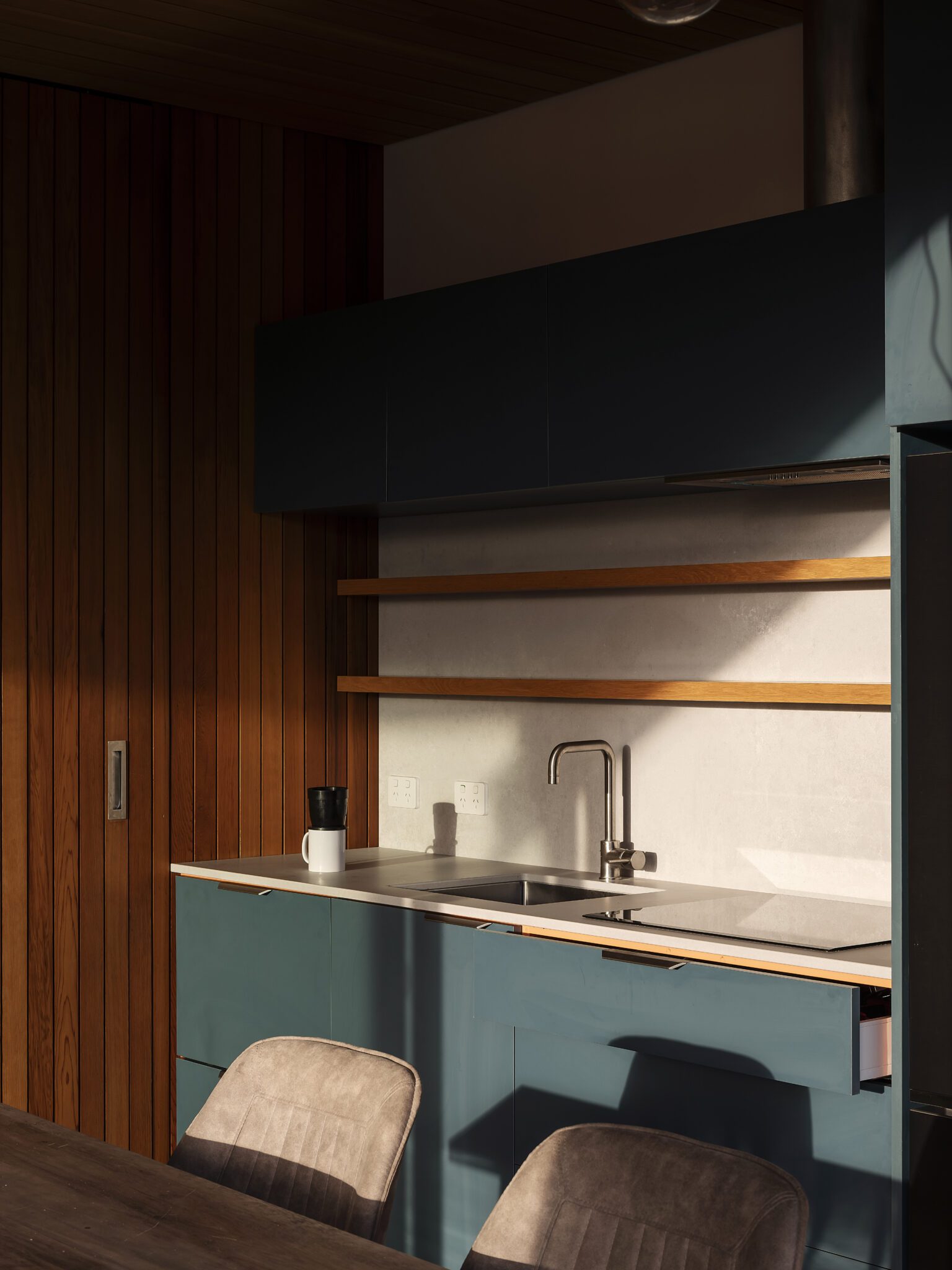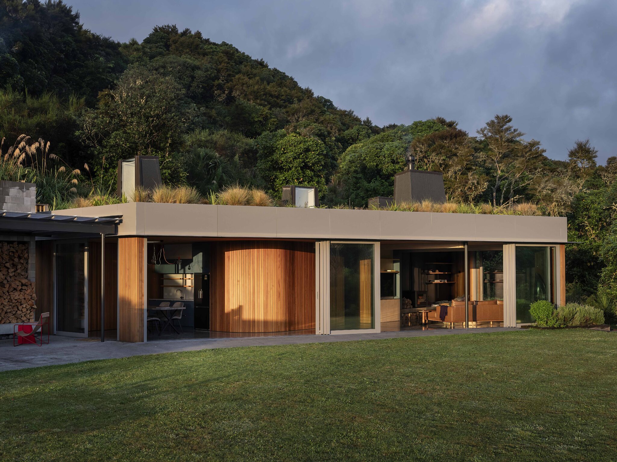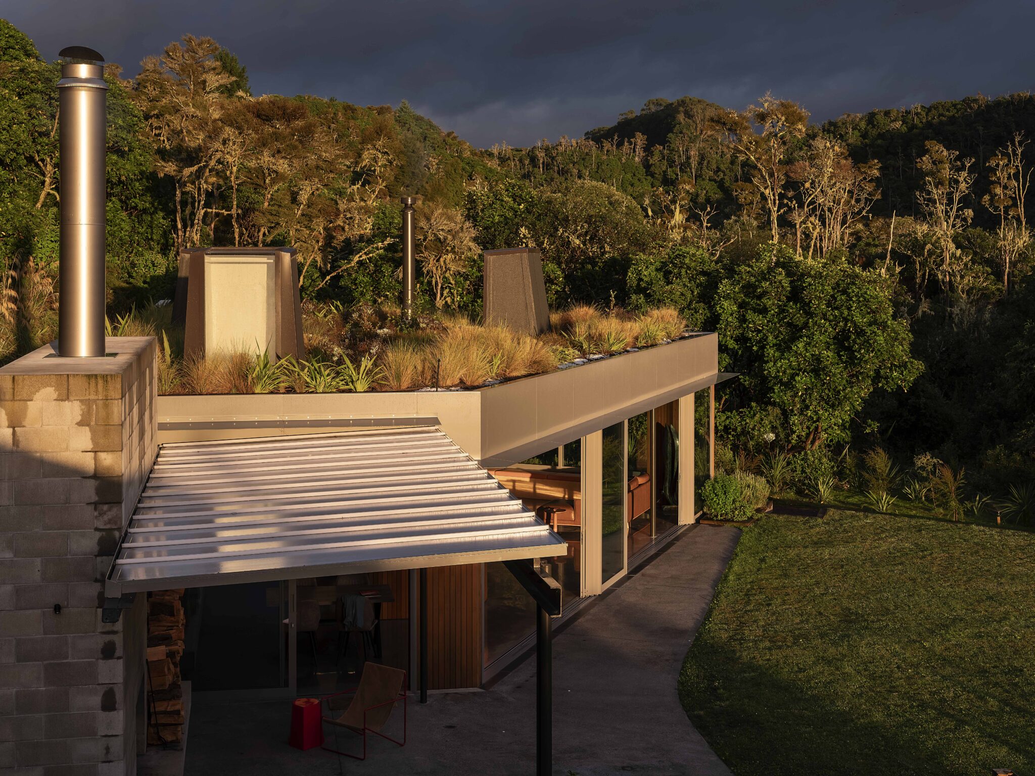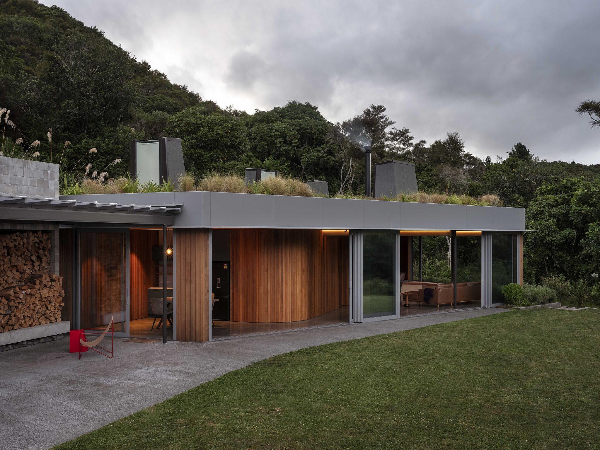 Whareroa is a home away from home for a busy family, and at times a meeting place for extended family and friends to gather, fish and enjoy a slower pace of life. The building is a triangular shaped form tucked into the hillside, picking up on the angles and orientation of the shape of the site. It opens out to the north and to the native forest to the west, with glimpses of the lake to the east.