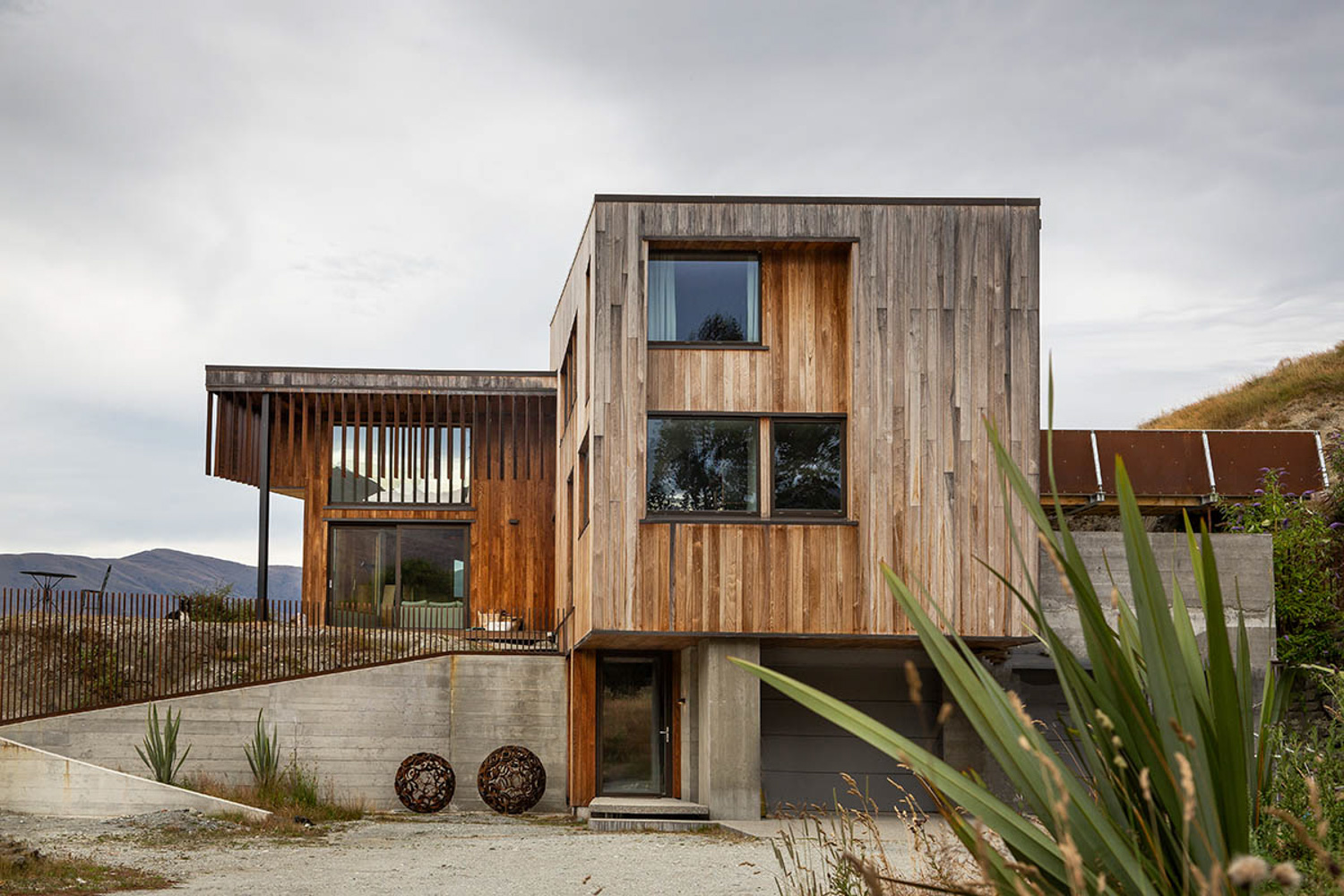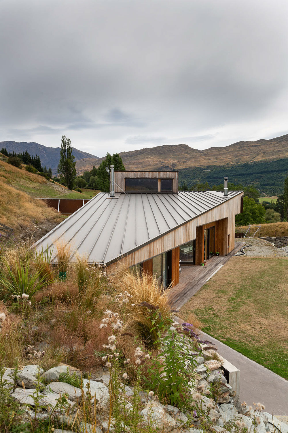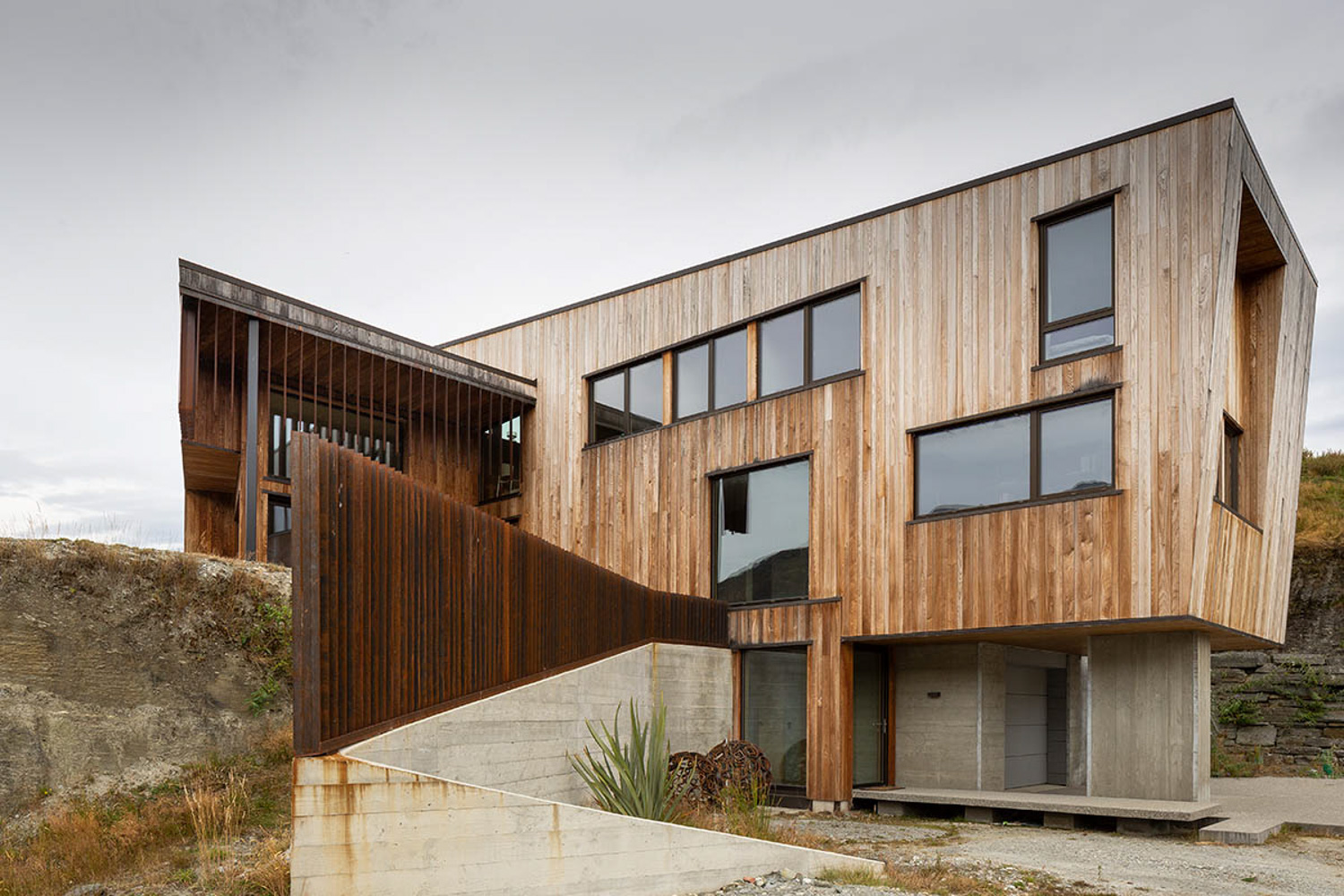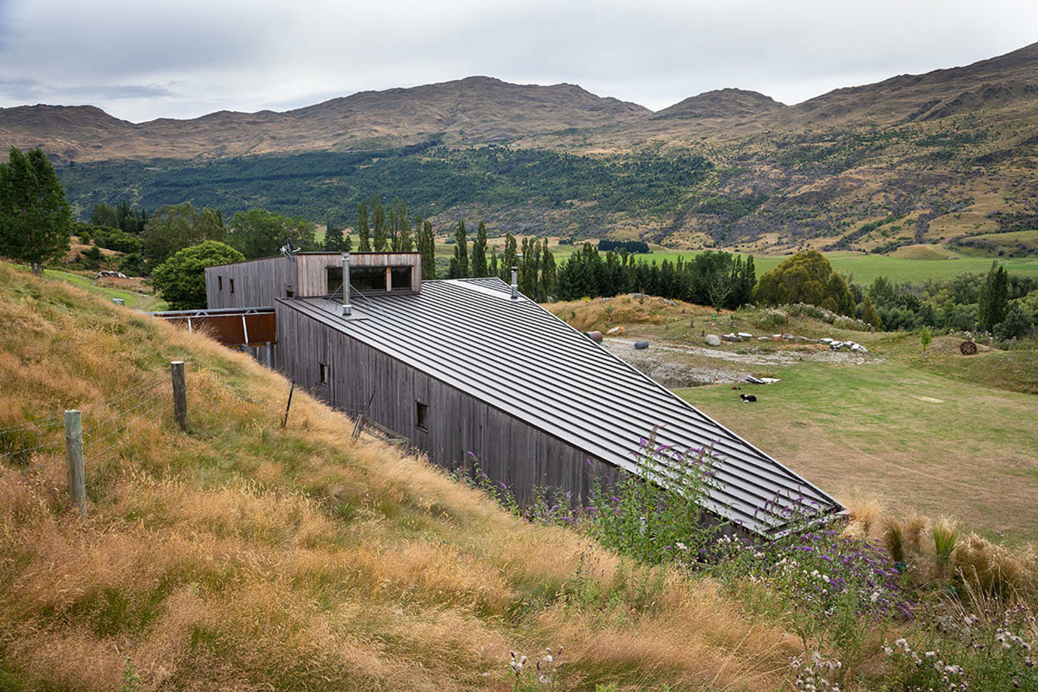 This house was designed for a busy family that relocated to Queenstown after the Christchurch earthquakes. It sits on an elevated rural site around existing earthworks and stone walls started by the former owner. It is a magnificent rural Queenstown location looking north towards Coronet Peak and the Southern Alps. The building has been keyed into the landscape while also dramatically floating out from it.