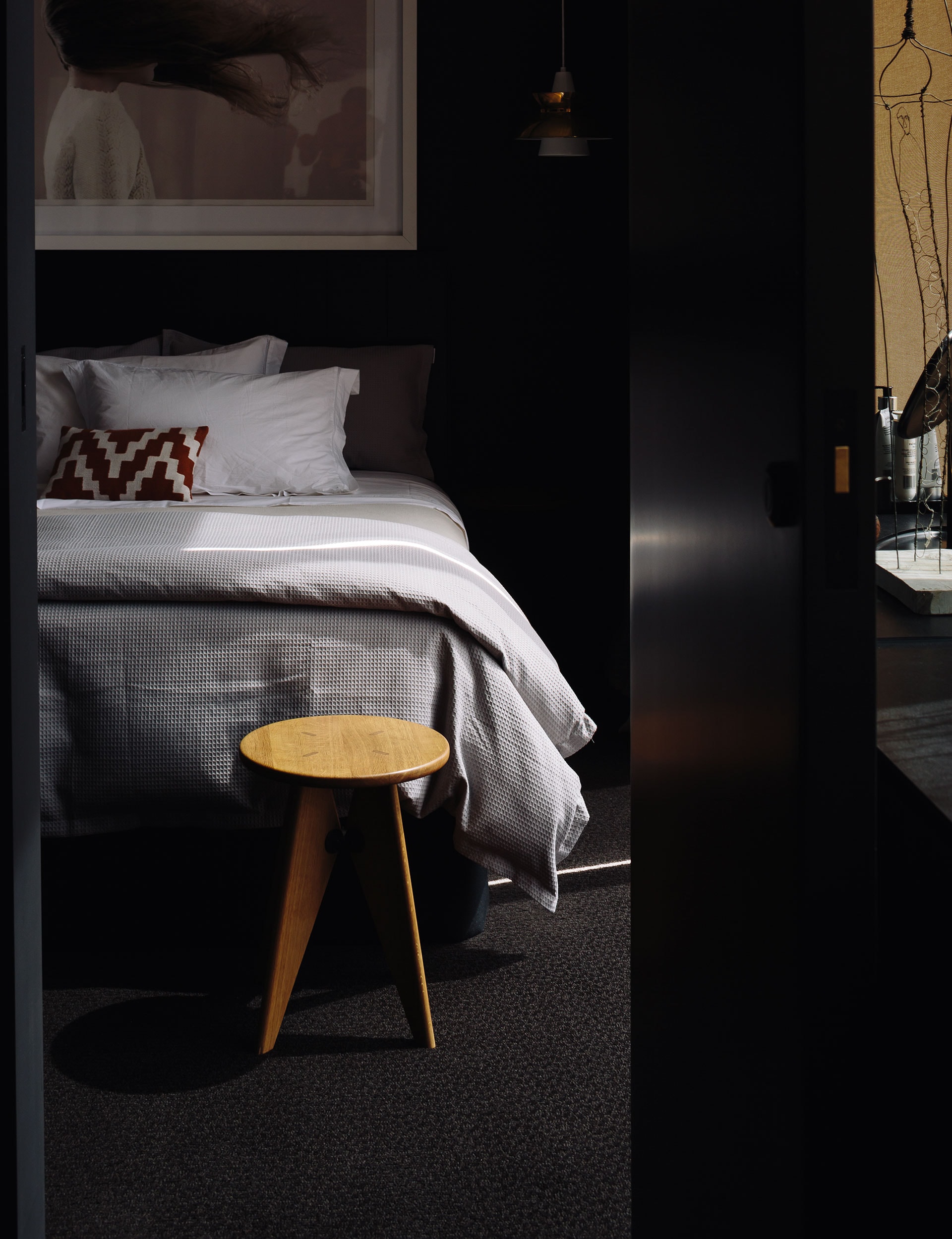 Where most would paint a contemporary house like this white, Sharpe opted for a dark, textural palette – basalt floors inside and out, dark-stained timber, and walls in ‘Bokara Grey’ by Resene. Almost black, it’s soft and enveloping. “The clarity of light here is so strong,” says Sharpe. “You can’t compete with it. As soon as we had colour on the wall, it nestled in.