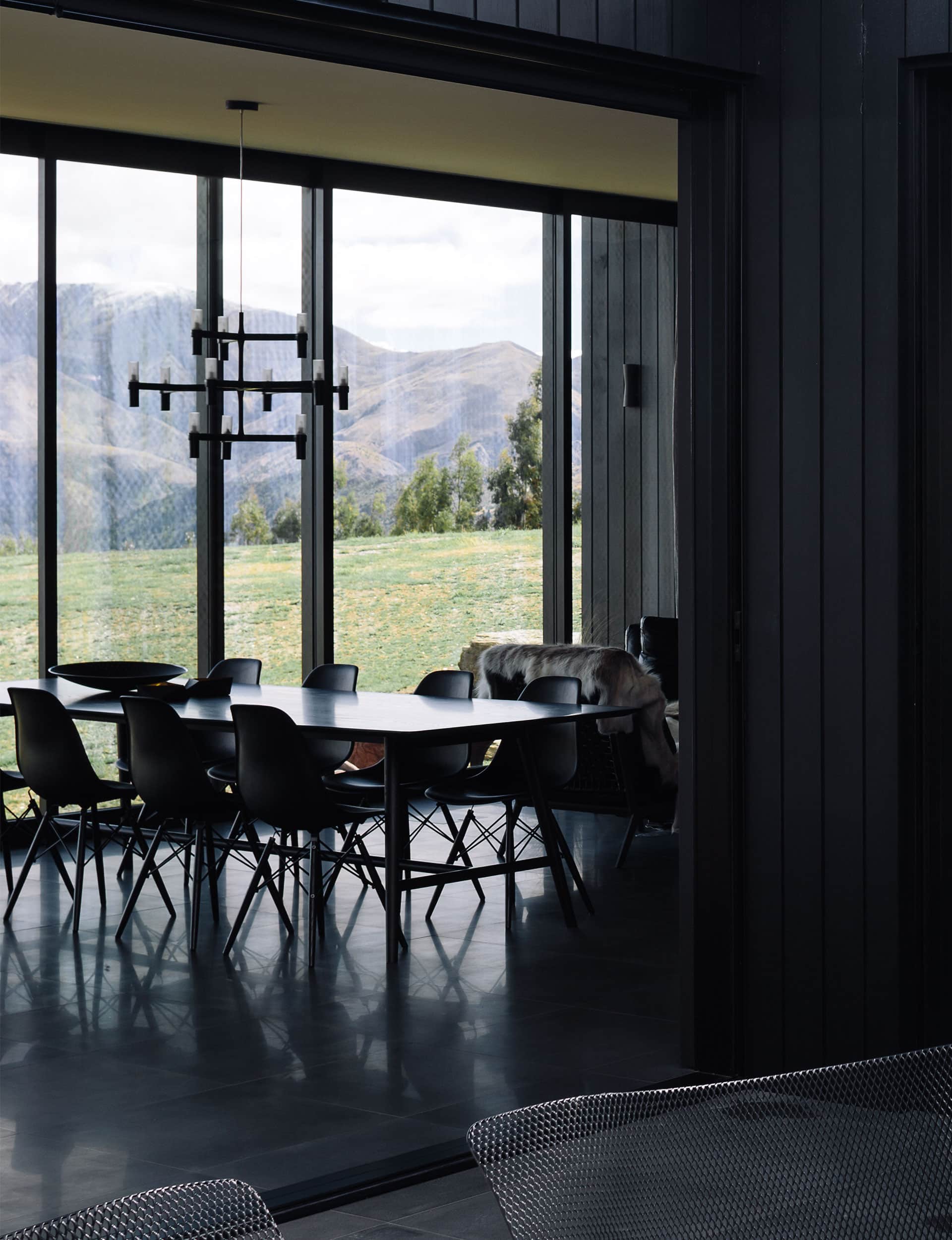 It’s almost filmic. After turning off the main road to Gibbston and up the switchback Crown Range Road, you turn onto a rutted gravel driveway and a dark house in the distance flits in and out of view. As the road swings and turns, the house is sometimes there and sometimes not, a shadowy shape on the horizon backed by the Remarkables mountain range. The view takes in a wide sweep from the Remarkables to Coronet Peak, looking down the valley towards Queenstown.
