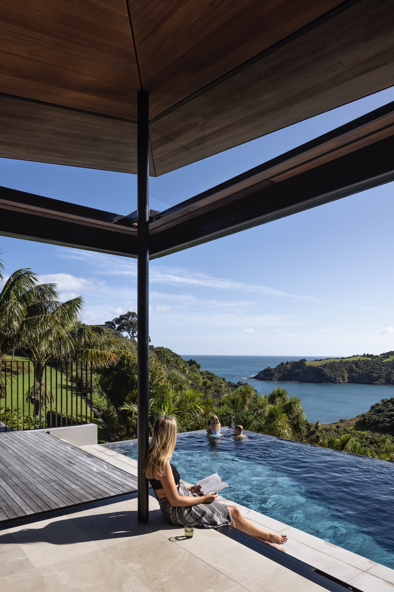 High above Waiheke Island’s Owhanake Bay, this pool pavilion speaks to the architectural nuances of the main home, while introducing its own distinct identity — a restorative space intuitively connected with land and sea.