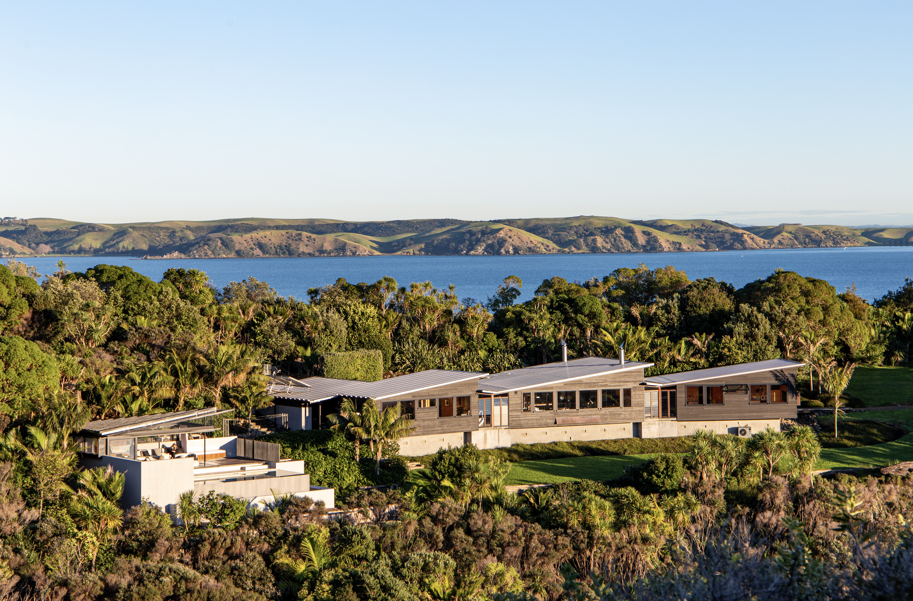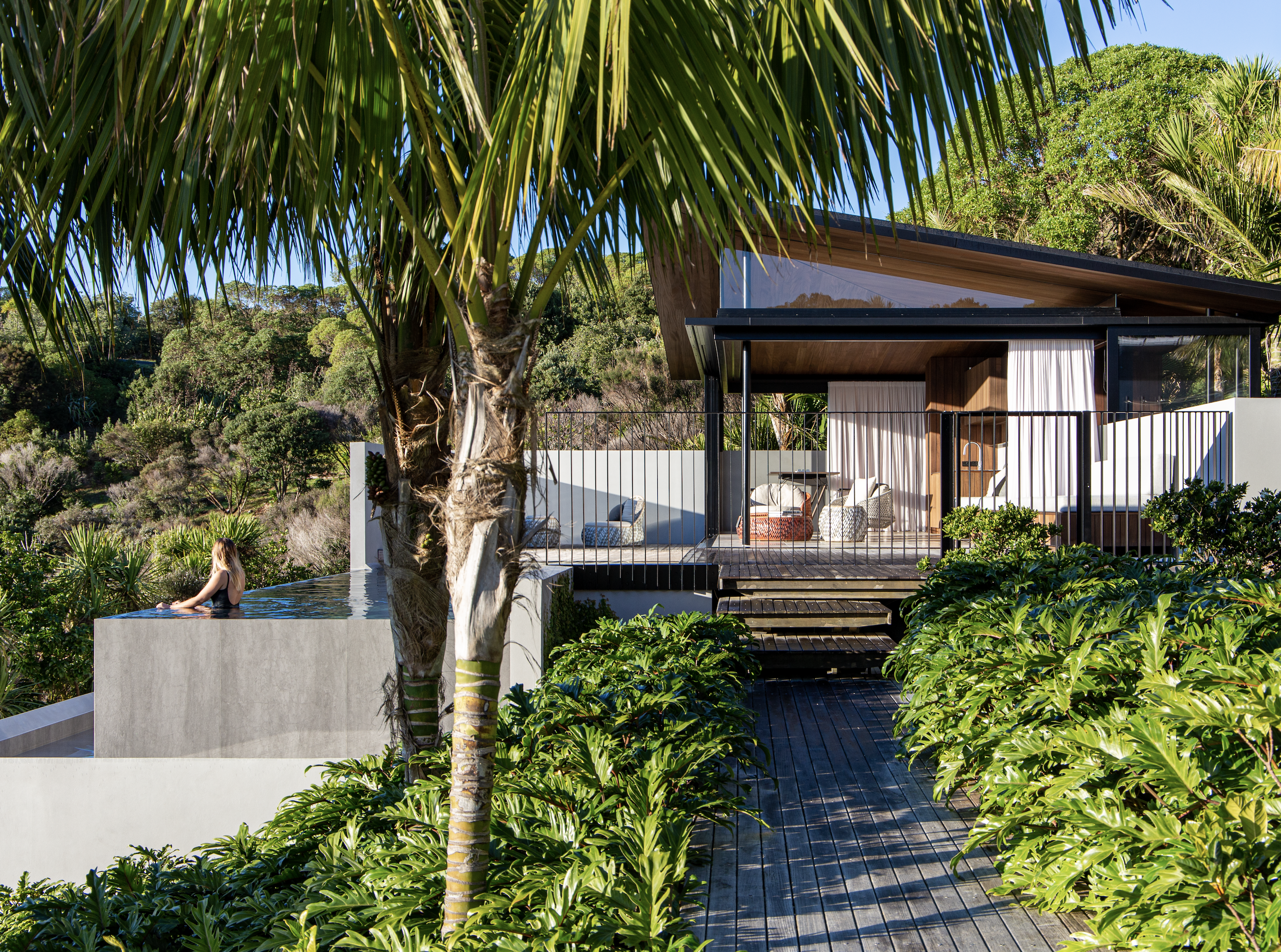 peels back one corner so that from here, there’s an unimpeded view across the regenerating forest where palms and cabbage trees, mānuka, karo and karaka sweep down to a horseshoe-shaped beach.