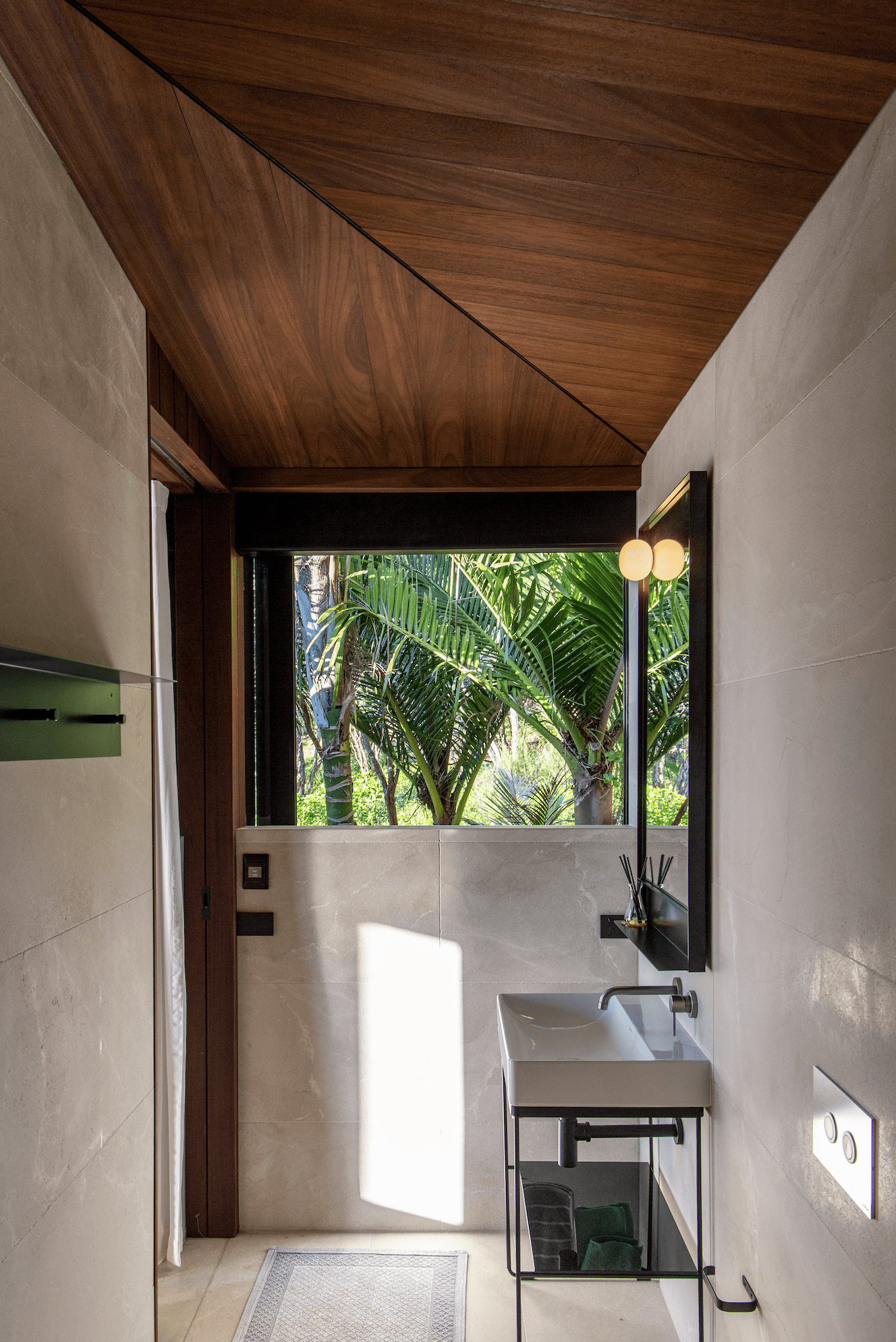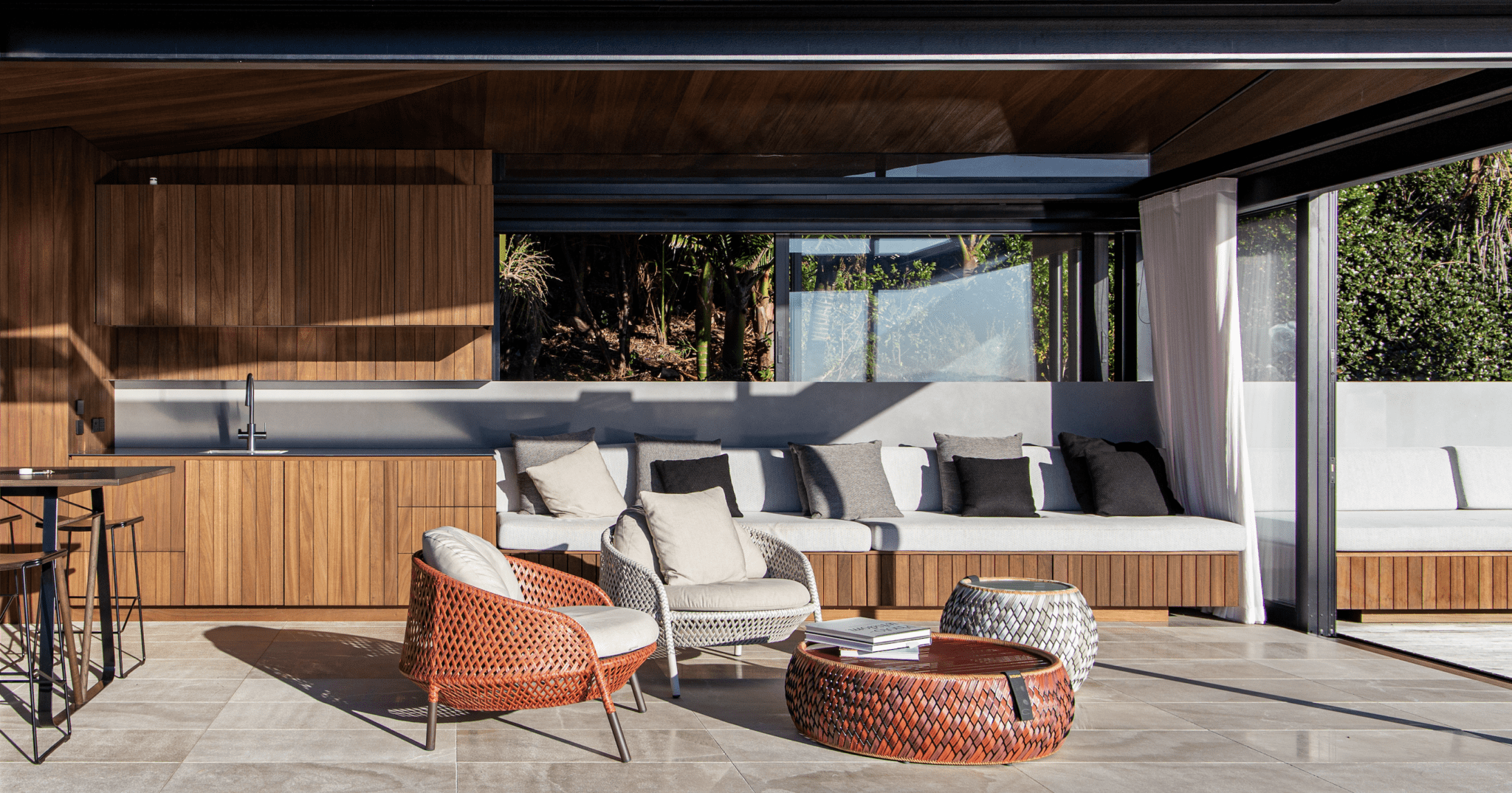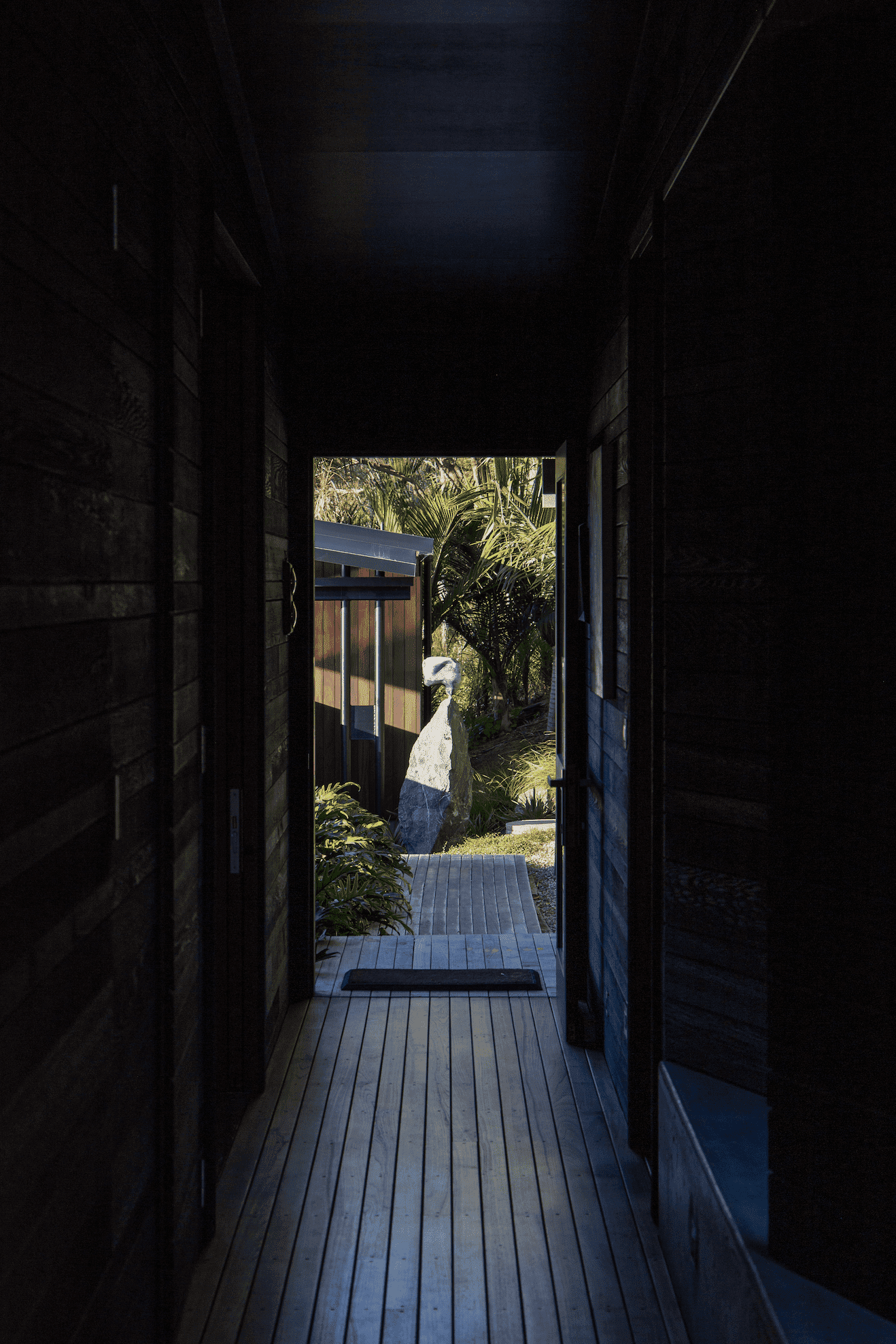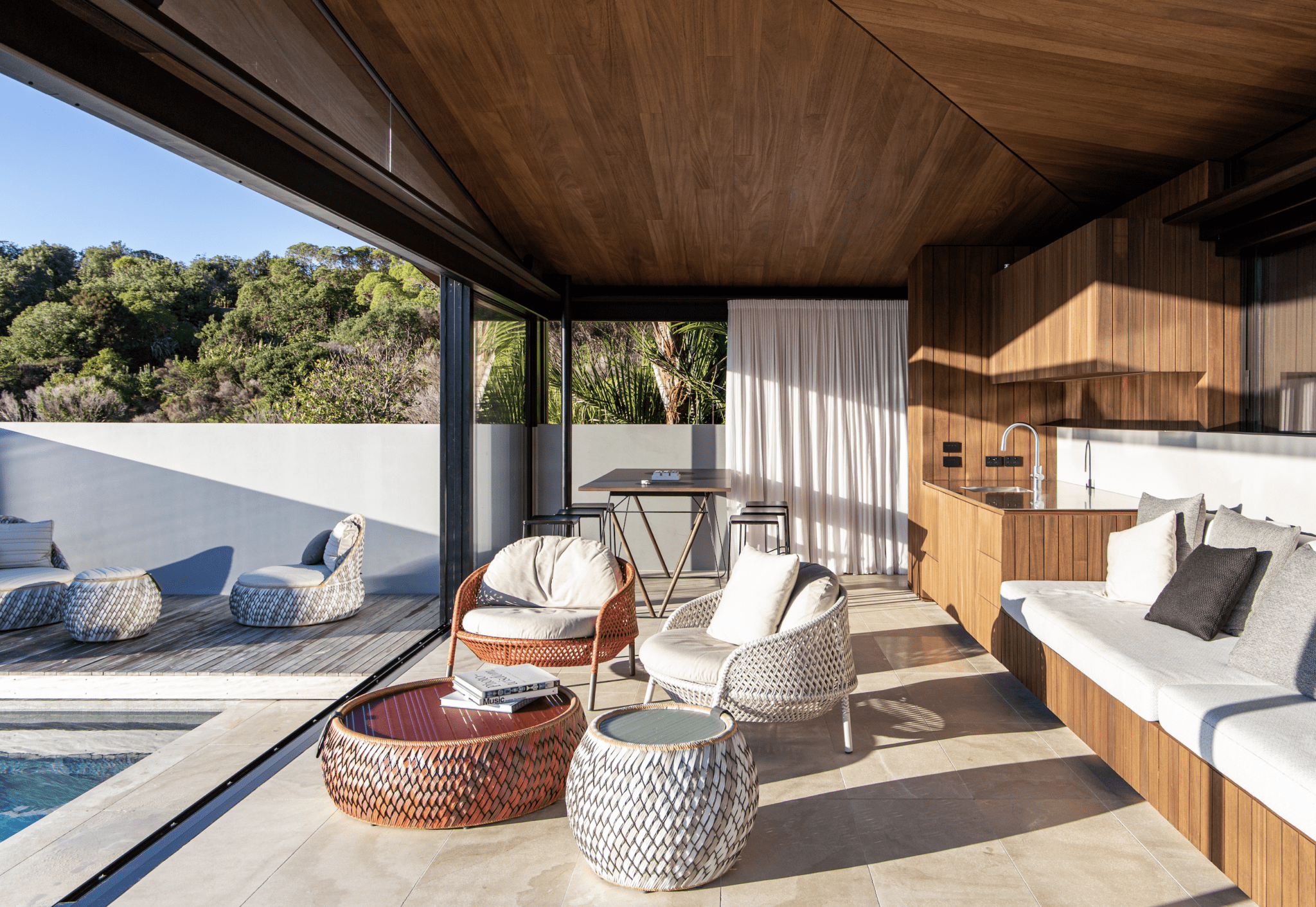 A bar leaner, a kitchenette, built-in bench seating that traverses the threshold to the deck and a shower room with a glimpse of a nīkau grove make up the interior. Timber-lined ceilings, cabinetry and wall panels bring warmth to the make-up. “It’s Truwood, a thermally modified sustainable timber, and it references the colouration of the existing brown-toned ceilings in the main house,” says Roy.