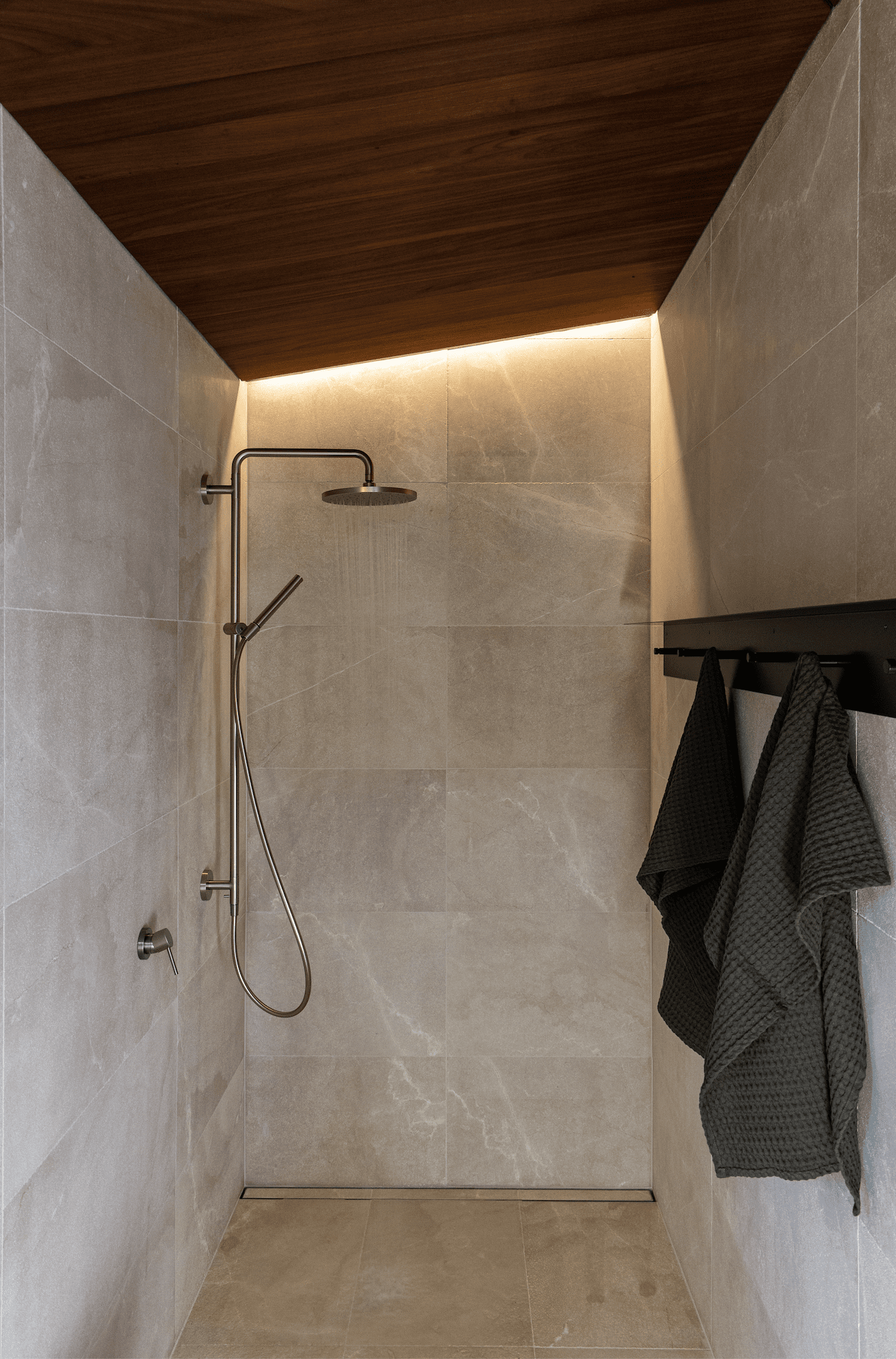 Limestone pavers used on the patio run straight through to the pavilion flooring and on up the shower-room walls. “The tiles are durable so will have longevity, but they are also lightweight enough for the suspended timber structure beneath,” explains Roy.