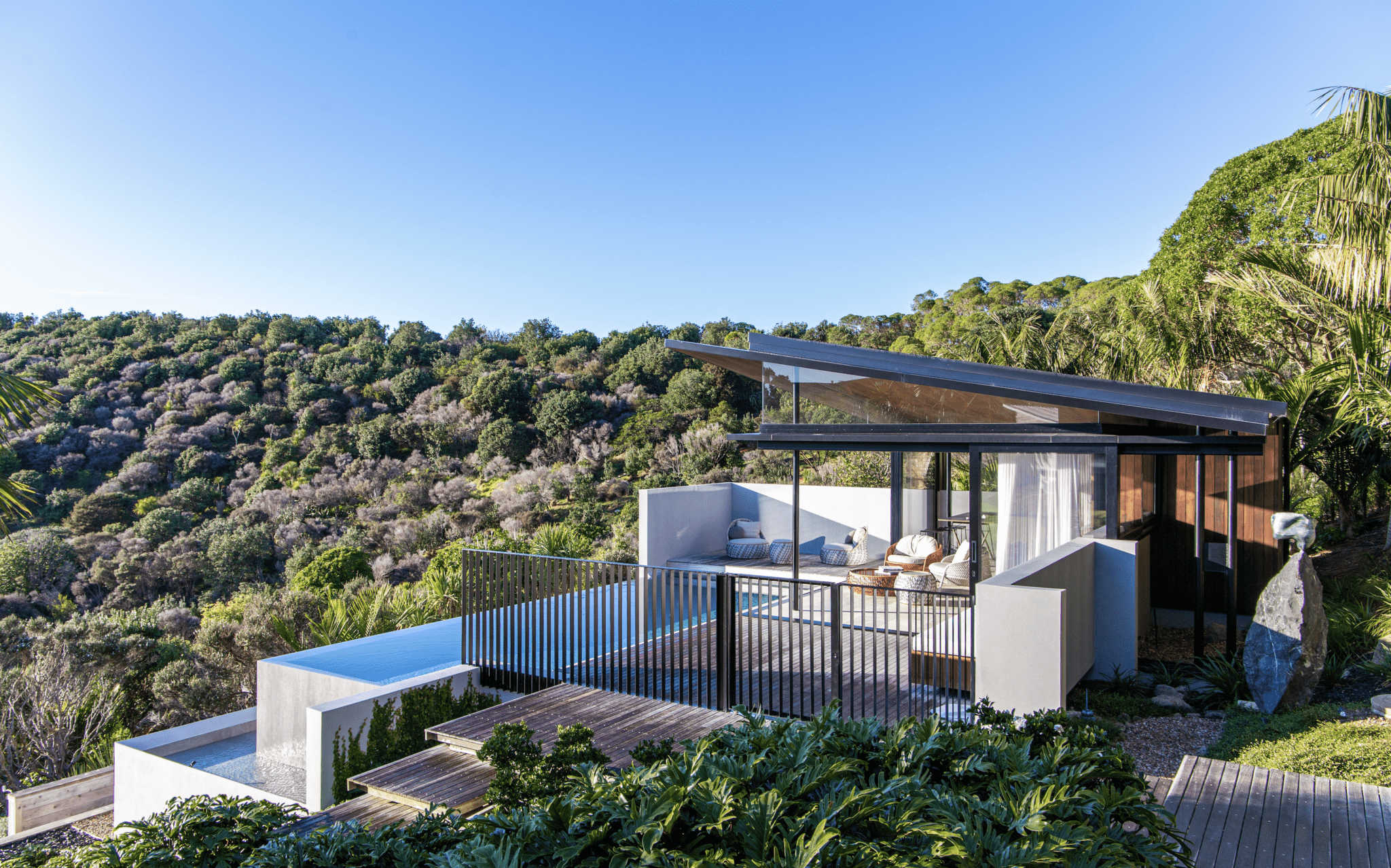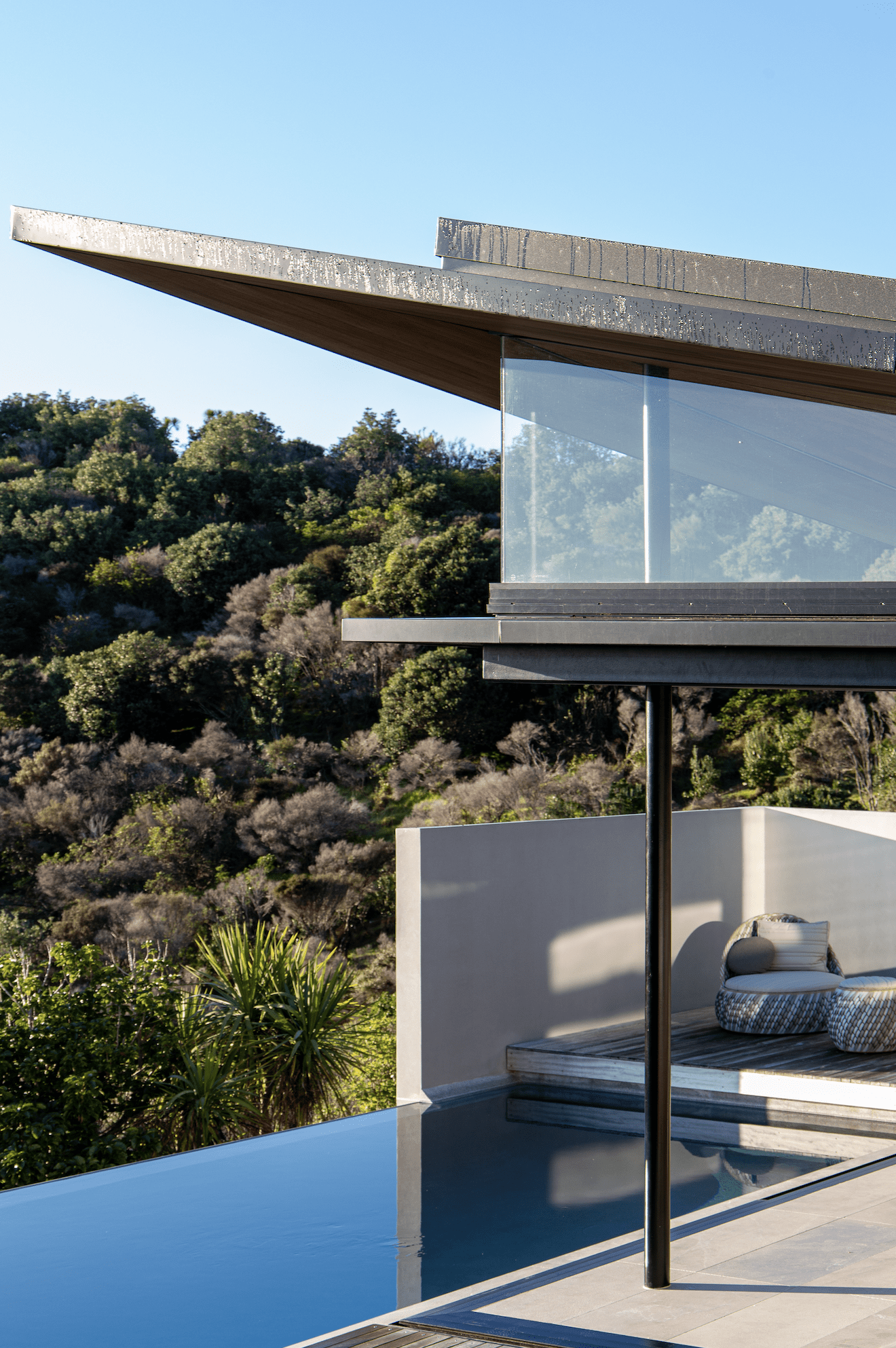 Sloping topography and privacy from a DOC walkway alongside the proposed building were challenges the design needed to address, not to mention the manoeuvring required to satisfy council’s pool-safety regulations, without compromising the experience.