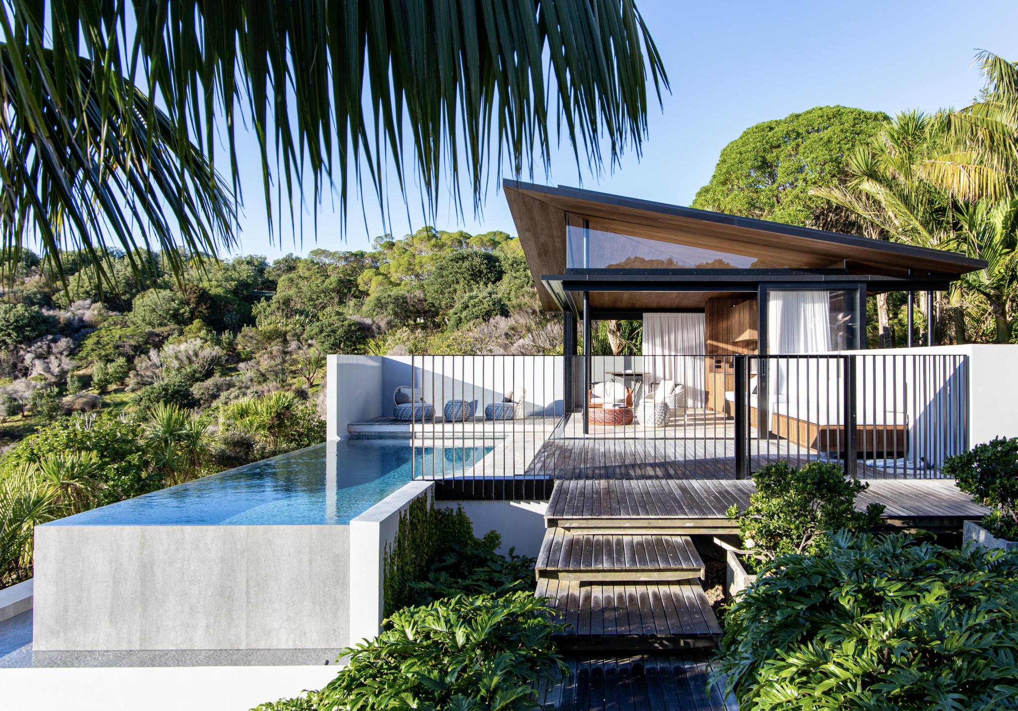 Project architects Roy Tebbutt and Joanna Jack, of SGA, naturally took the bush-blanketed backdrop into account when they were asked to craft a pool house overlooking Owhanake Bay. Their clients, who came to them because the practice had designed the award-winning main home, wanted a sympathetic approach but not a slavish replica. Same same, then, but different.