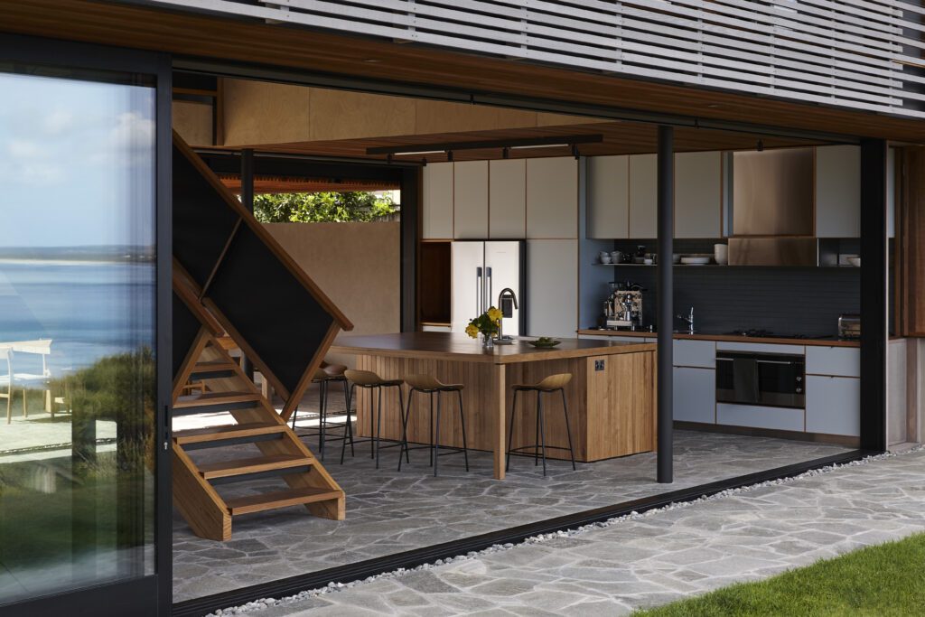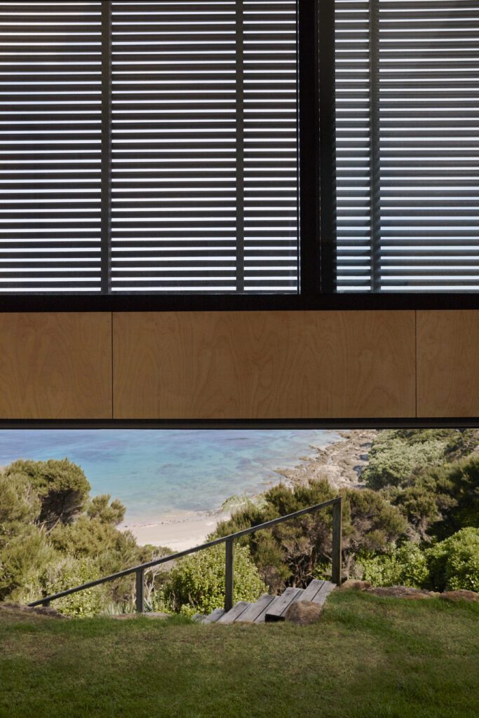 “It’s an outside courtyard that looks through to the view,” says Lance. “The bracket wall comes around and becomes a cradle that essentially holds this timber box, which houses all the rooms and has a void in the middle.”