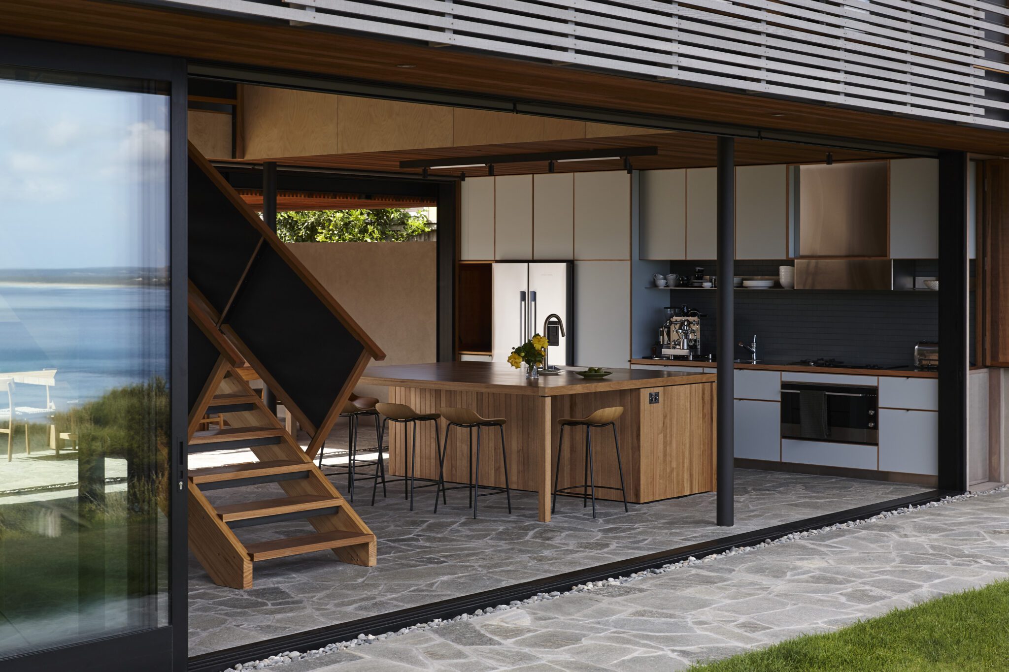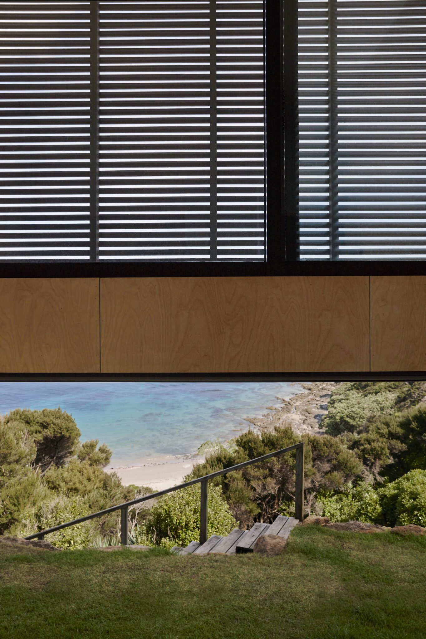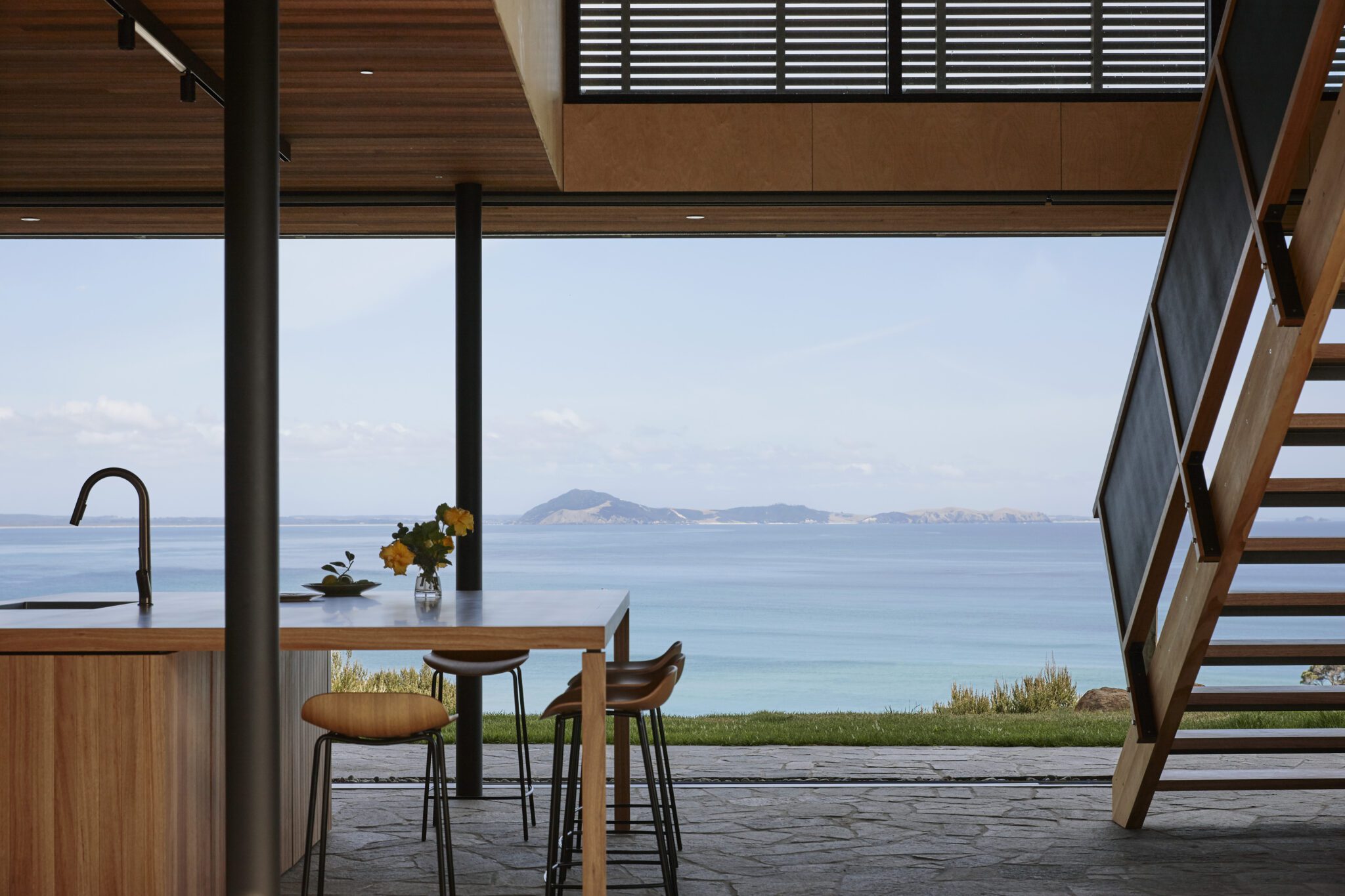 The beautiful woodcraft and perforated metal of the stairs ensure that the transition between lower and upper level is subtly sculptural without detracting from the views or upsetting the finely tuned proportions of it all.