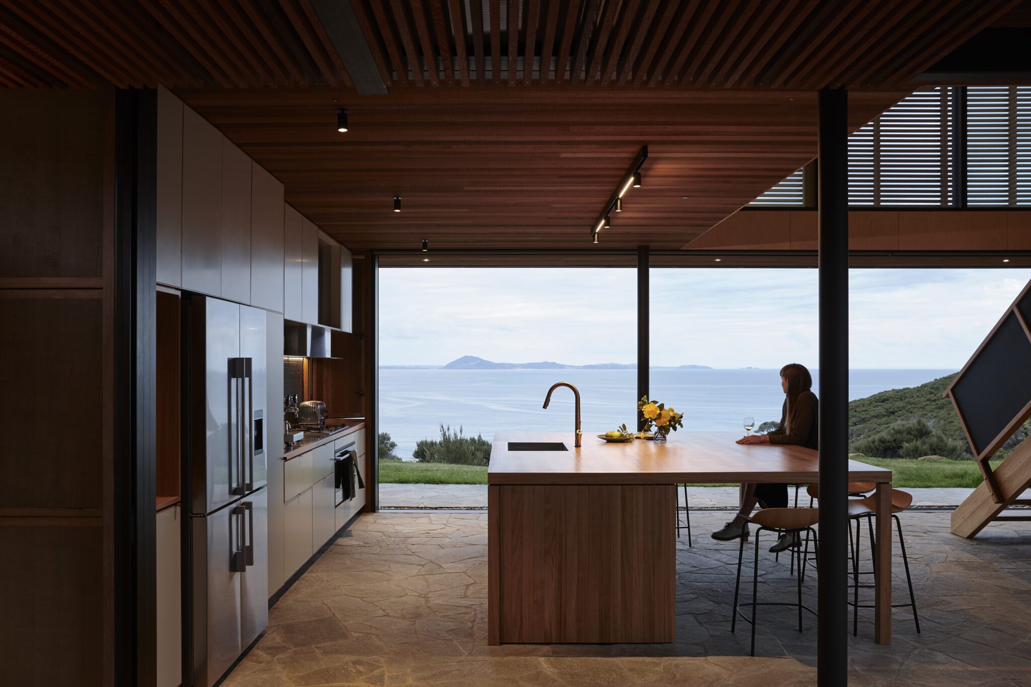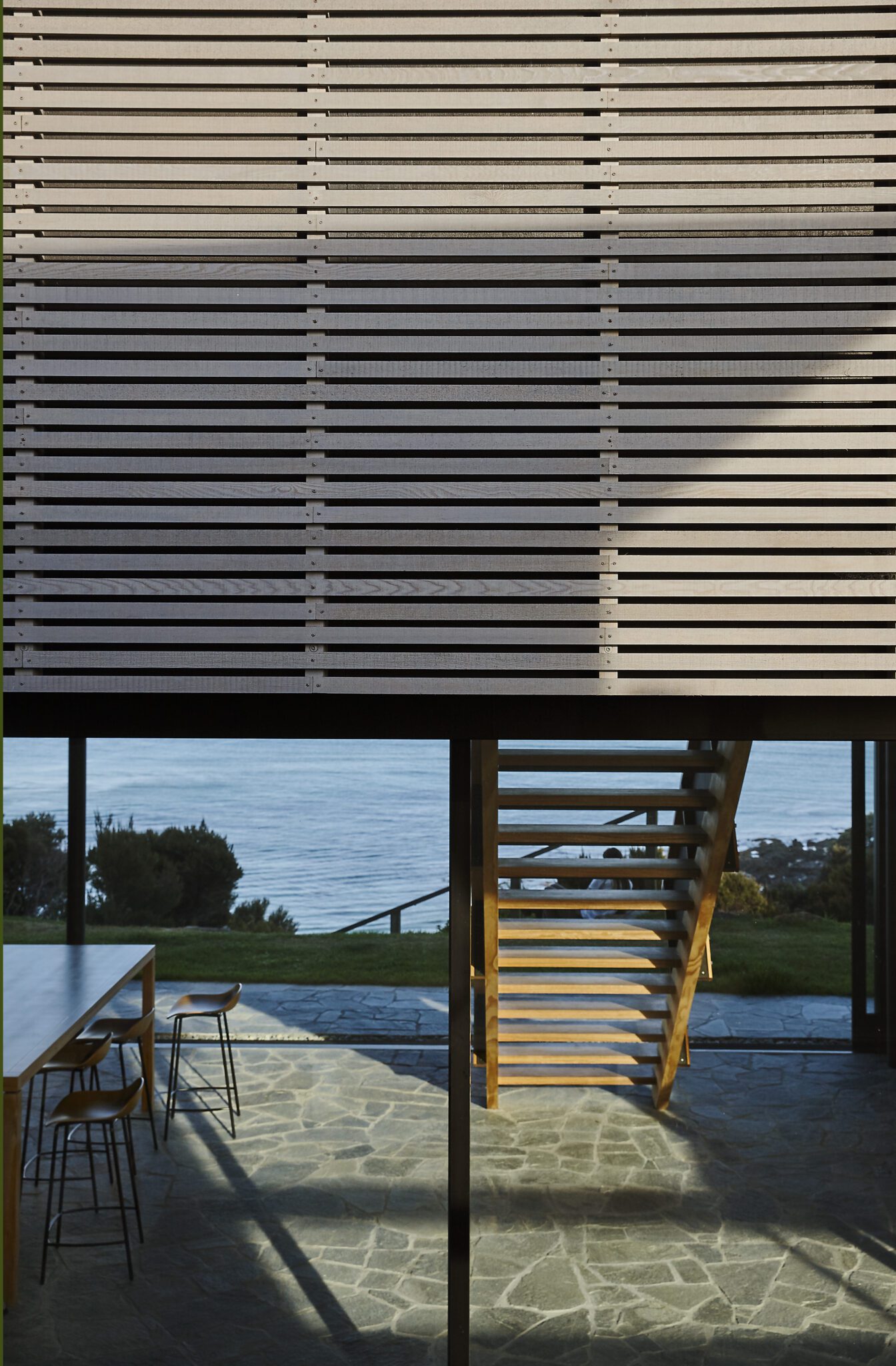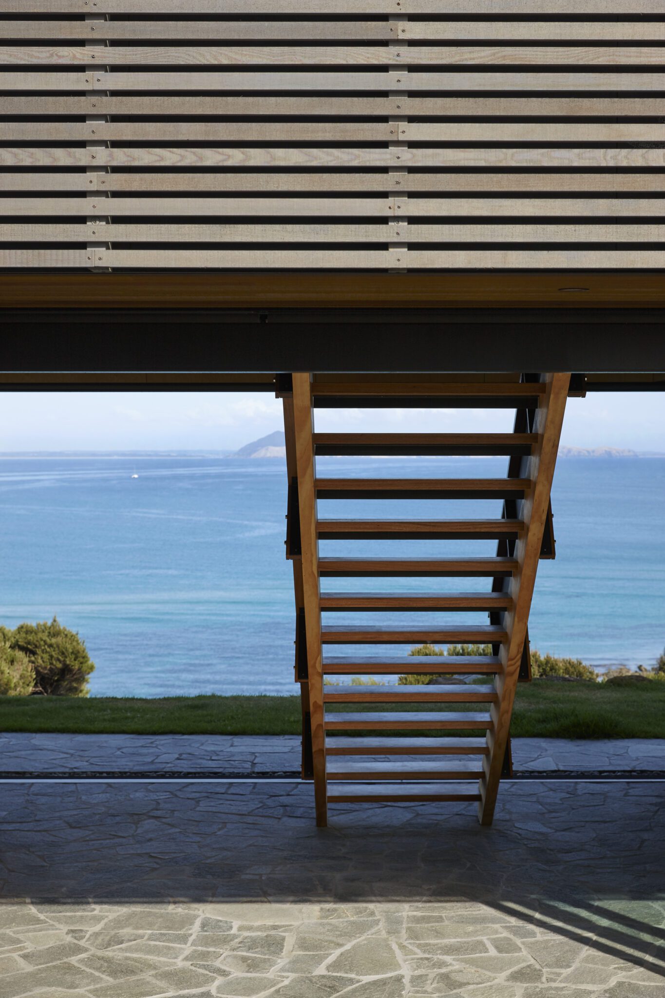 The beautiful woodcraft and perforated metal of the stairs ensure that the transition between lower and upper level is subtly sculptural without detracting from the views or upsetting the finely tuned proportions of it all.
