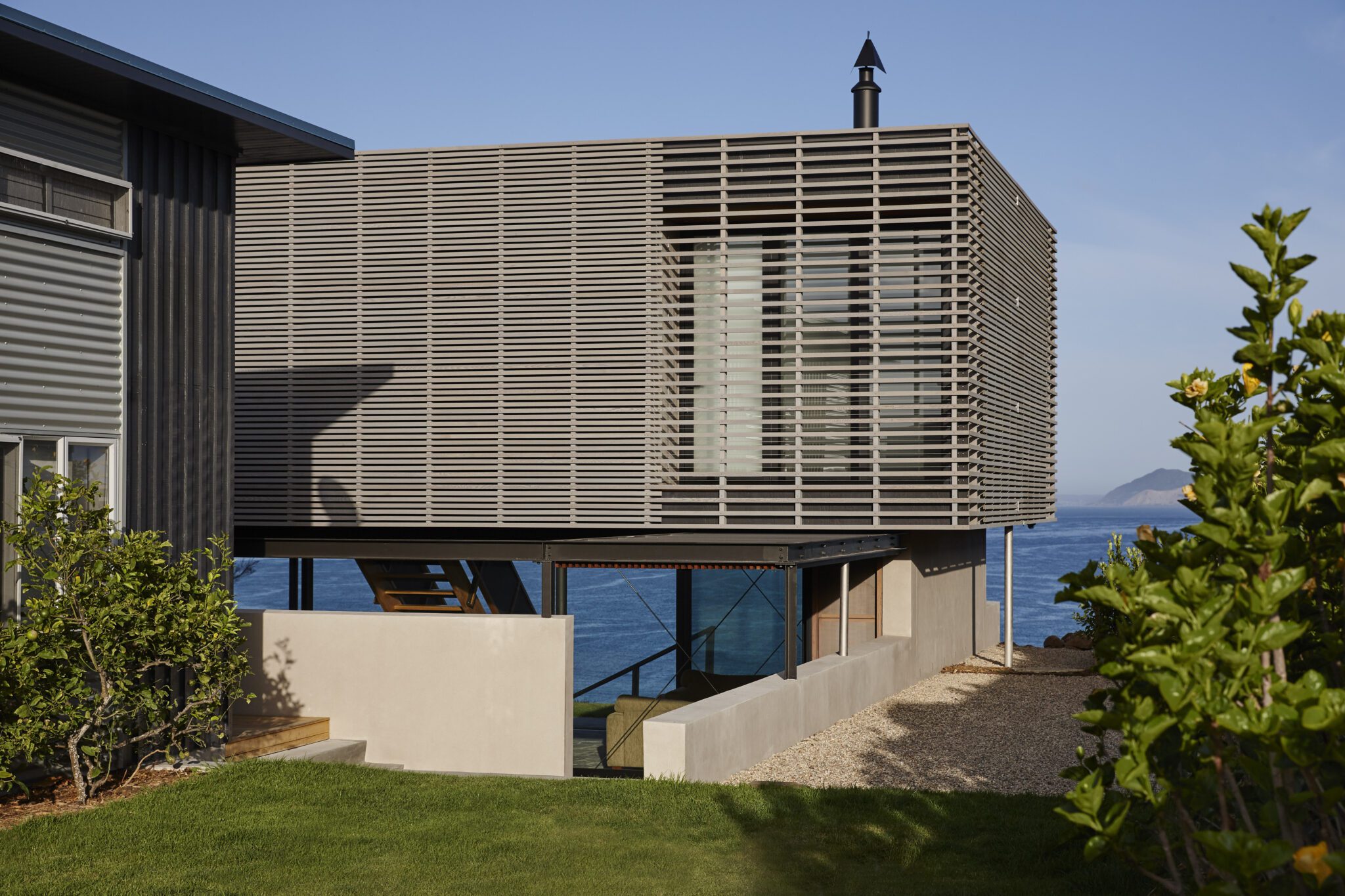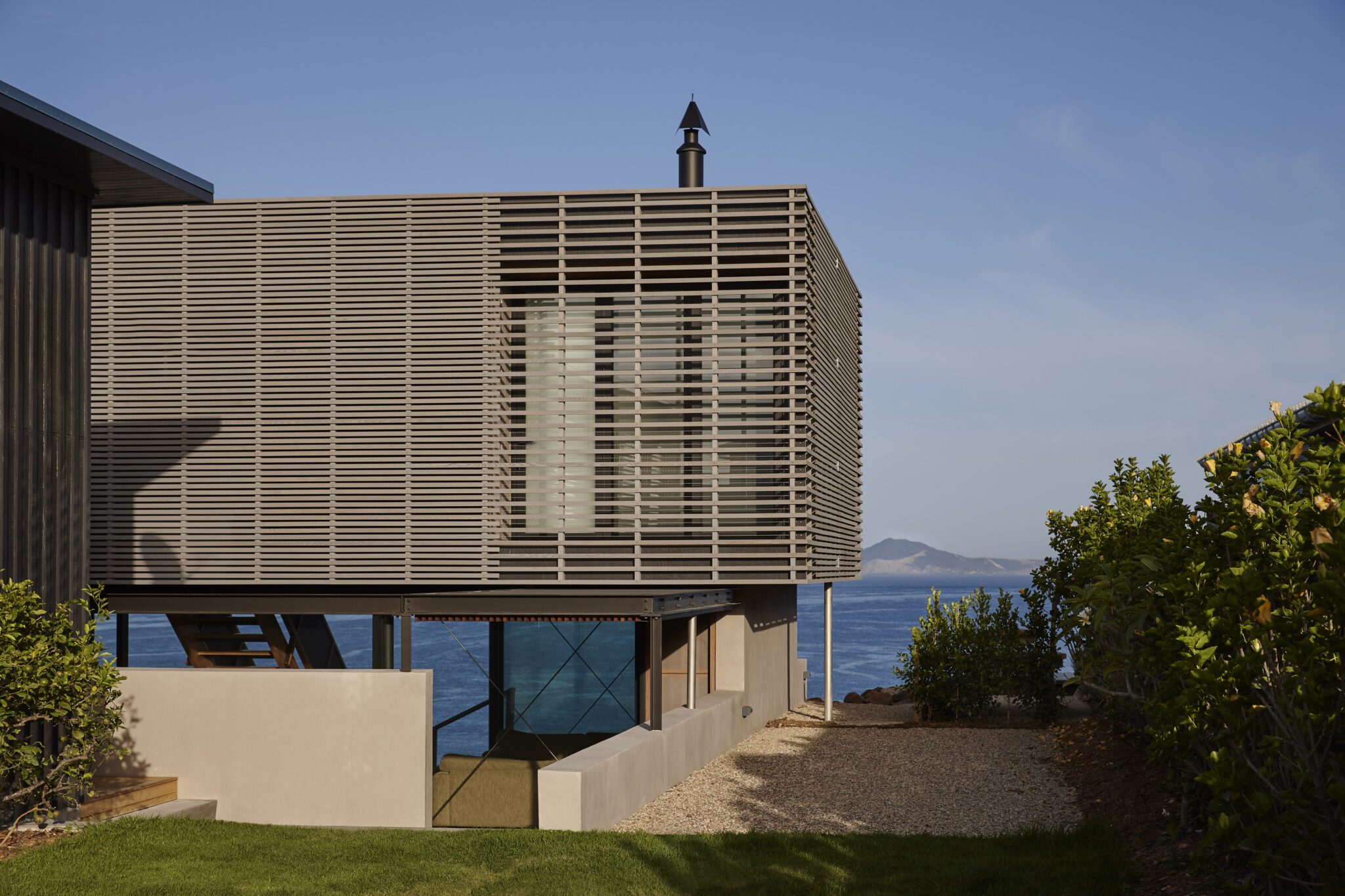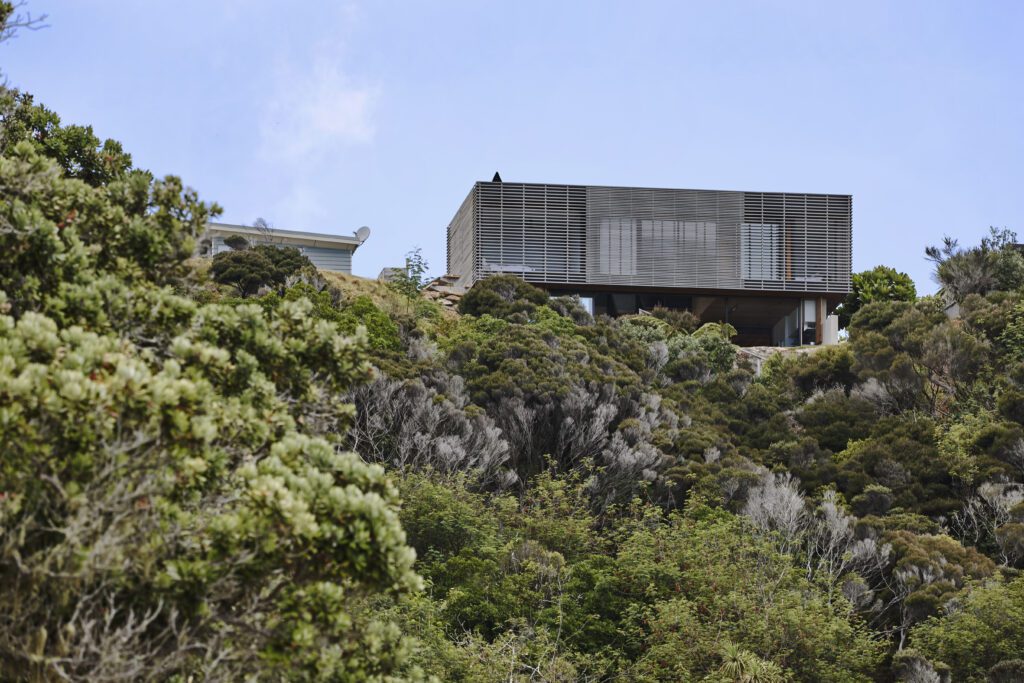 “At first we thought, ‘How do we bring it into the language of what we are trying to do?’,” says Lance Herbst of Herbst Architects, of the existing large garage and sleepout on this long, hilltop site overlooking the ocean in Rangiputa.