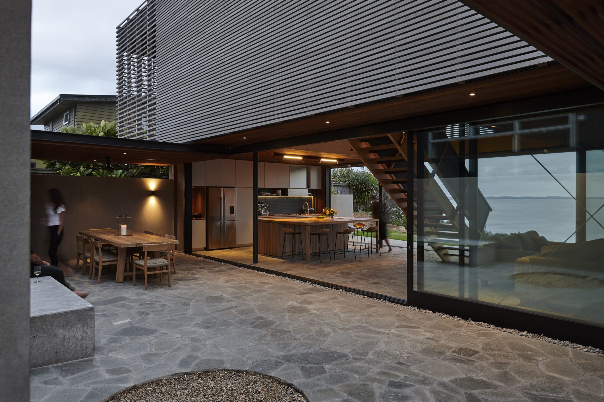 The ground floor can be opened up entirely — via retractable, sliding, glazed doors — and continues the outside courtyard’s language of crazy paving that helps to define this area as a lanai.