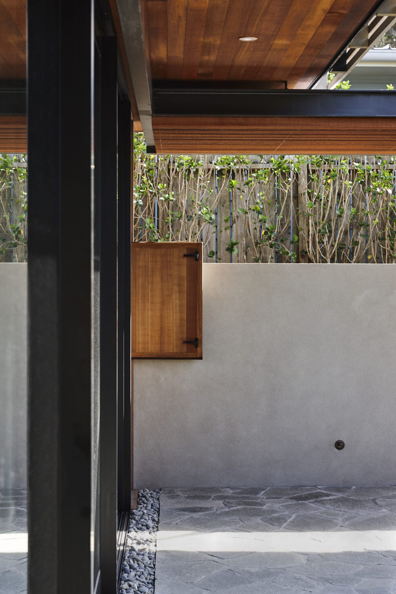 The plan drawn up by the Herbsts pushed the building as far as possible towards the edge of this exquisite tableau. It also involved digging more than a metre into the soil — a move that further dislocated the building from its neighbours, giving it vertical rather than horizontal separation, shifting the height-to-boundary restrictions, and turning the older structure into both an arrival sequence and a foreground.