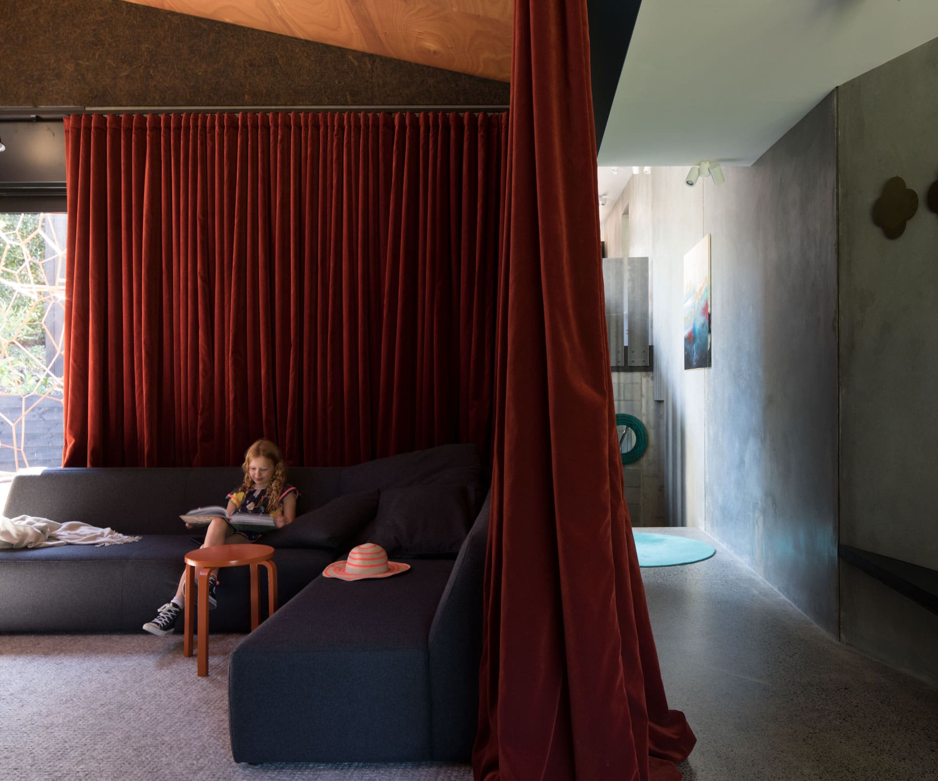 Robust, angular and with a modern industrialist feel, this solid concrete family home by Dorrington Atcheson Architects challenges the concept of suburban living. Here, complex thinking delivers the opposite – a Zen-like state of being where spaces are revealed slowly and the moodiness of the palette keys into the adventure of discovery. Raw concrete blade walls meet salt-and-pepper flooring, charcoal-stained dividers and black joinery. This is darkness by design.