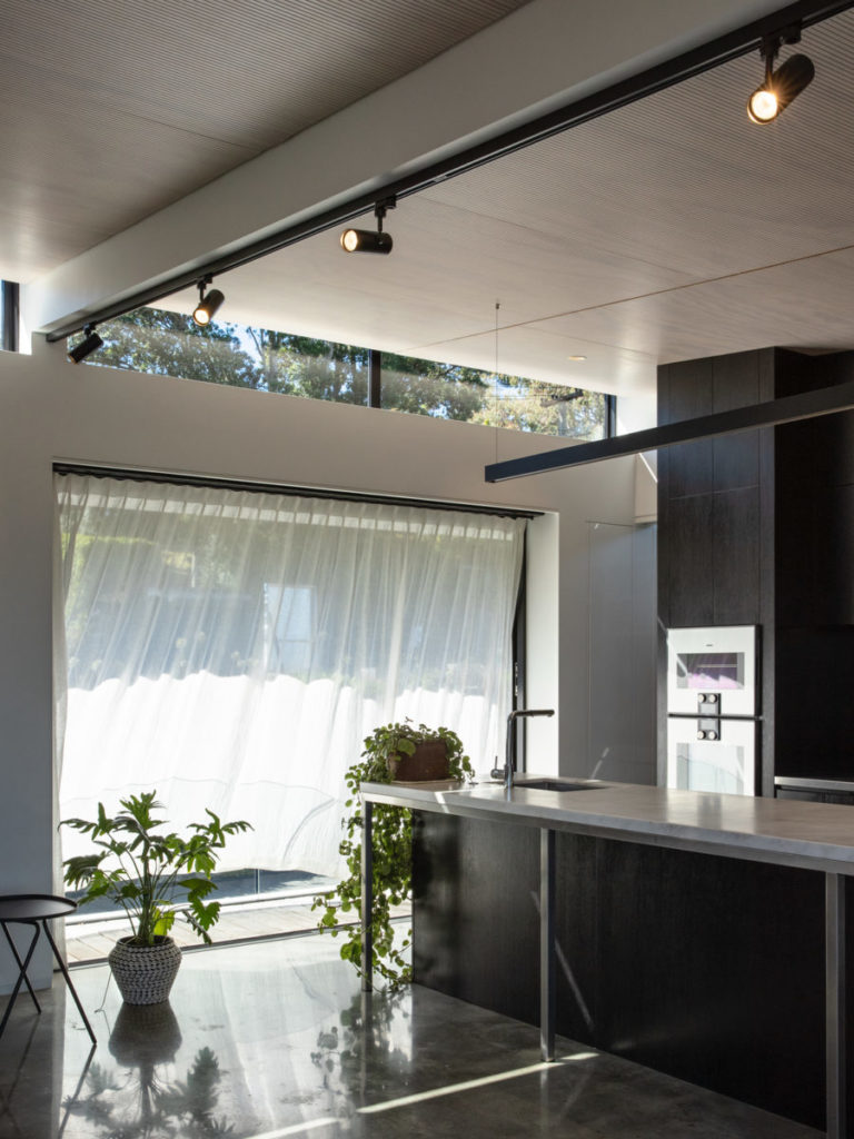Inside the home, polished concrete floors are tinted with Peter Fell ‘Superblack’ – the darkest available concrete tint on the market. The look is minimalist and clean, but also practical. The dark floors attract winter sun, creating a heat sink that stores energy during the day, releasing warmth at night as the home cools. The home is proof positive that good design needs little augmentation.