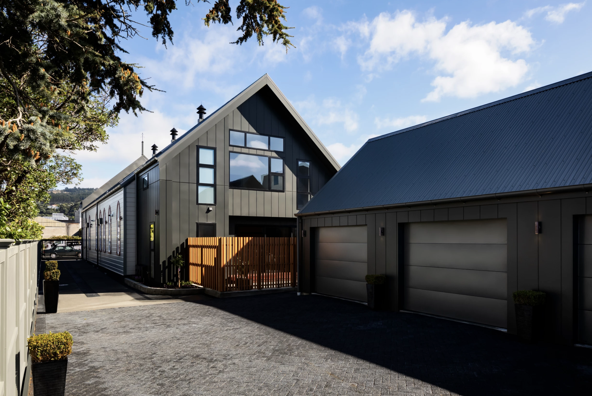 Room to play with materials and colour was allowed on the rear of the building, as an extension of a heritage project must read as ‘new’. Here, James Hardie Stria cladding was chosen, painted in Aalto Freehold from the New Zealand Historic Colours range.