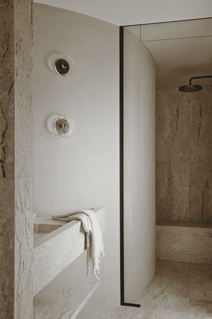 Material palettes play a defining role in these wellness-led spaces. Rather than glossy surfaces or overtly polished finishes, many designers are favouring tactile, natural materials that introduce warmth and sensory depth.