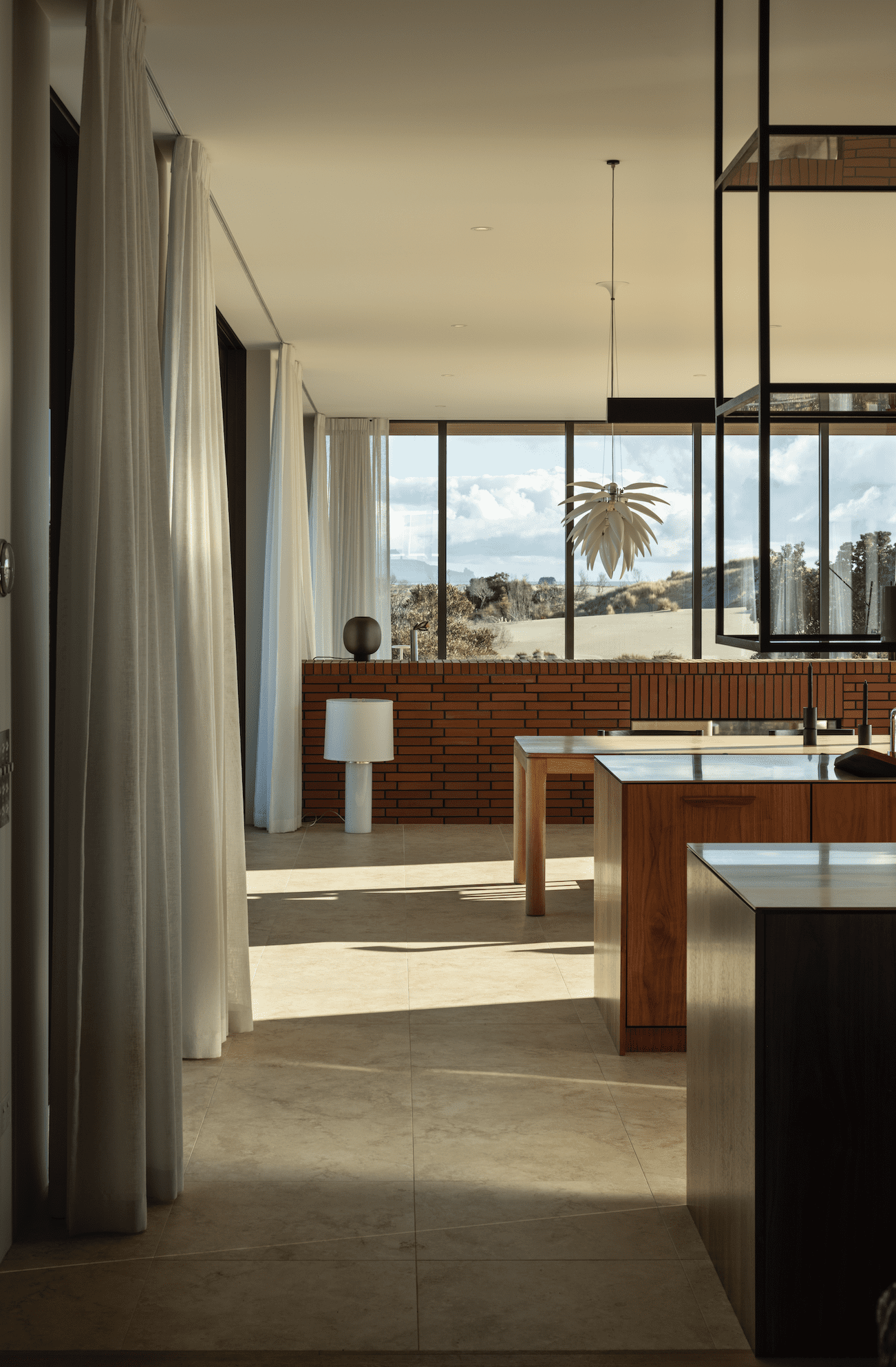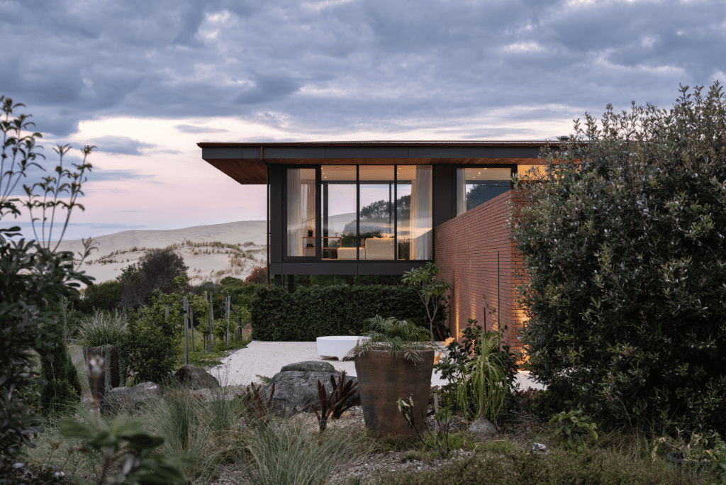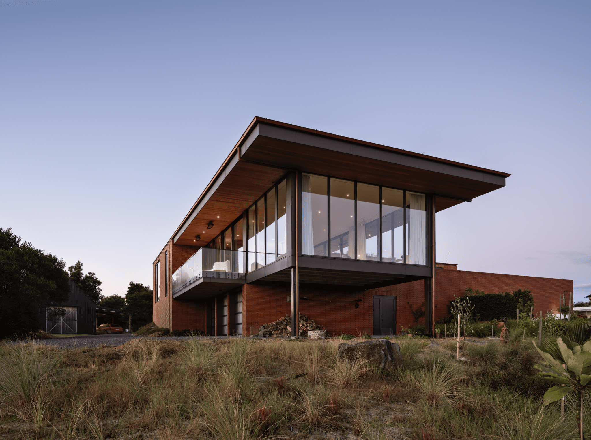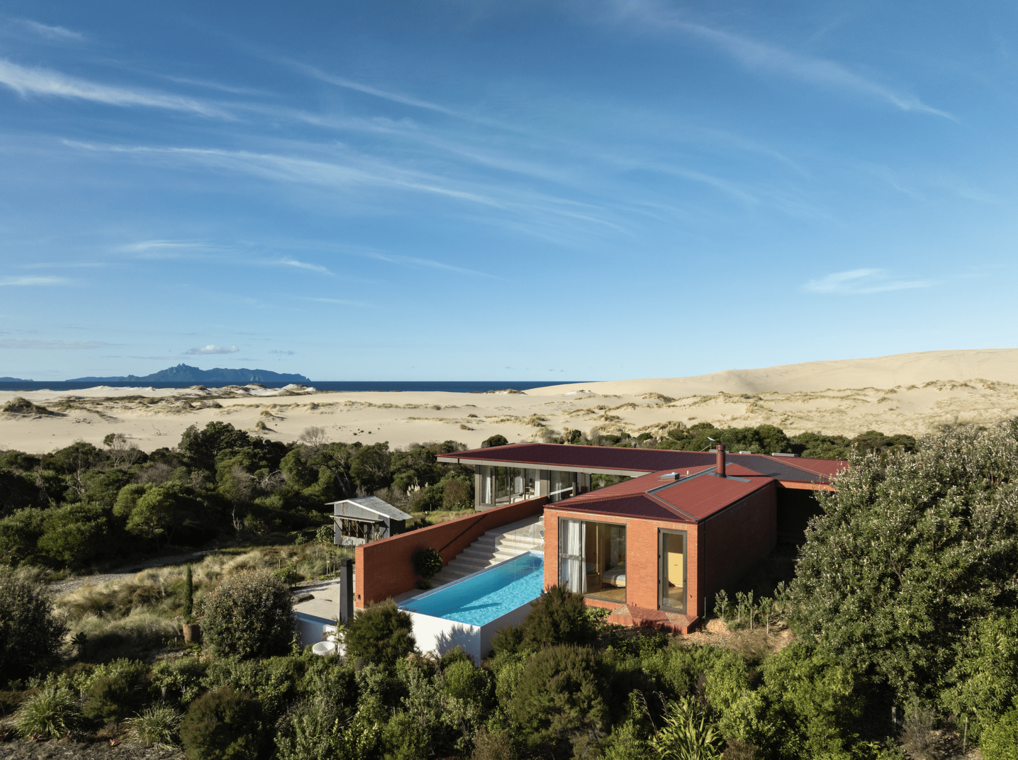 Danish modernism, Kiwi nostalgia, and a touch of grandeur converge on a one-of-a-kind site in Mangawhai, where a home of red brick and glass is dwarfed by an undulating dunescape.
