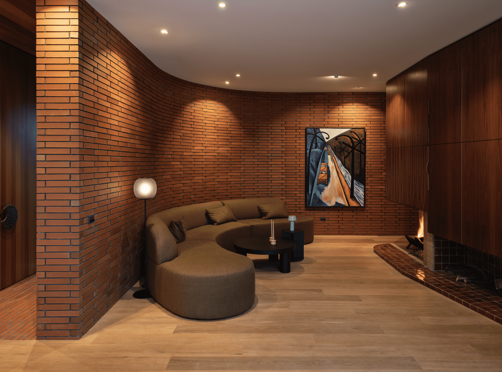 In opposition to this openness, the second living area is tucked into the curve of a brick wall, enclosed and intimate — separate but not secluded. In summer, it’s a cool, shady respite; in winter, with the fire roaring, it’s cosy and warm, hunkered into the depths of the house.