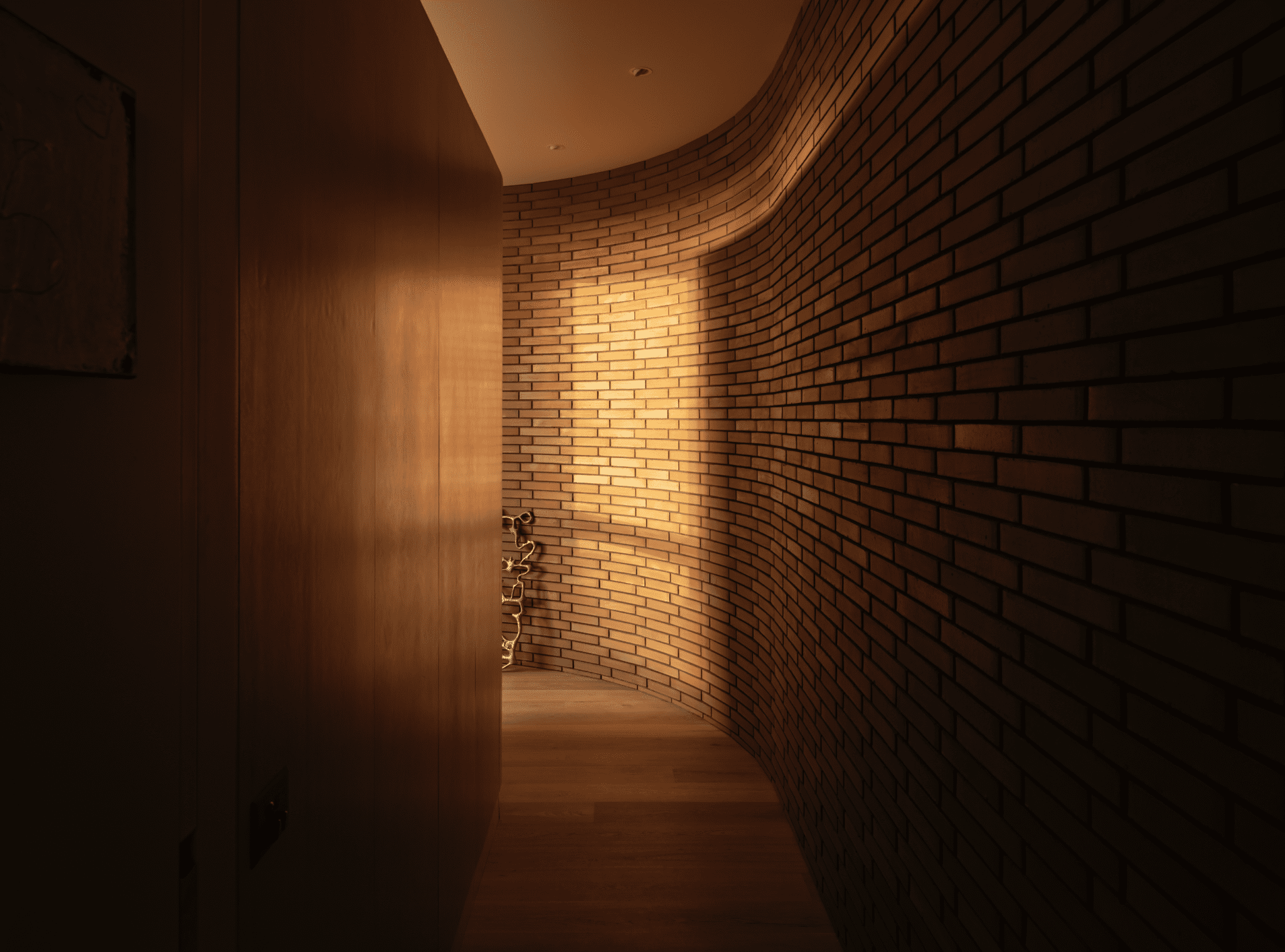 The red brick continues inside, where it meets a simple palette of timber, glass, and travertine. The entry foyer is compressed, with brick on both sides and underfoot.