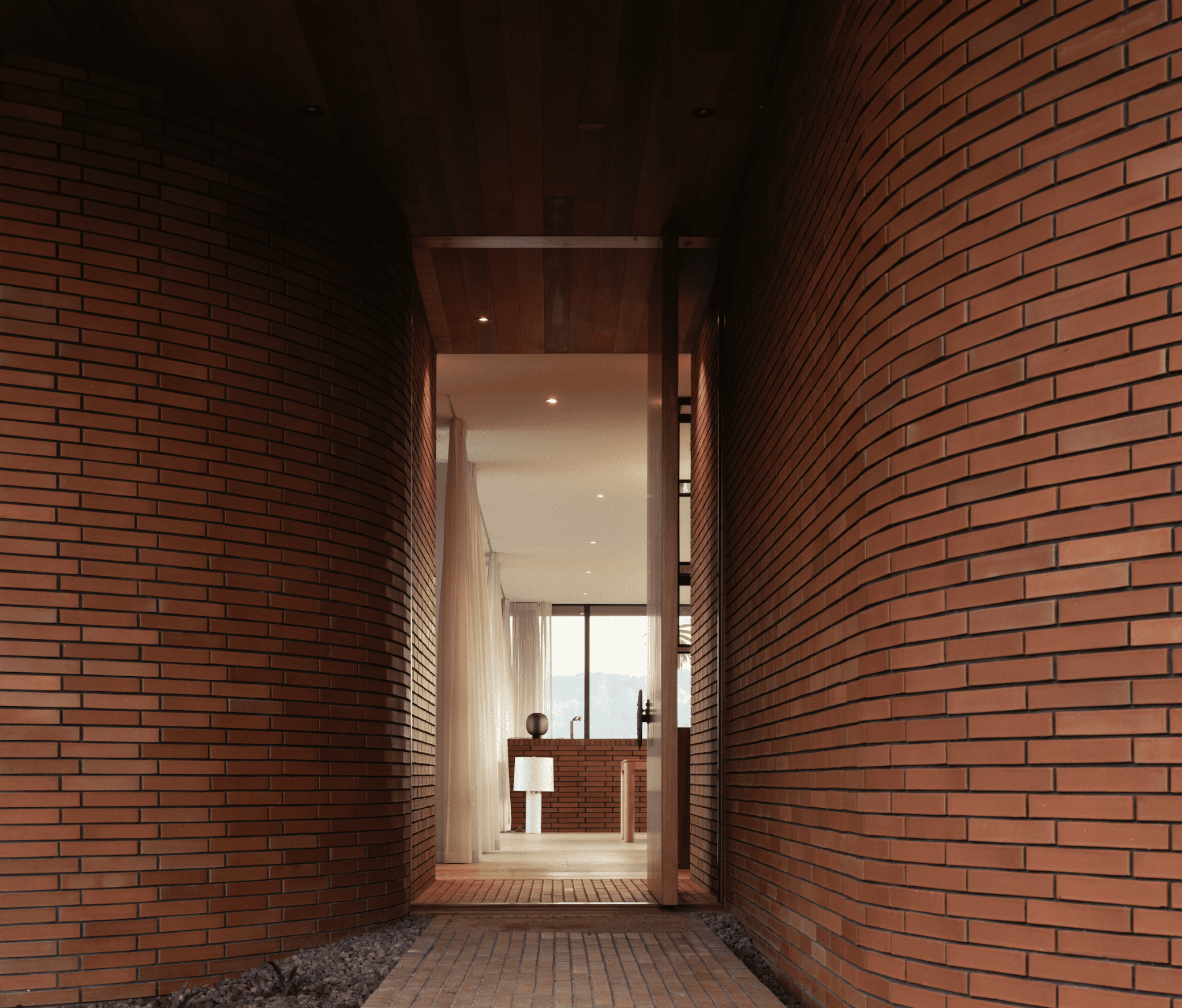 From the street, two brick walls curve inwards, drawing the visitor towards a large cedar-clad door sunken into the form.