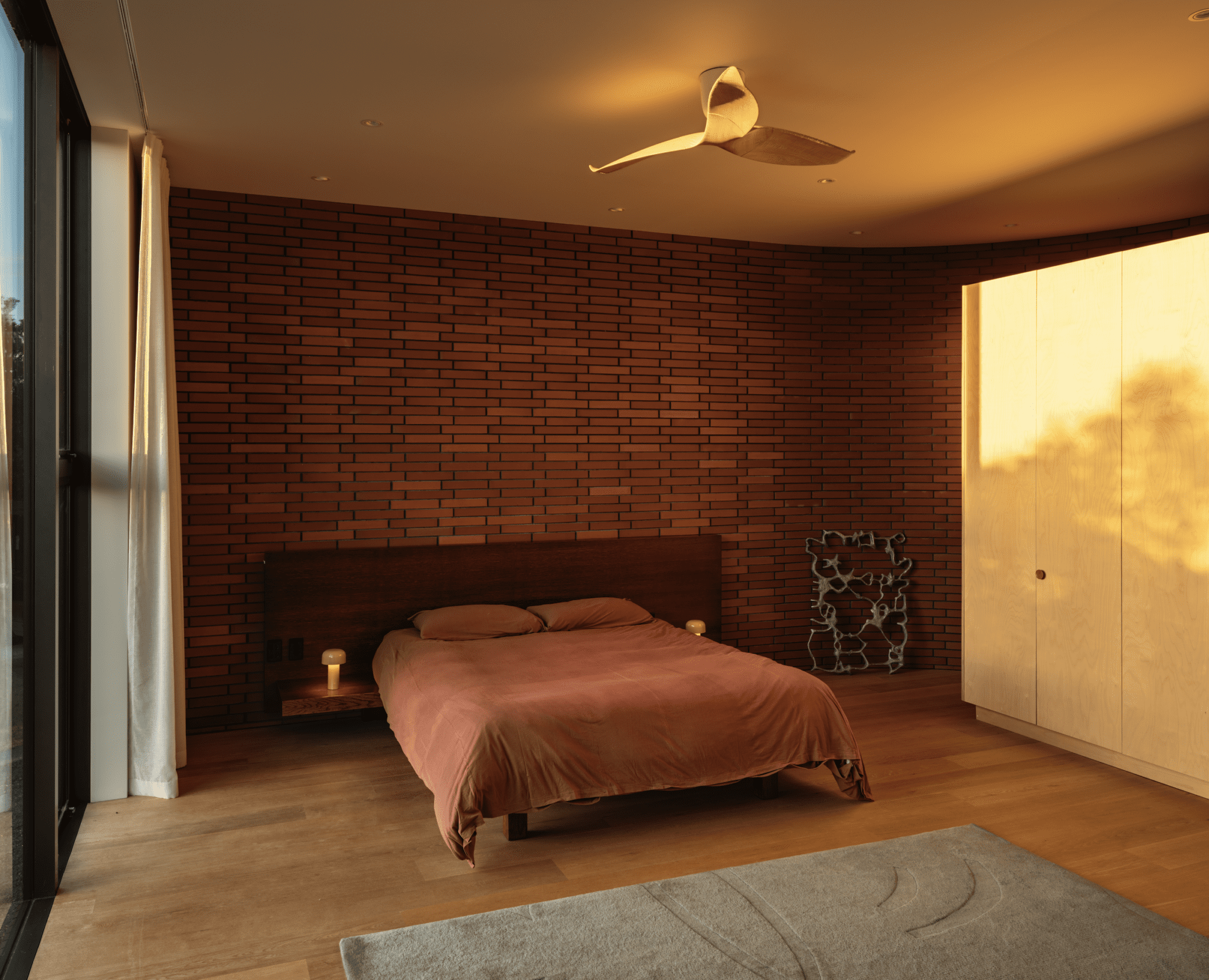 “The curved, natural texture of brick softens the modernist lines of the form, and the glass pavilion provides an expansive counterpoint to the sheltered, cosy sleeping spaces.”