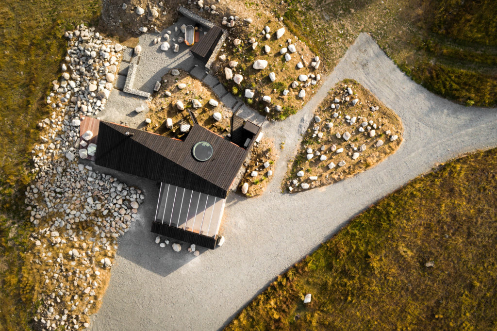 From above, the cabin and boulder-strewn landscaping appear almost other-worldly but from ground level they offer a different perspective — a certain permanence in a harsh environment. Used to create a plinth on which the cabin perches, the rocks are intentionally permeated with native grasses, allowing the building to nestle gently into the land, and provide an additional layer of connection between the vast skies, the folded form of the cabin, and the tussock-covered flats.