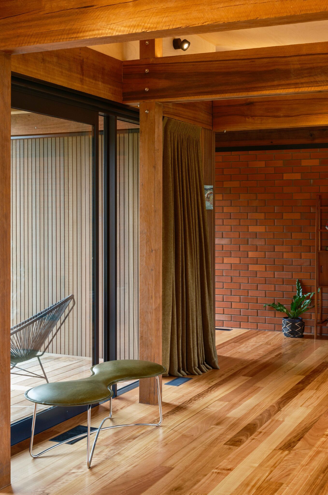 Paula and Stu, a draughtsperson and land surveyor respectively, revelled in the construction process and sourced greenheart timber from a local merchant for the beams, which span nine metres. It’s a glorious rustic hardwood often used in bridges and wharves. “During the build, the beams were exposed for a while and had silvered off. We water-blasted them to peel back to the original colour,” explains Stu.
