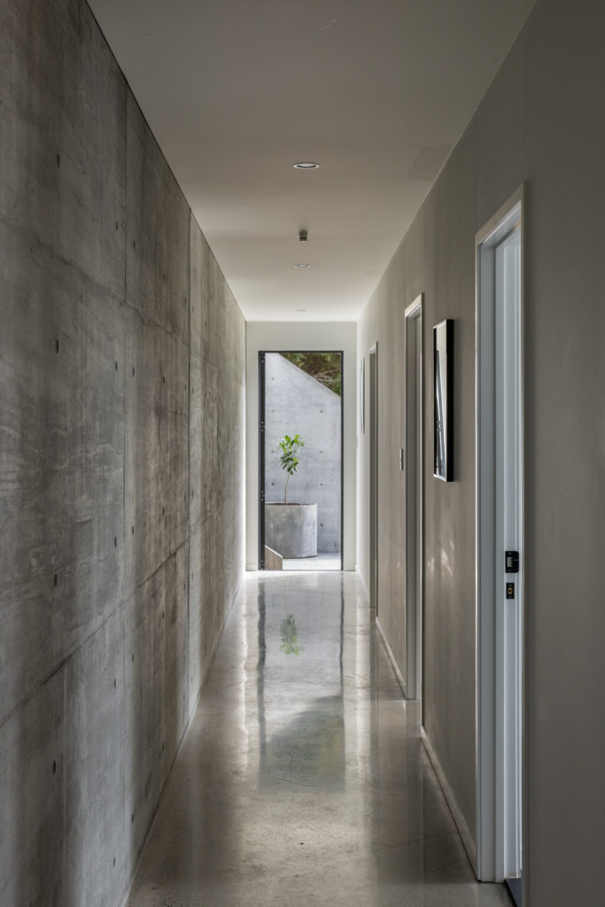 A polished concrete floor on this level adds another textural element, juxtaposing the rougher finish of the in-situ concrete wall. The kitchen is located at the western end of the open-plan living area, defined by timber cabinetry. Behind, two further bedrooms draw dappled light in from the north to a central hallway leading to a back porch. Upstairs, in the canopy of the home, skylights ensure the main bedroom and nursery are bathed in light.
