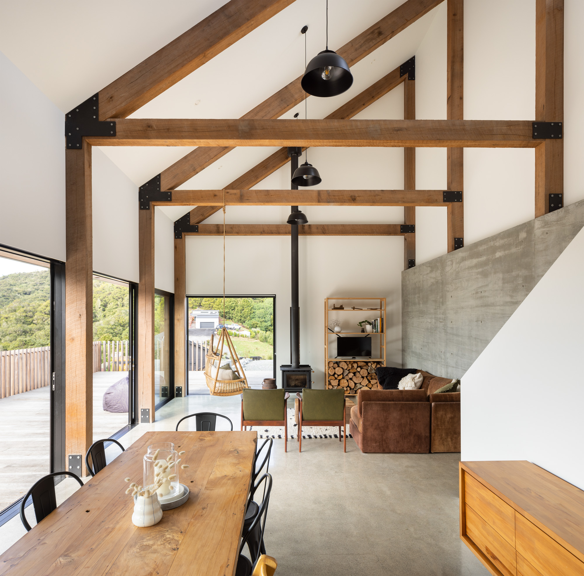 Soft leather sofas are placed around a woodburner, while a low hanging chair, swinging in the breeze when the doors are open, gently obscures the view.