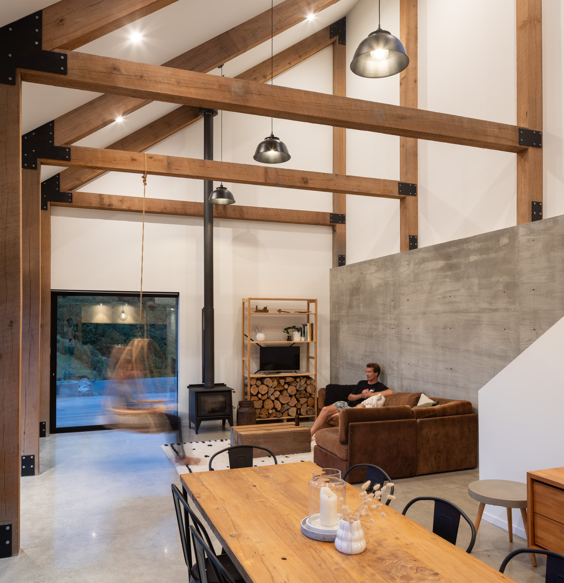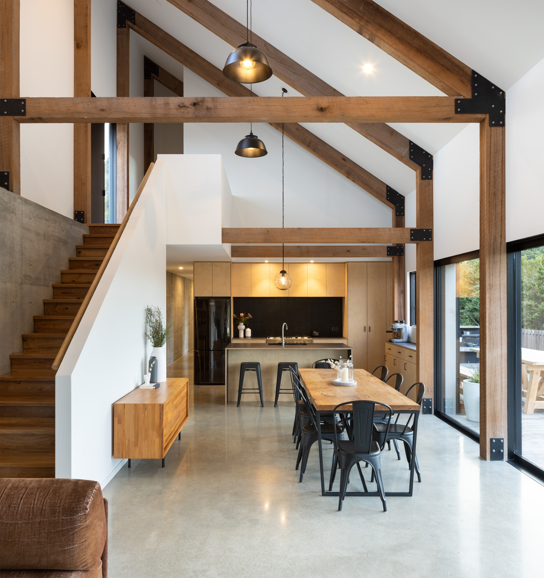 Having an exposed structure was important to the aesthetic they were trying to achieve, and they did extensive research on trusses, LVL beams, and portal frames before landing on hardwood. Rough sawn greenheart was specified because of the natural finish and warmth, and its strength meant they could span from the ground floor to the rafters.