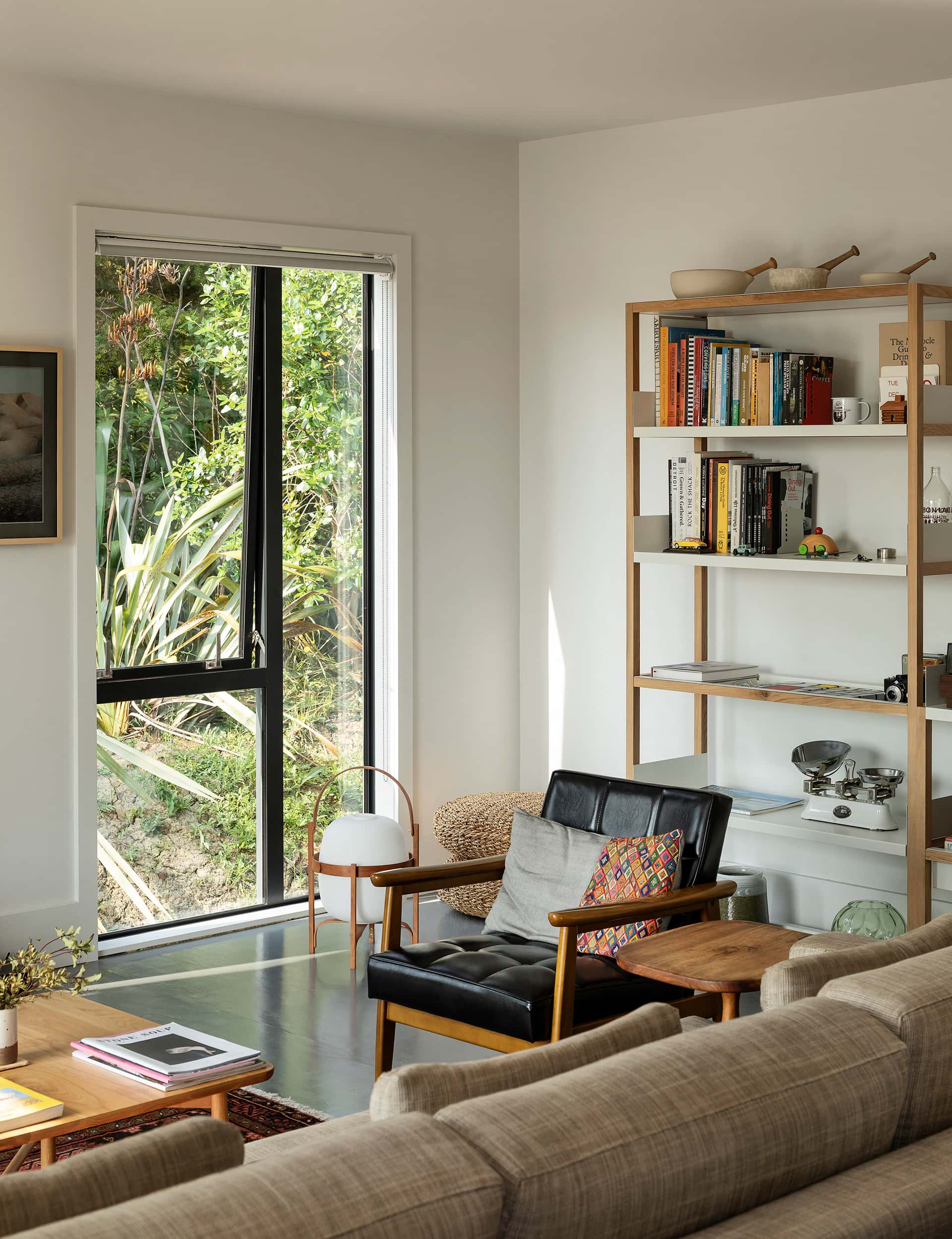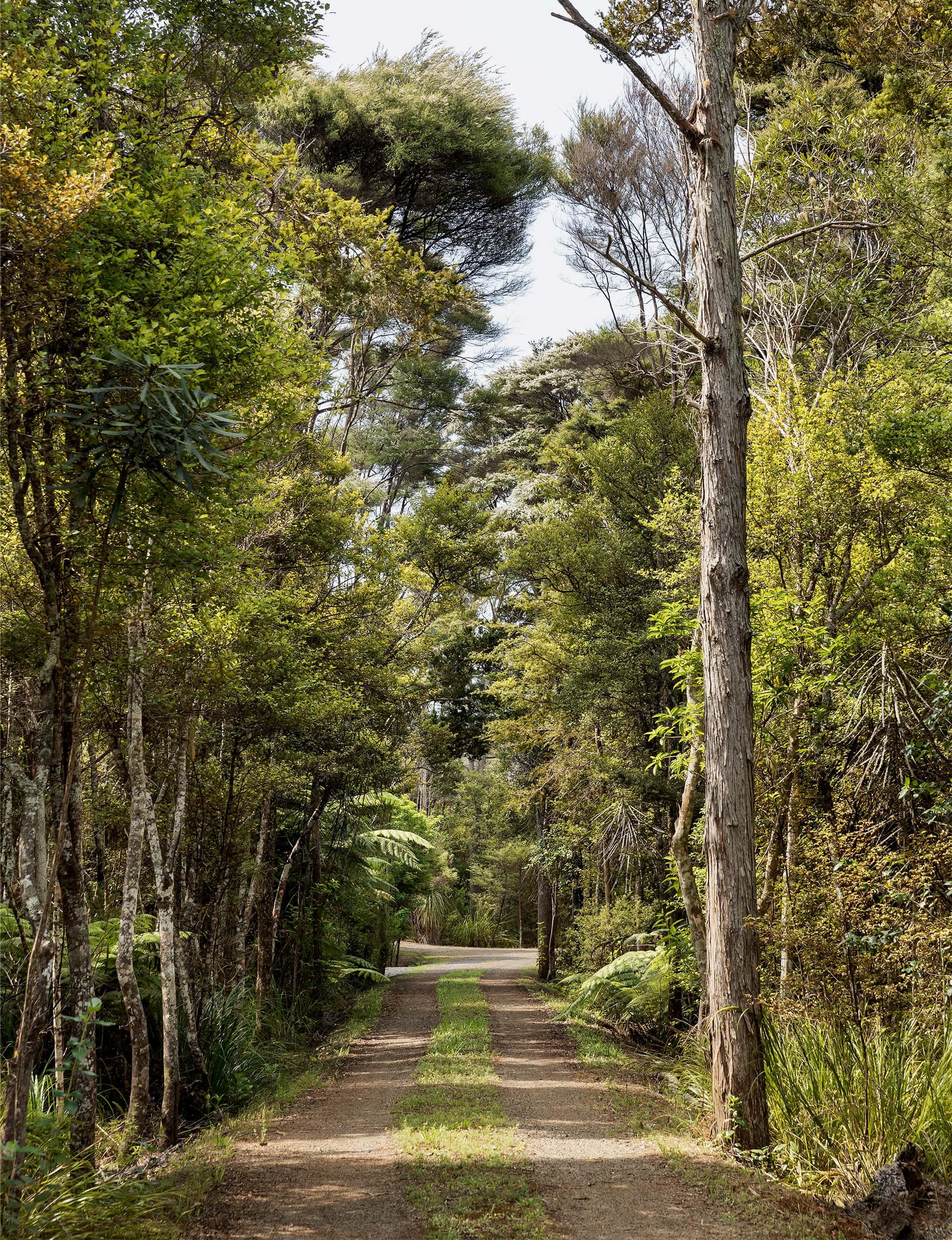 Aaron Paterson For the exterior, we used shiplap cladding from Abodo, a New Zealand-owned company that makes sustainably grown, thermally modified timber that’s perfect for harsh environments like Pahi. The roof is a classic dark-green metal profile, and aluminium joinery is nice if you get the proportions right. For the interior, we used painted plywood floors that gives texture without breaking the bank. Ubiquitous plasterboard kept the cost down. We need to give a shout-out to nature for being awesome; we didn’t want to spoil the entry vibe with a concrete driveway, so we went with local gravel.