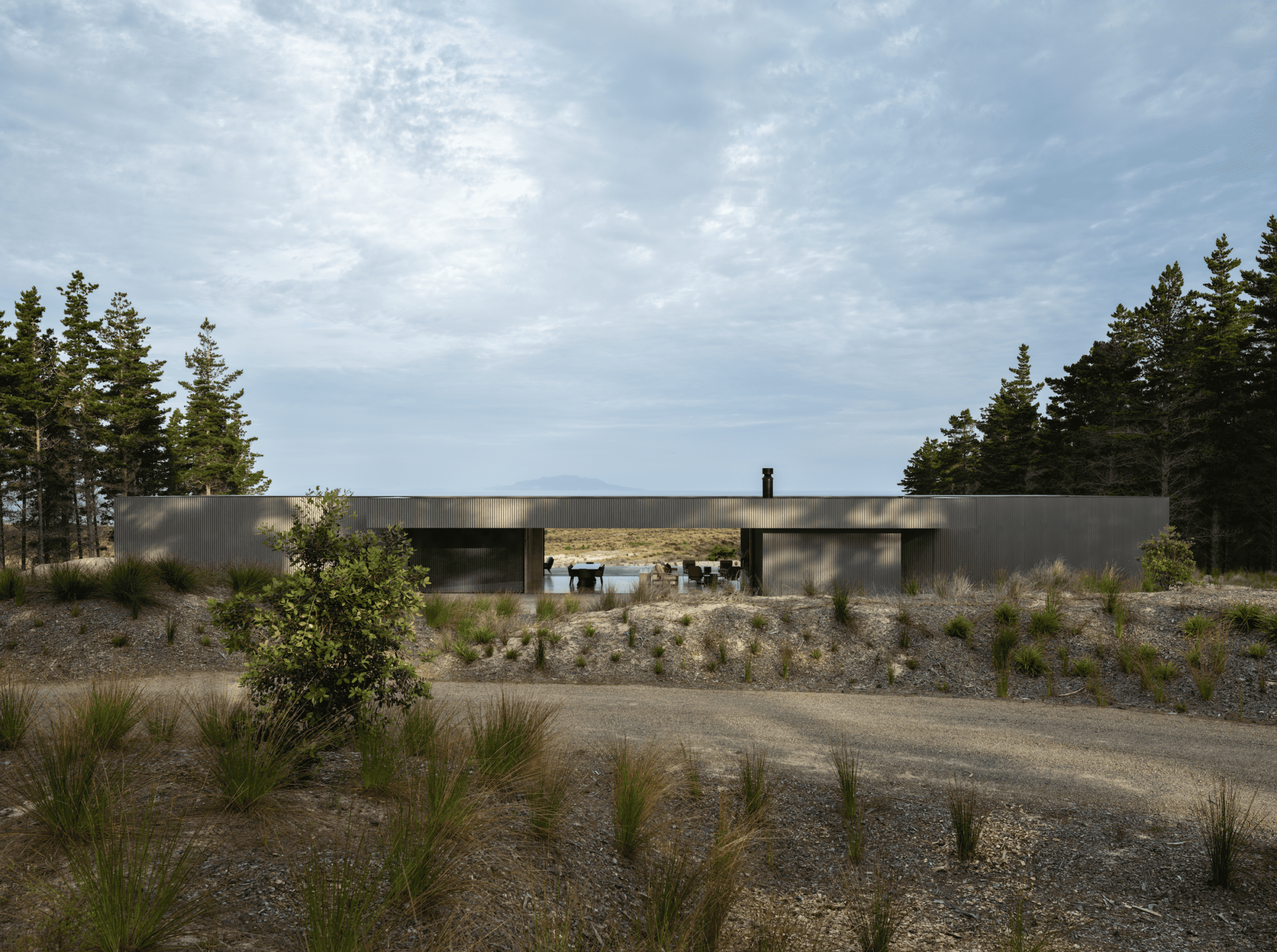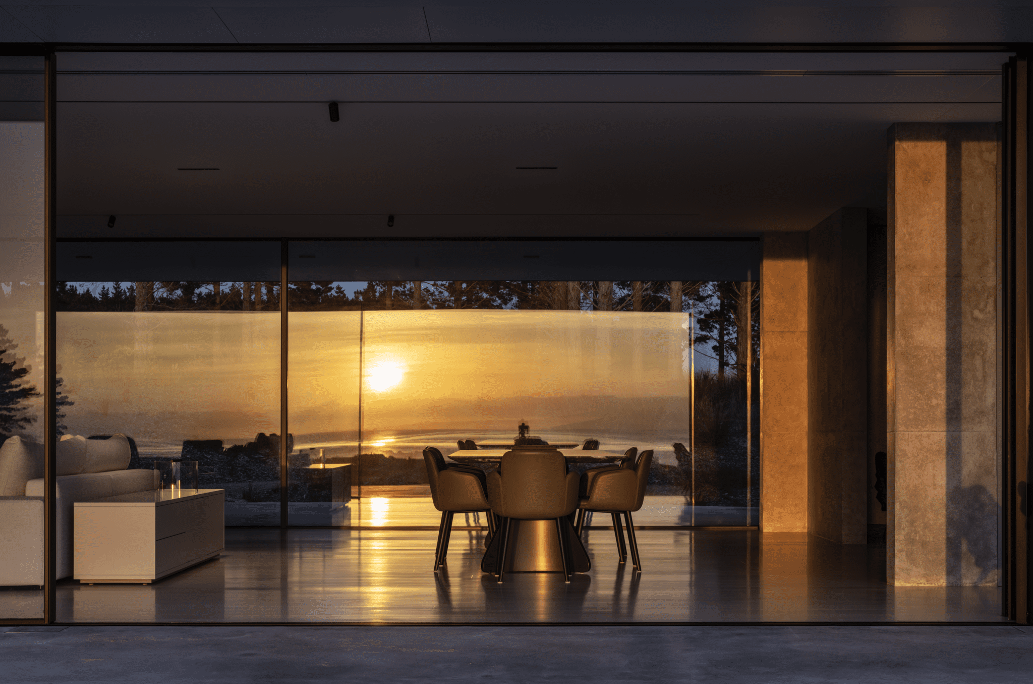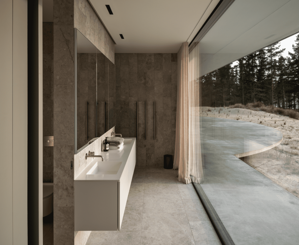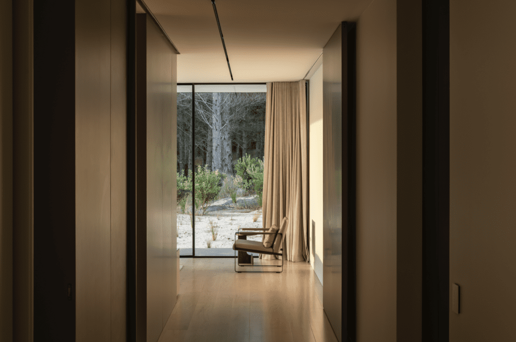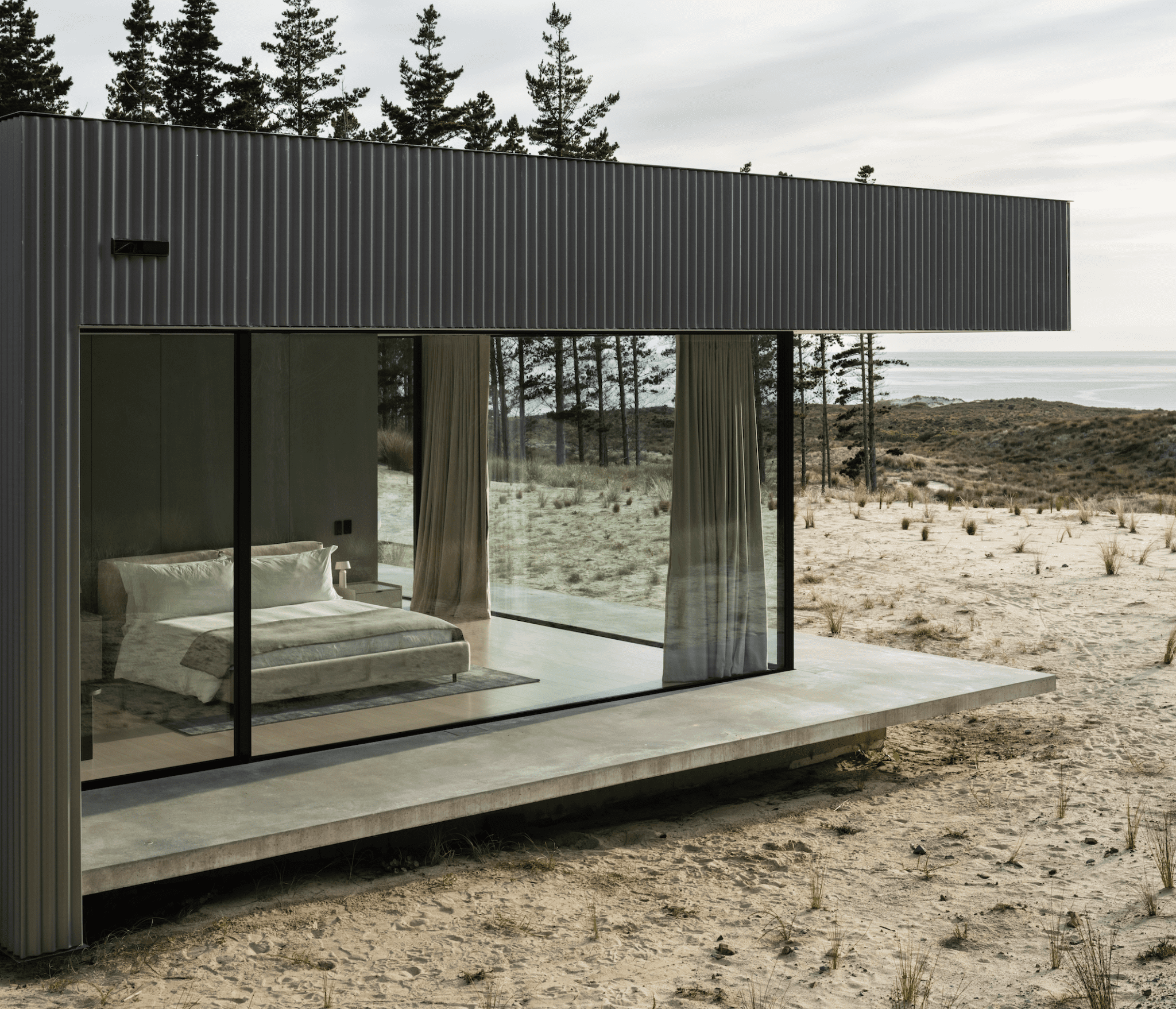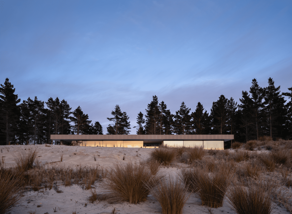 Yet behind this deceptive simplicity is an astounding level of detailing. There is a sleek craftsmanship at play here that is somehow reminiscent of automotive design. The perfectly folded, corrugated zinc on the exterior corners, the heavy-duty, blue-tinged glazing, and the concrete all lend it a muscularity, a kind of robustness that would be cold and unwelcoming were it not for the desert-like surroundings, the stunning sea, and the nearby forest, which balance the whole thing out.