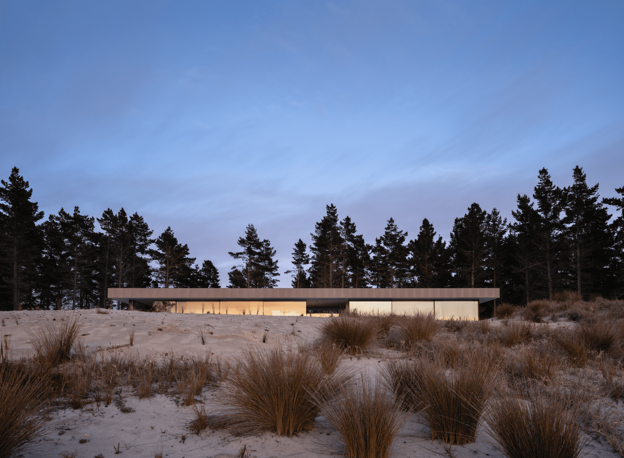The curvature of the dunes conceals most of the lower half of this beach house from the road. The linearity of the corrugated roof form glints slightly like some mysterious flying object that has landed firmly on the shore.