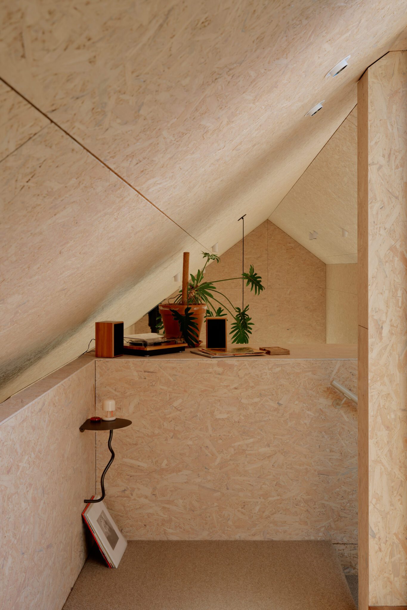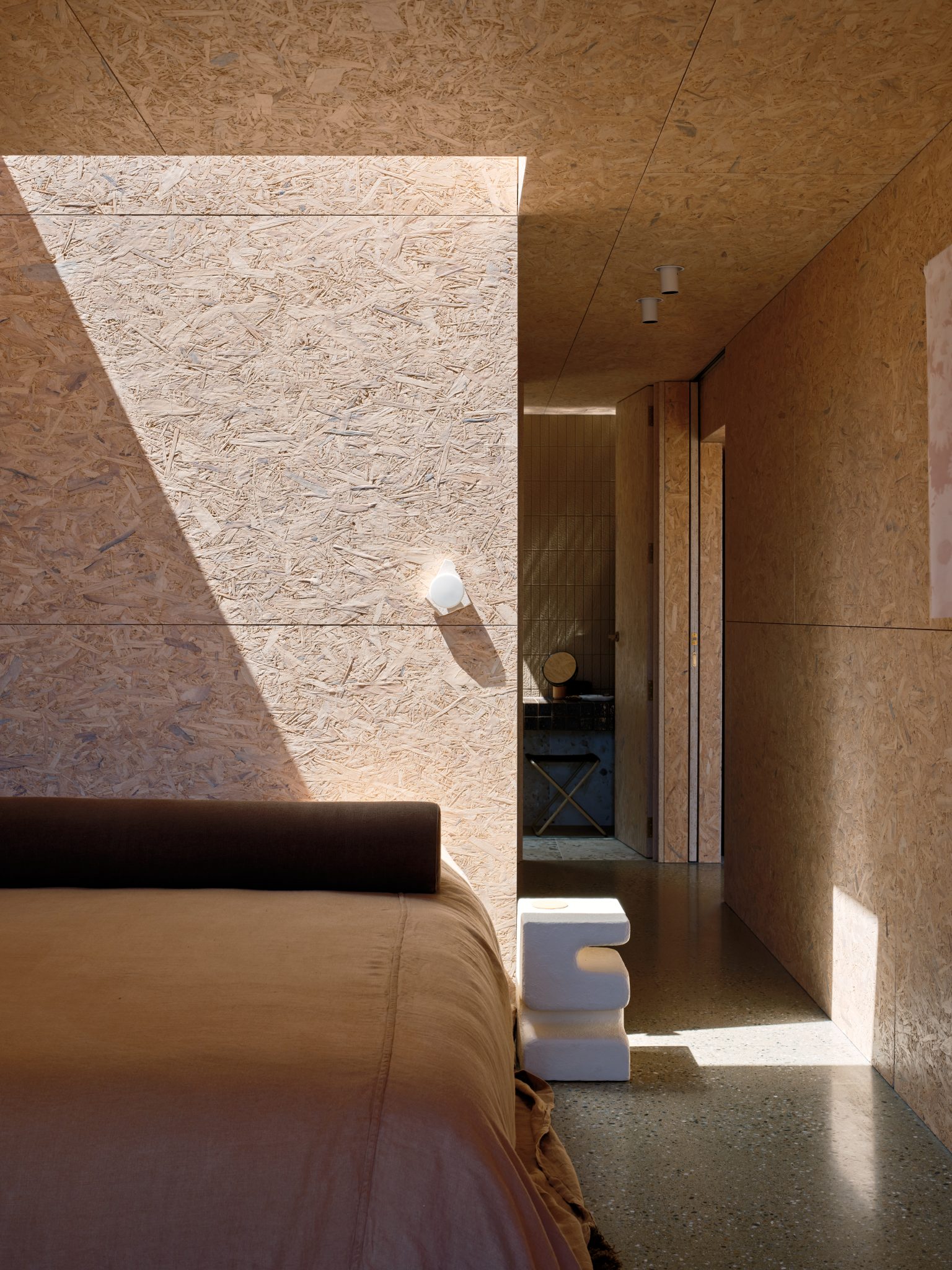 Strand board can often come with a rather yellowish, sometimes orange tinge due both to its raw (usually yellow pine) material and the glues used to keep the thing together. “So … we had to desaturate it,” says the designer, “there was a lot of trial and error with testing different shades of white into a polyurethane mix. We ended up with a 20-part polyurethane to a one-part, slightly beige-toned Dulux white.”