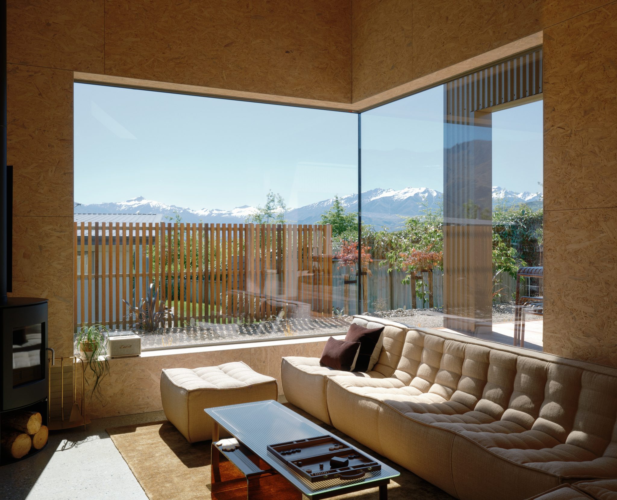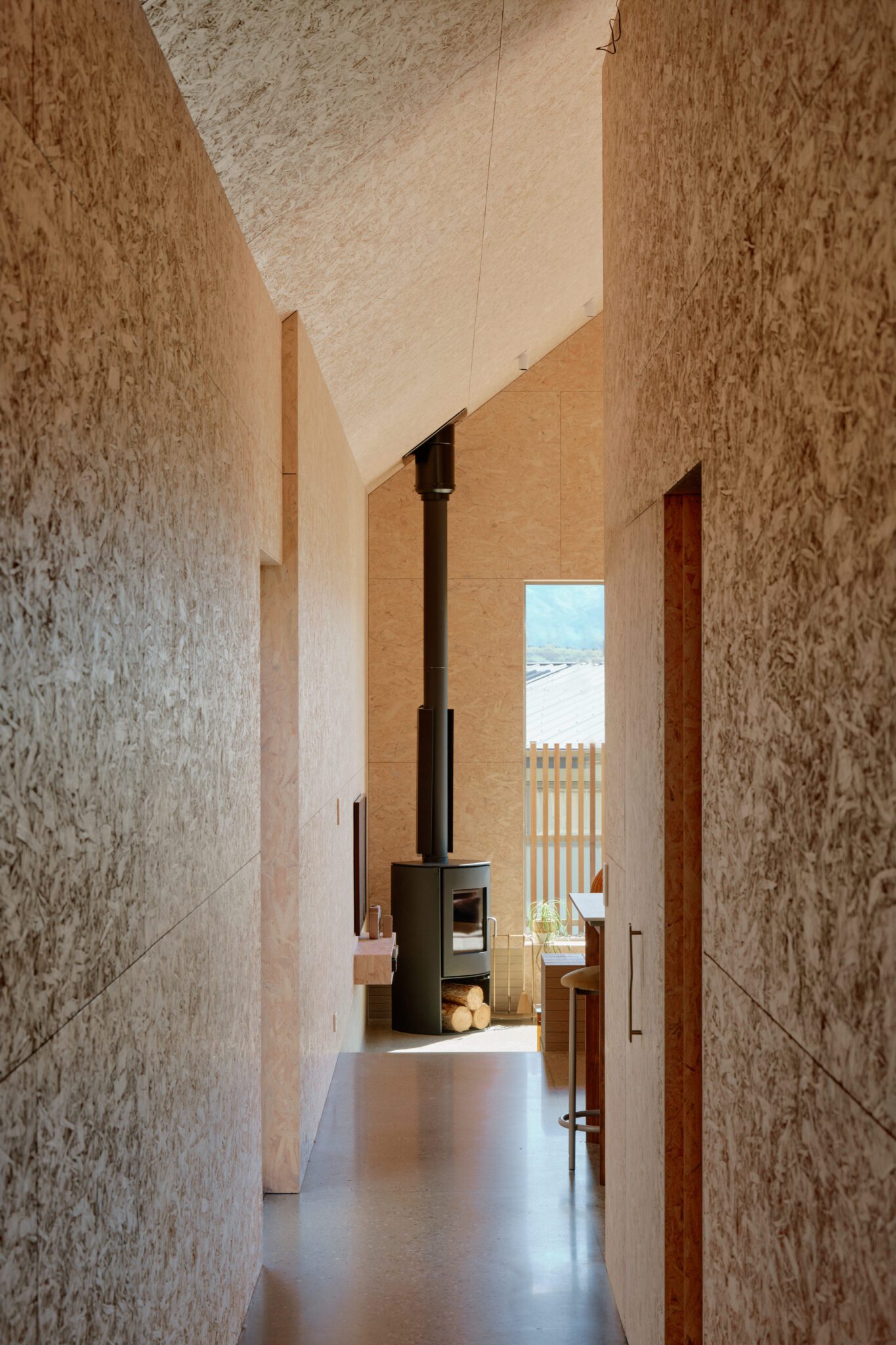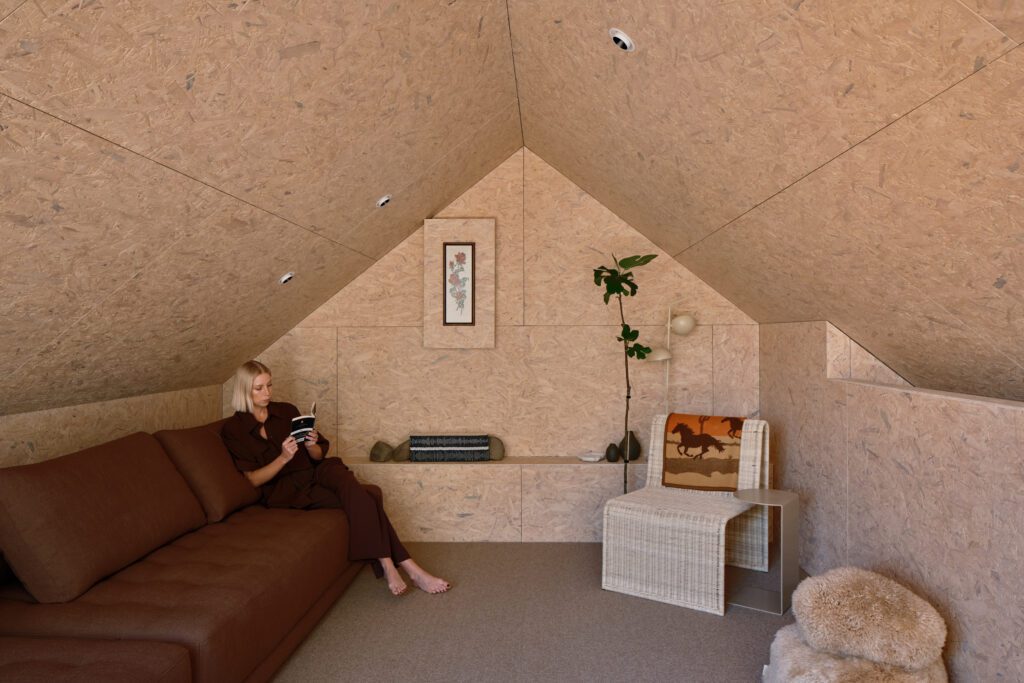The richness of sunlight diffusing on the OSB creates a beautiful touch on this textural interior while a restrained, tactile palette inspired by Wānaka — muted greens, earthy browns, and golden hues — shifts with the light.