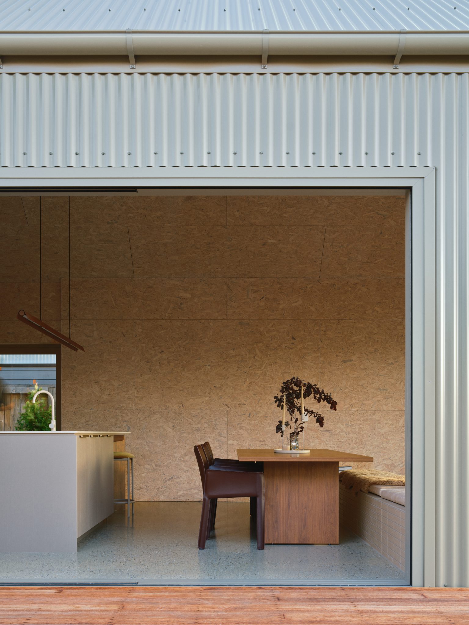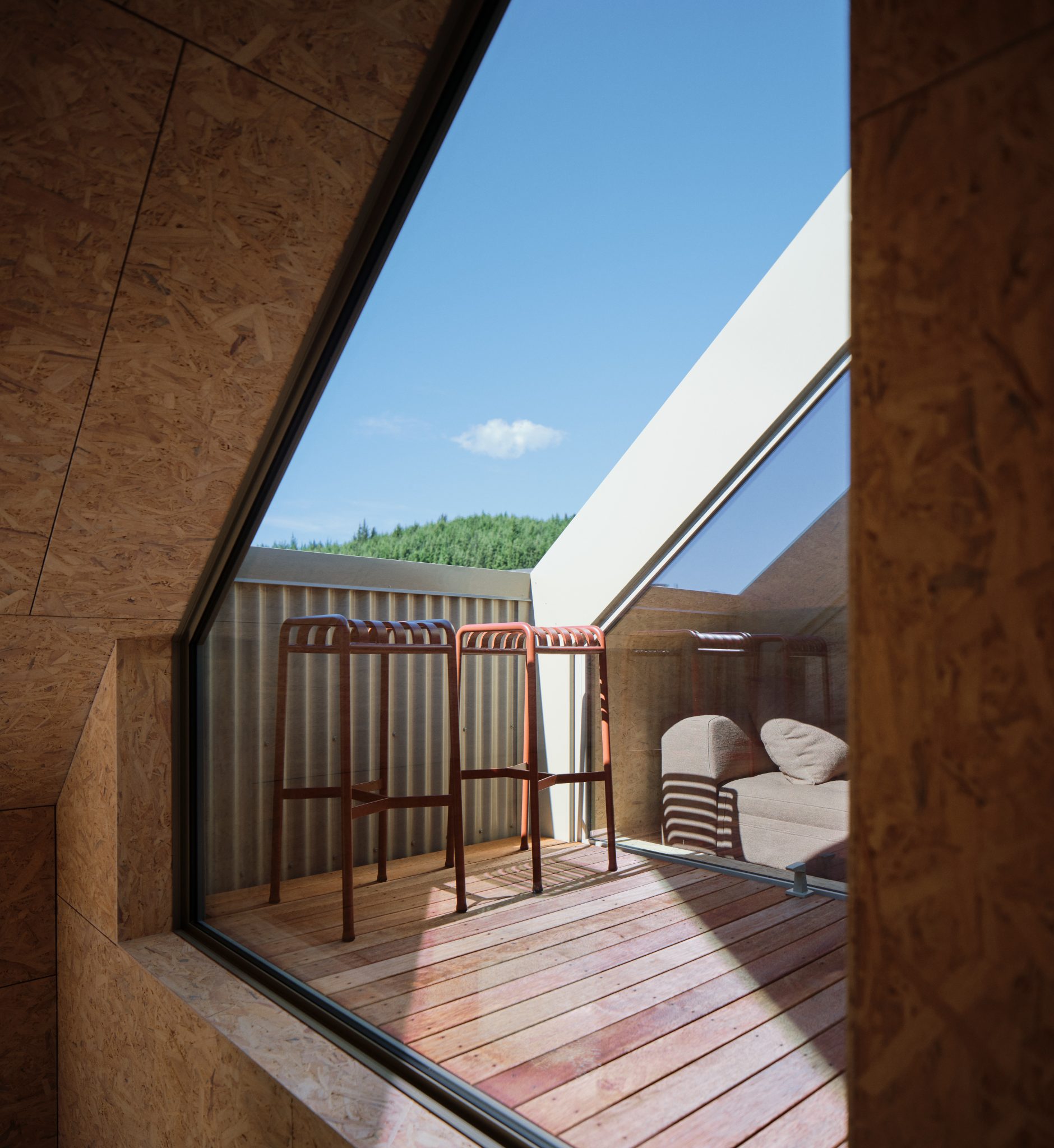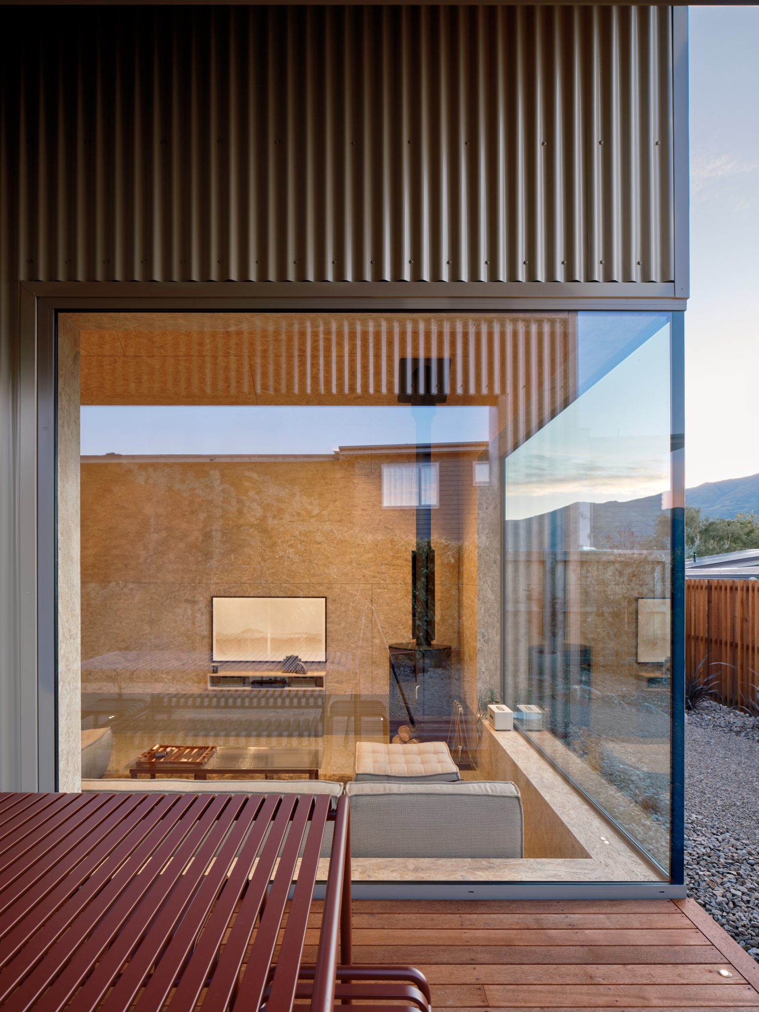 The richness of sunlight diffusing on the OSB creates a beautiful touch on this textural interior while a restrained, tactile palette inspired by Wānaka — muted greens, earthy browns, and golden hues — shifts with the light.
