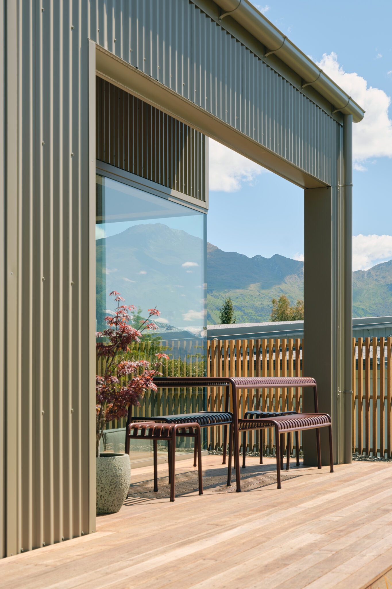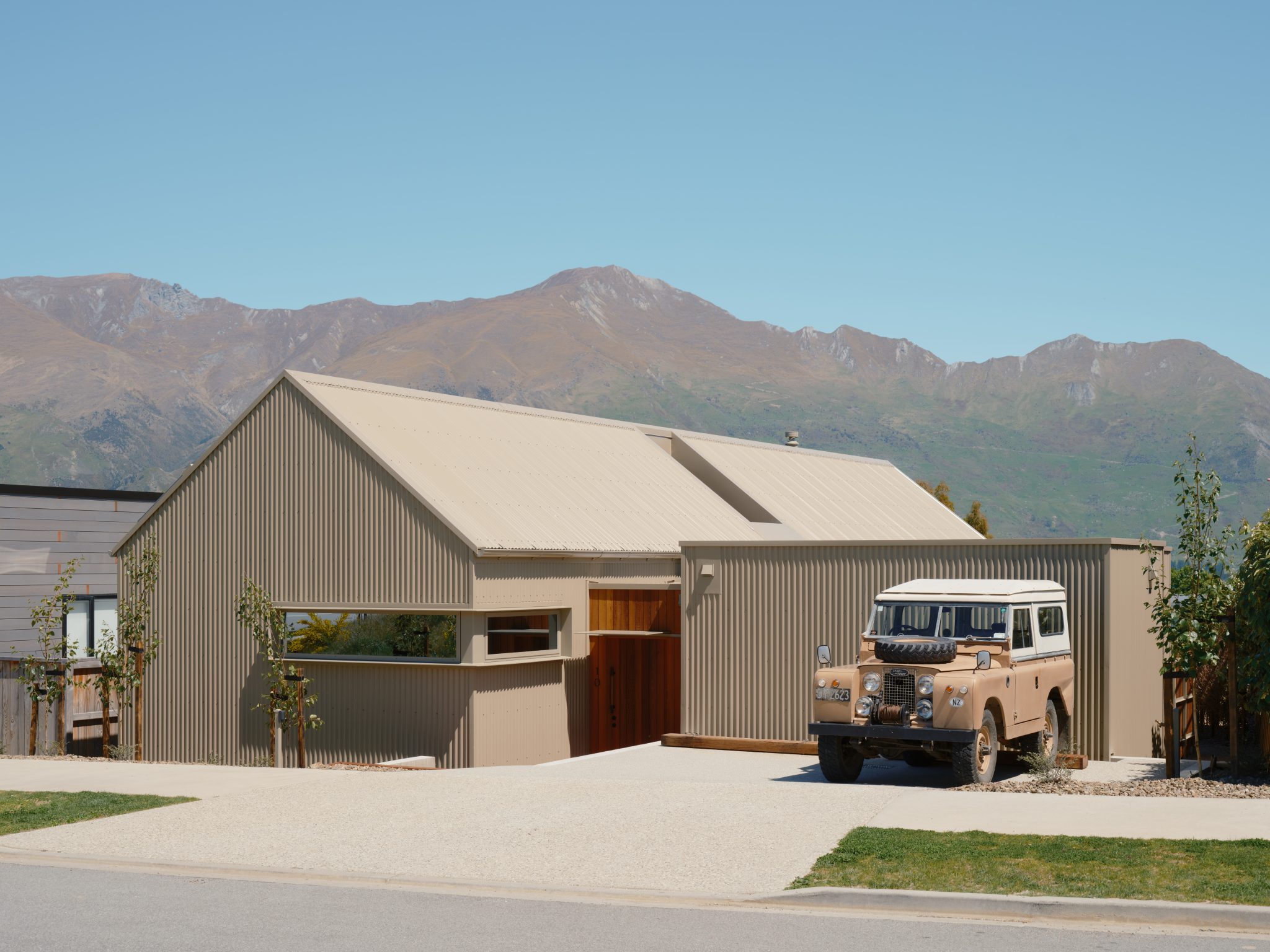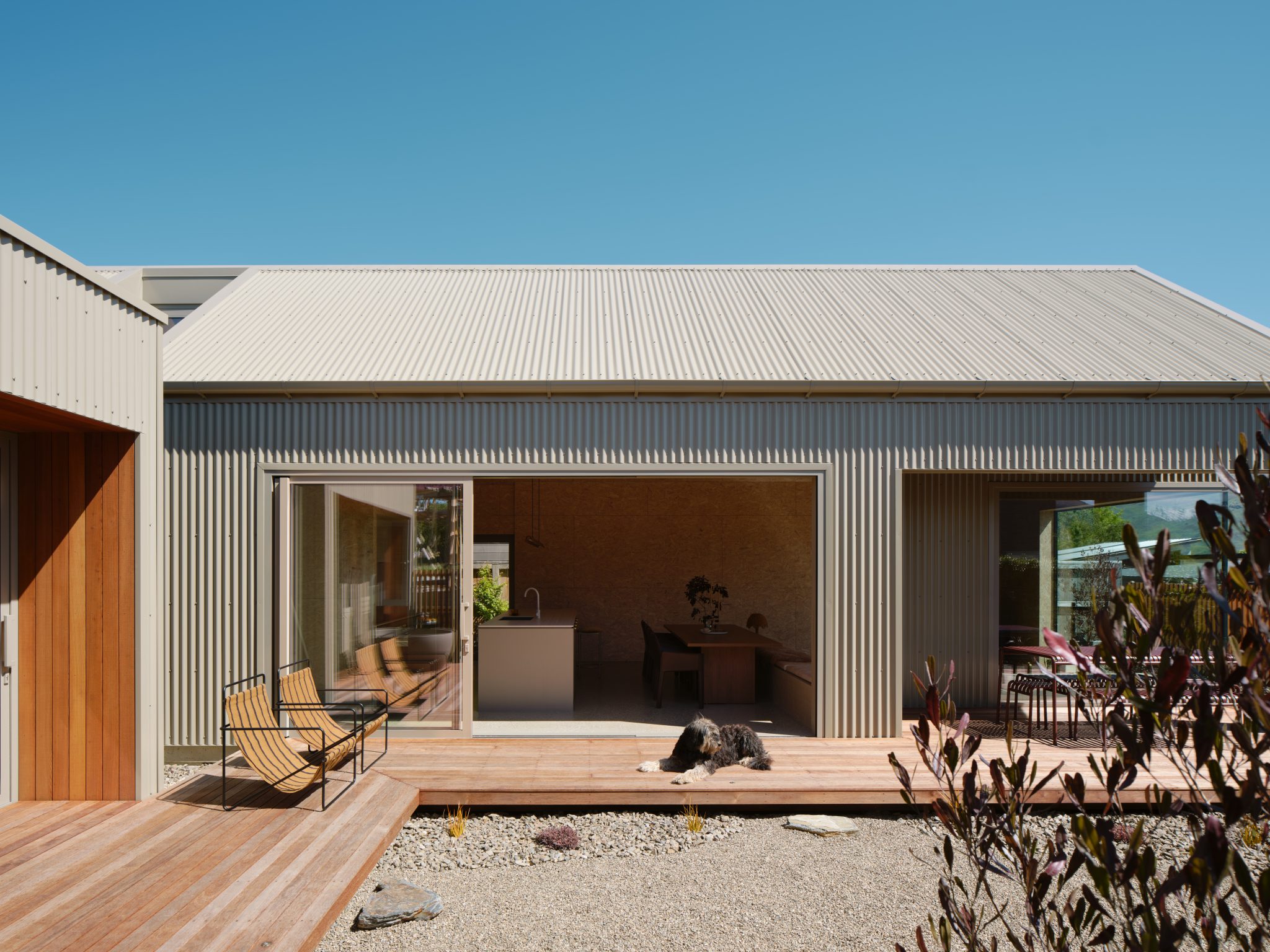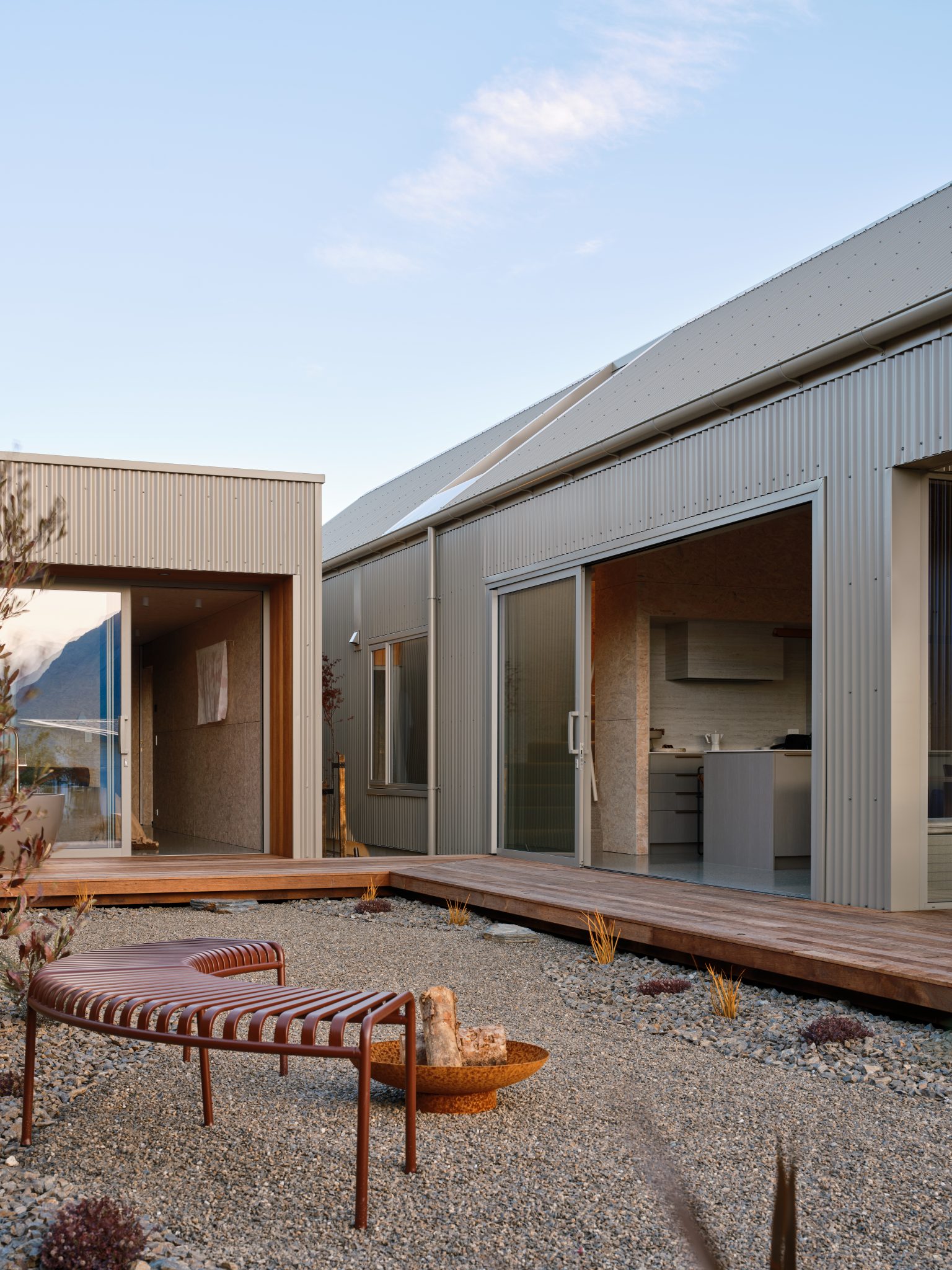 The architecture of this Wānaka house — a collaboration between the owner and interior designer Sophie Bowers (director of Sydney-based Strutt Studios), Intuitive Architects, and Owens Builders — is composed of three interconnected volumes, each responding to natural light, aspect, and function. It is clad in Lichen COLORSTEEL corrugate, blending agricultural references with modern execution.
