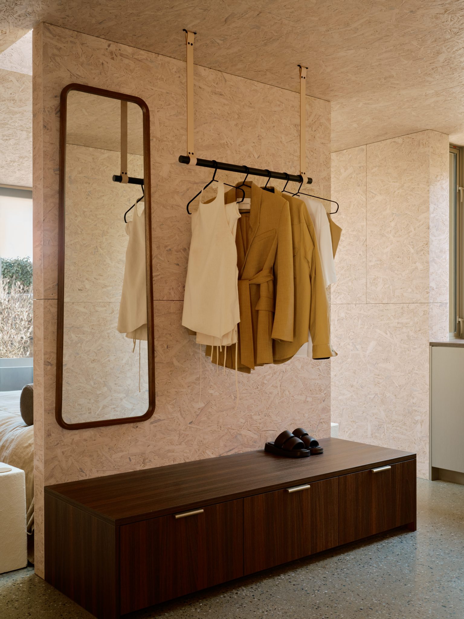 To complement the strongly textured personality of the engineered timber, the designers brought together an impressive number of surfaces and materials, lighting pieces and furnishings that popped rather than blended. The technique ensures the eye goes toward the details and that juxtaposition of the highly crafted against the industrial creates a tension that works beautifully here. It is about every object acting as a small, but succinct focal point with a strong design personality to elicit a pause and a moment of joy or calm. Something as simple as the clothes hanging rails have been highly considered and are made up of handcrafted, Italian leather straps that wrap around matt black-stained timber dowels.