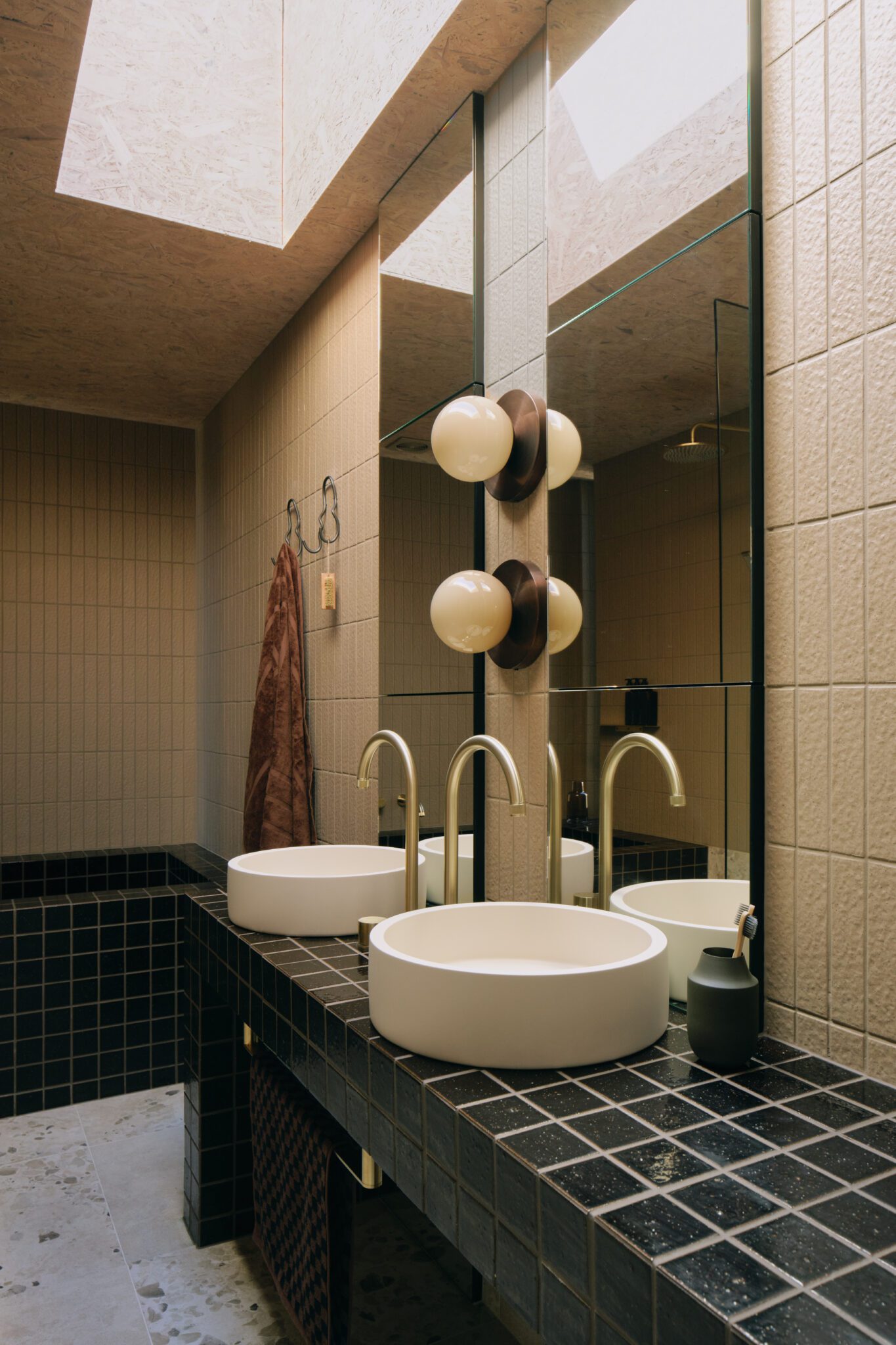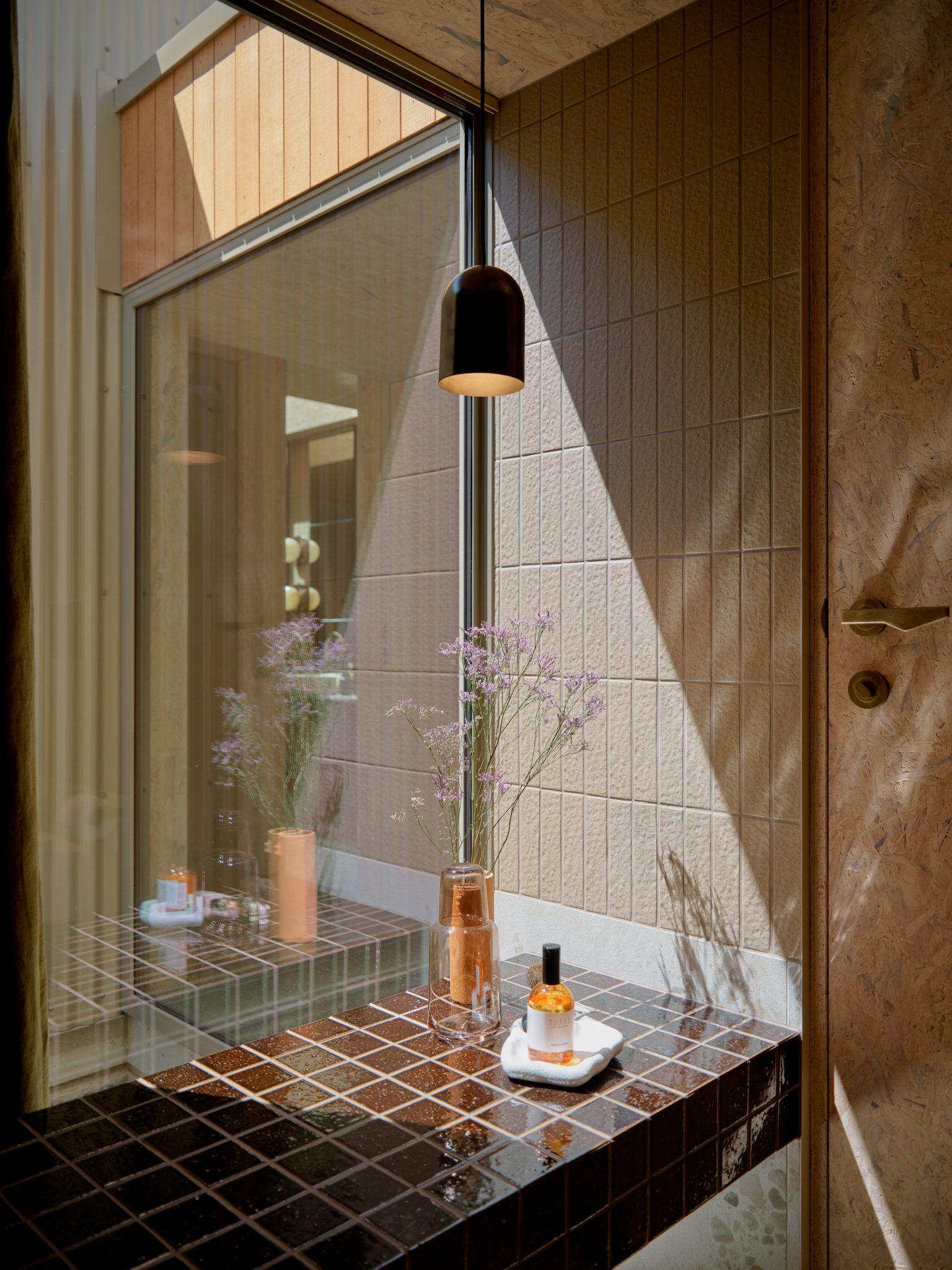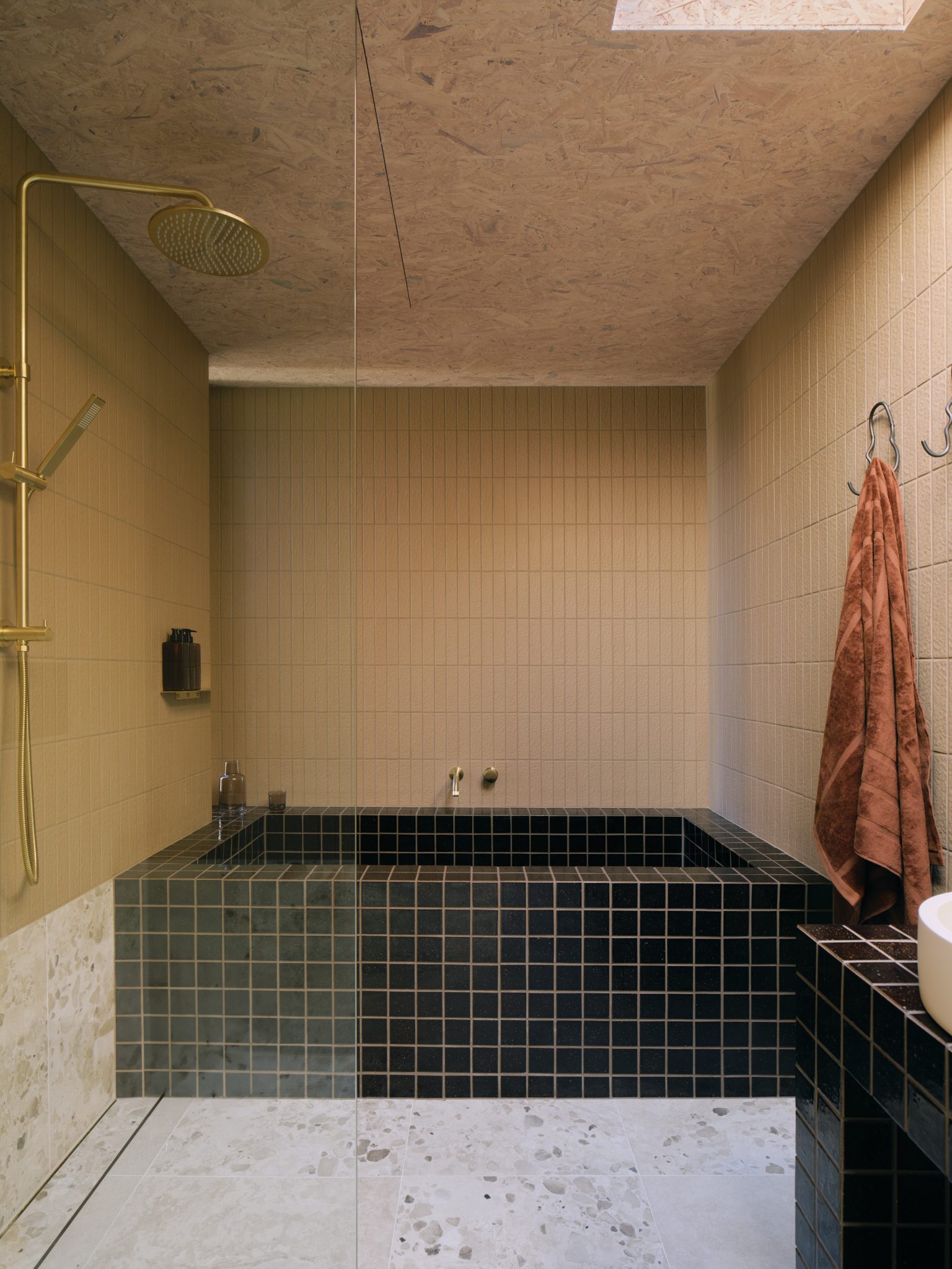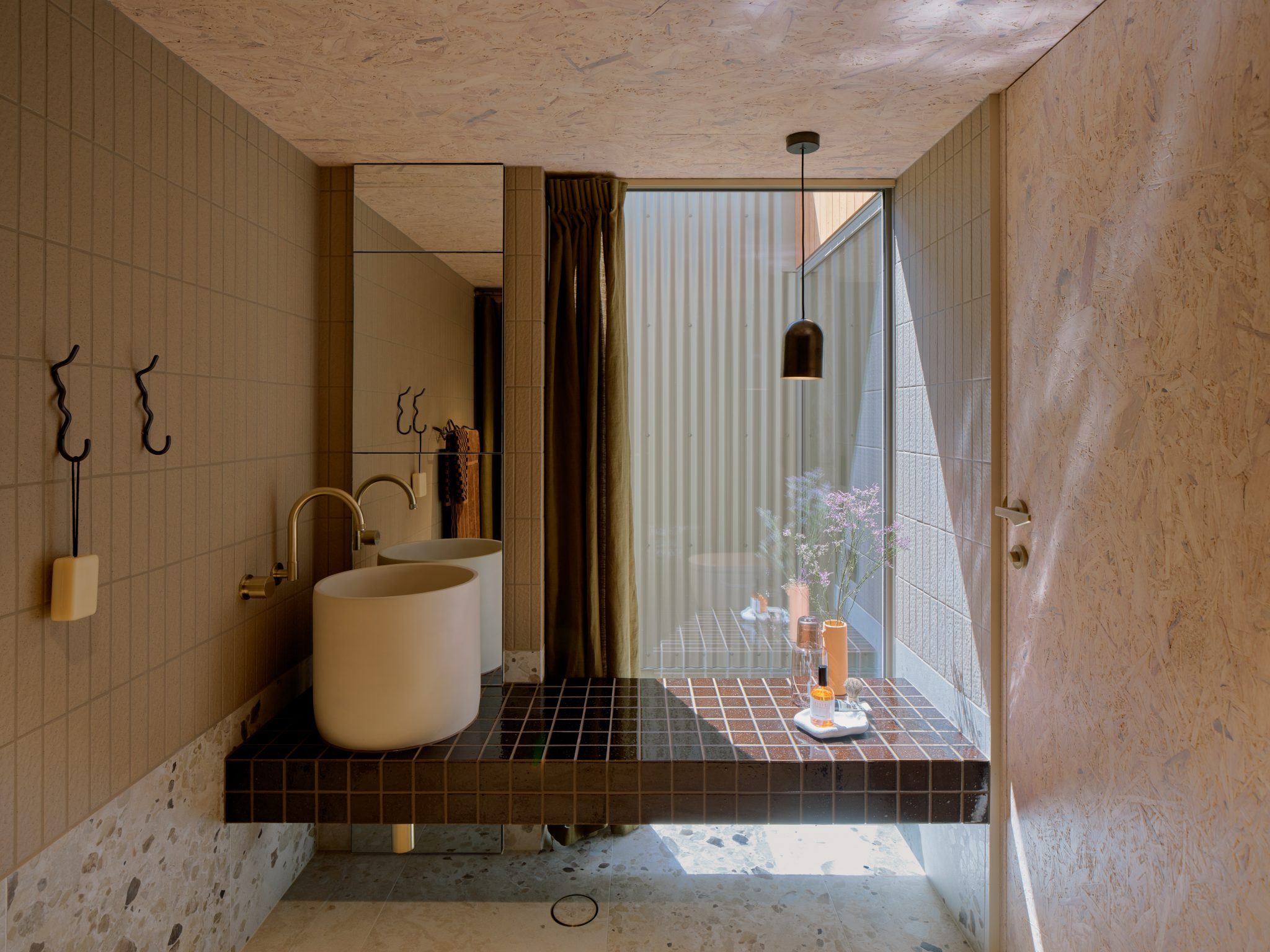 “Tumbled brass in all of the joinery handles; the super high gloss brown tiles in the bathroom, a lot of those ’70s nostalgia elements in the green …” Sophie listed some of the elements that helped create “the right kind of balance for the OSB to look sophisticated in its own sense.”