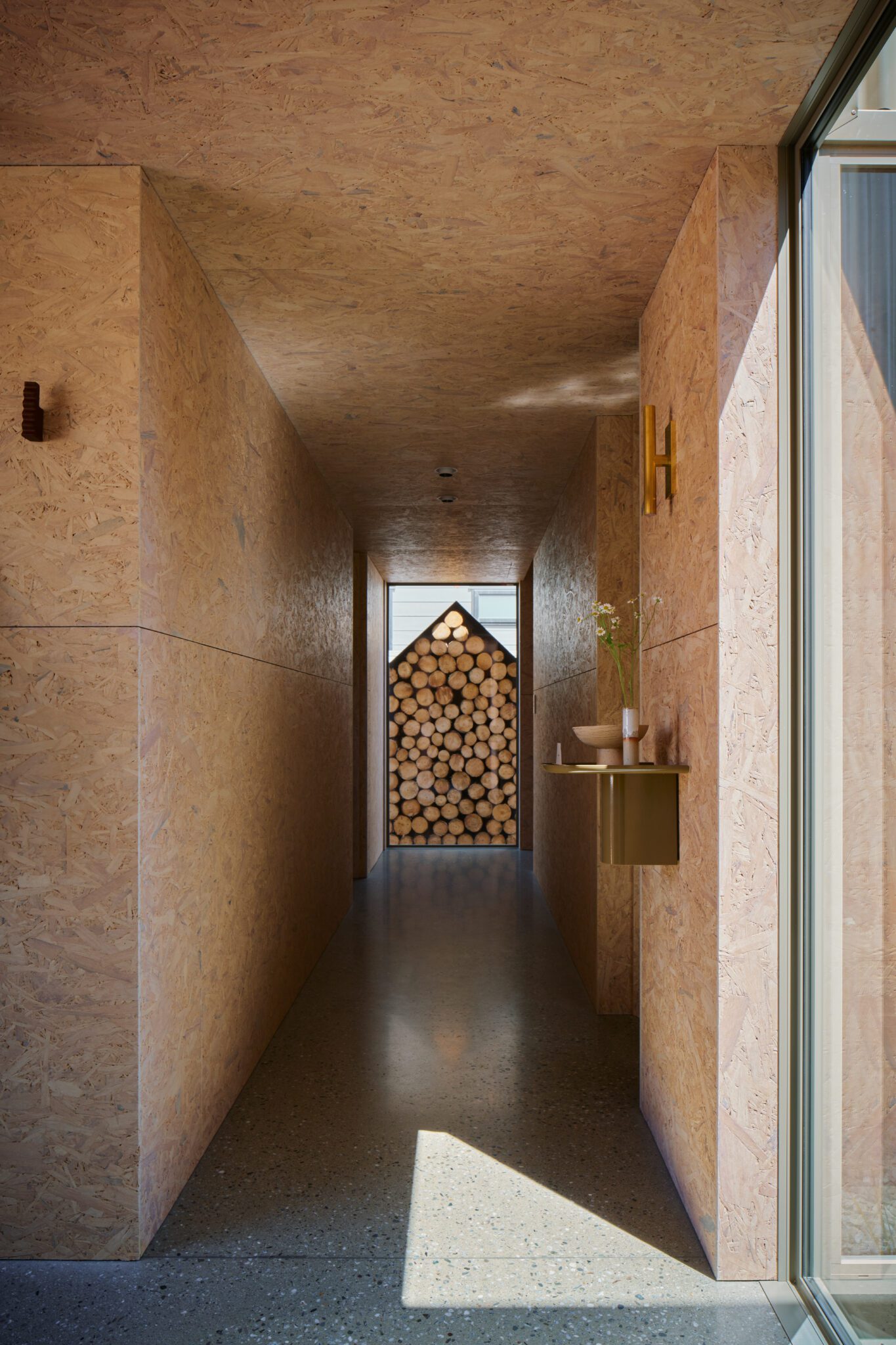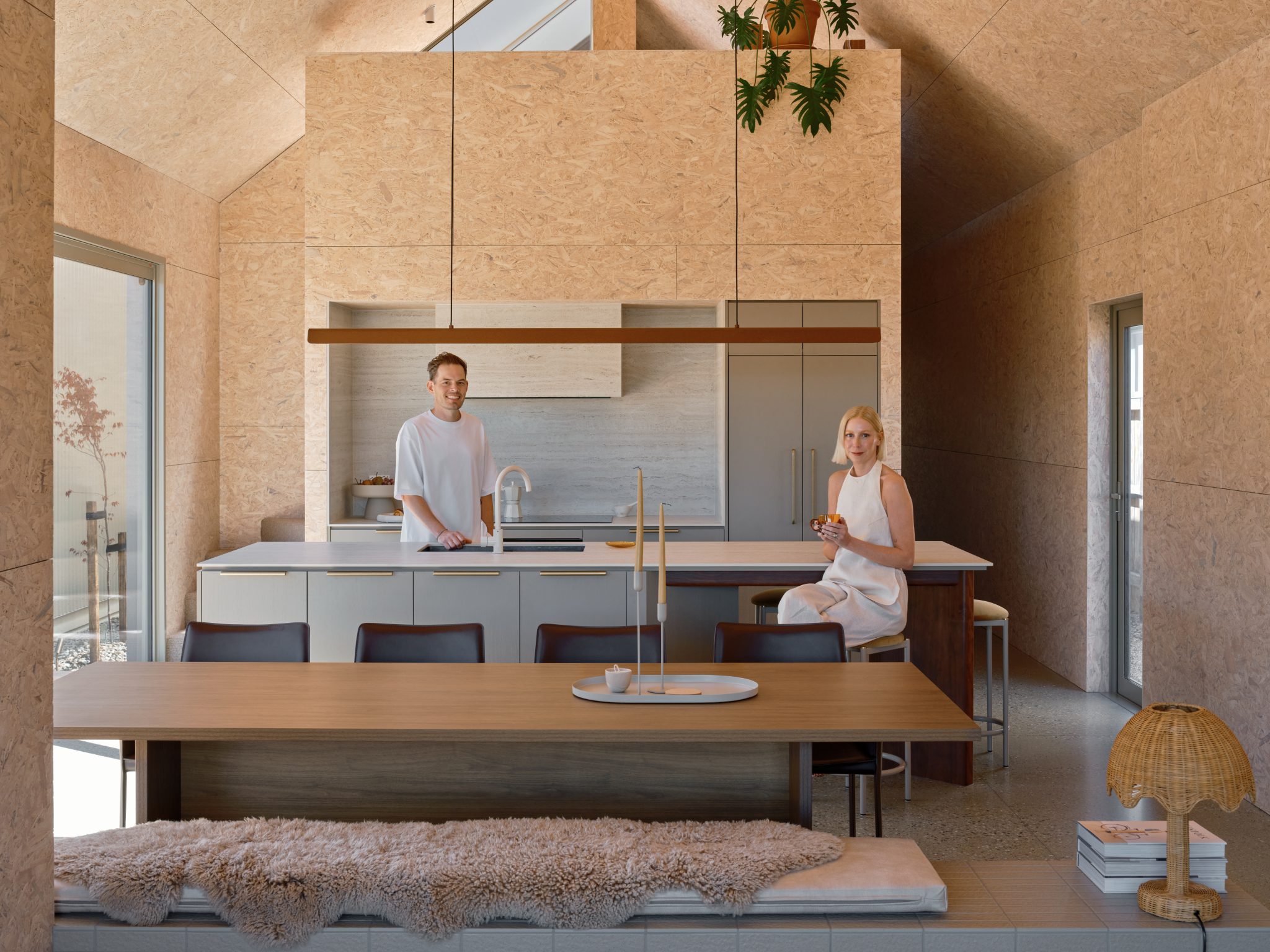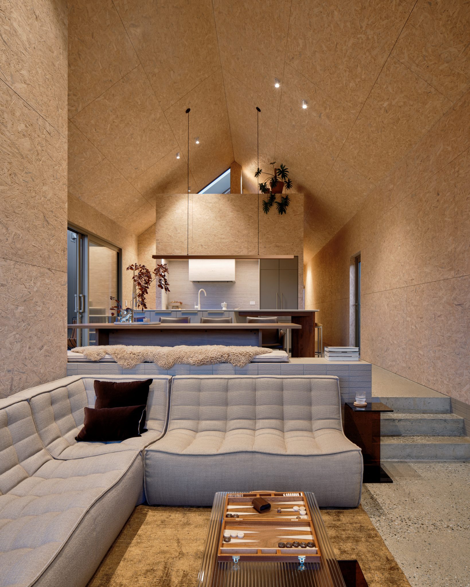 It is, however, the interior where this abode shines in more ways than one, and which impressed this year’s Home Interior of the Year judges. Firstly, there is the daring choice of strand board as the main internal cladding. Oriented Stand Board (OSB) was engineered in the resource-scarce, post-war America as a way to use timber waste on construction surfaces not intended for the public gaze. It is not a material widely used for its aesthetic properties and it is normally plastered and painted, hiding its mosaic-like properties.