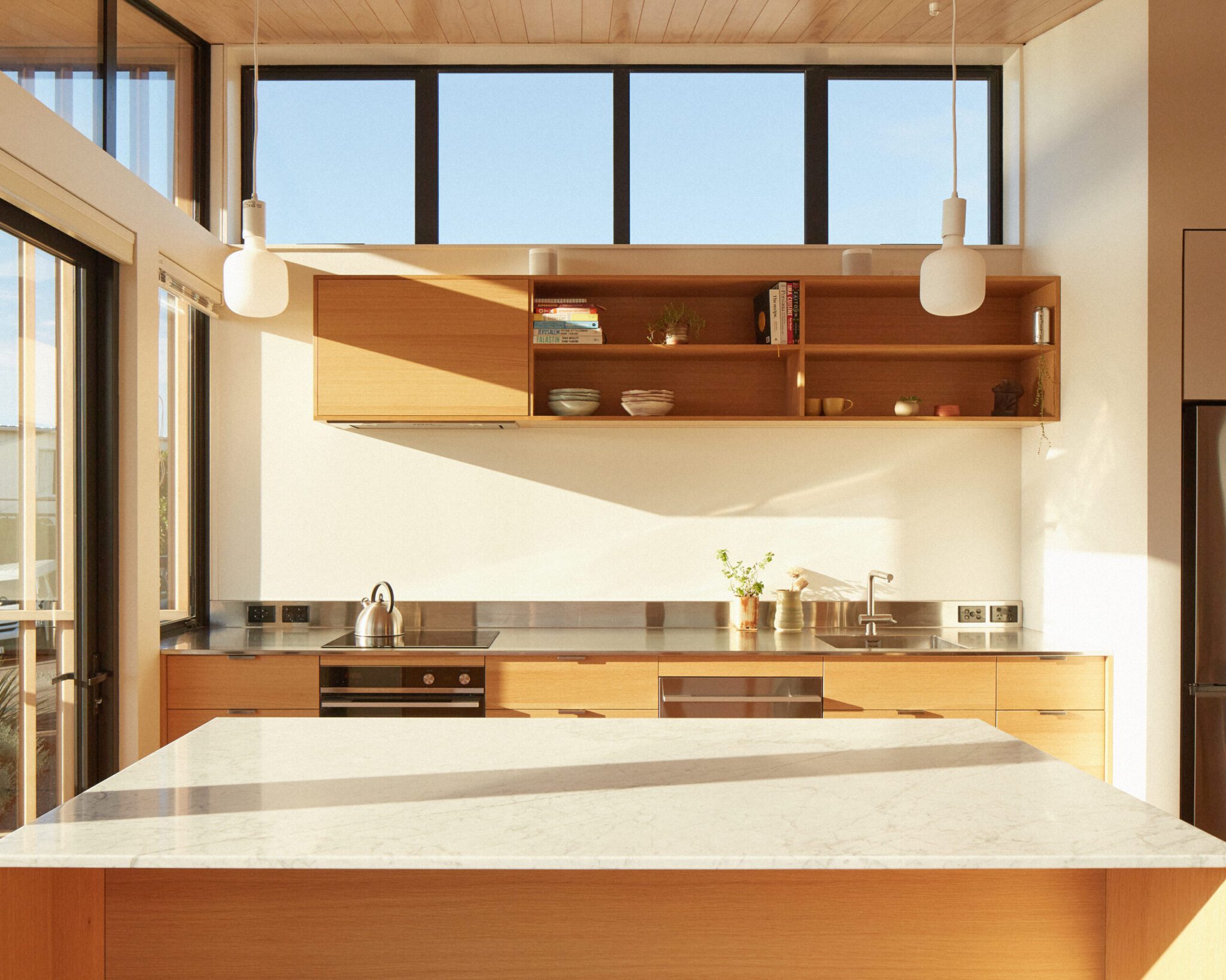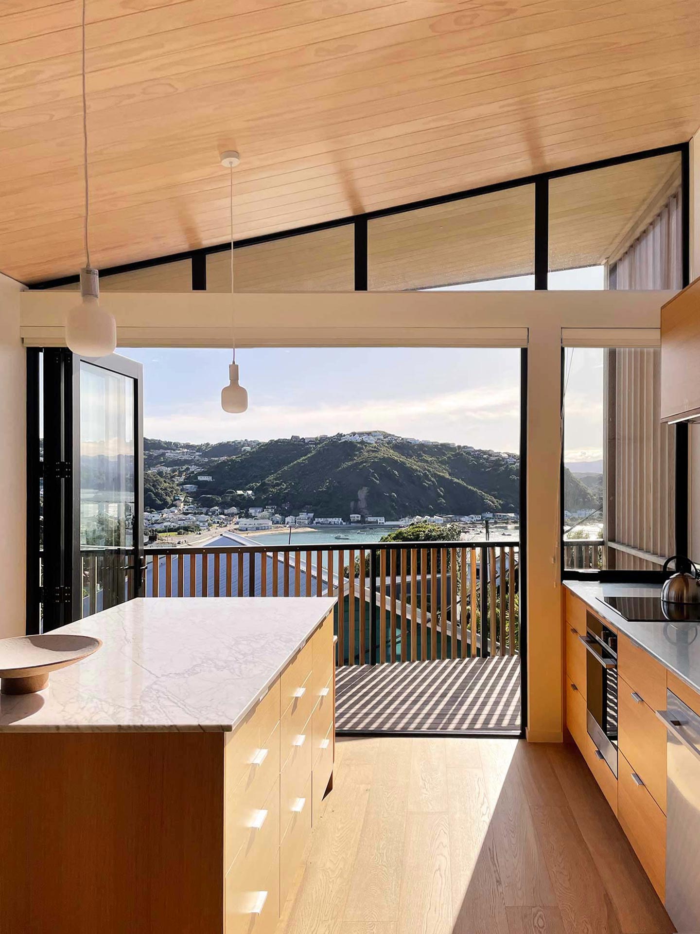 “Inside My House, the full-width bifolding doors opening out from the kitchen onto the deck create an immersive/ continuous connection between the interior and exterior. The roofline continues to encompass this transition where the ceiling travels out over the deck — drawing your eye out to the view while maintaining a sense of containment and shelter.”