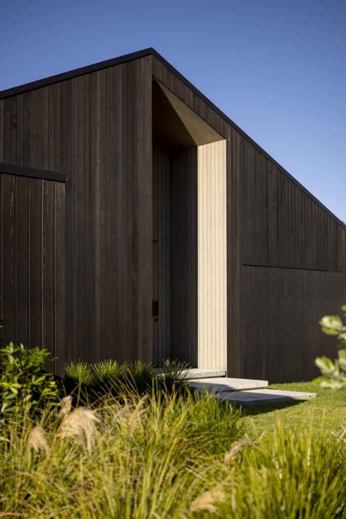 Beneath a striking gable, which Paul cut away to pique interest in the beachfront elevation, the home’s exterior is a mix of concrete and vertical cedar boards. Utilising two colours to create a dialogue between different parts of the exterior — the darkness of Dryden WoodOil Ironsand meets the sandy tones of Dryden WoodOil Platinum — the architect has designed a home that sits harmoniously with its environs.