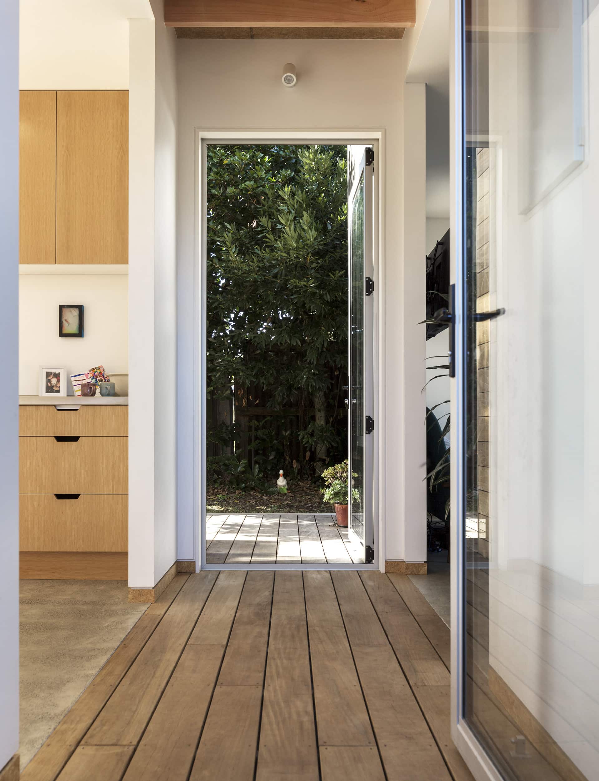 Initially, Stirrat conceived the ground floor as two separate spaces, split by an open-air corridor connecting the front and back decks. In one of the only changes, Kirstin and Dan pushed back against that, though the idea still holds: there are glass doors at either end, with decking timber bisecting the polished concrete flooring of the living areas.