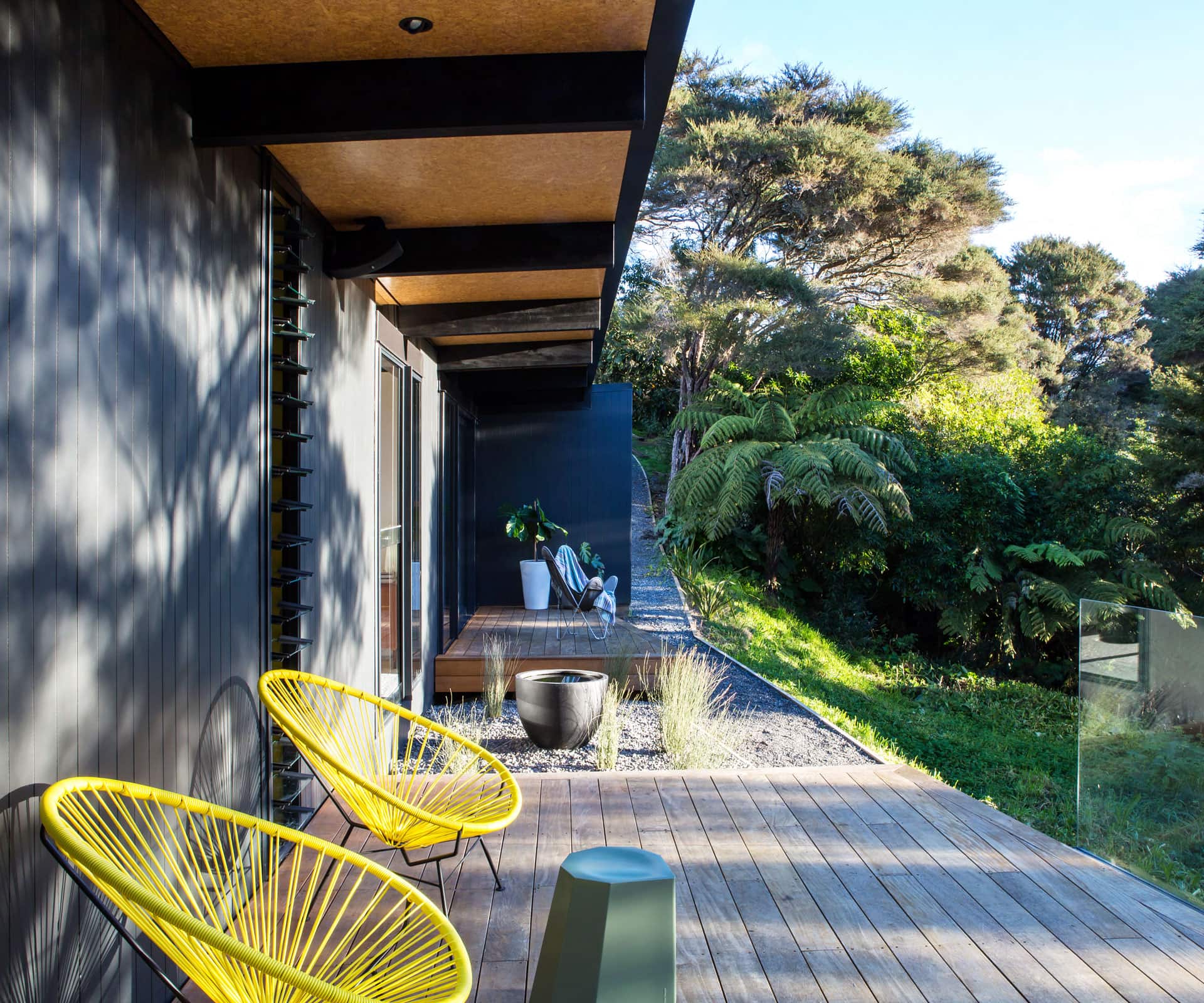 The stream likely scared off some buyers but Dorrington says the geotech didn’t dictate design too much. More limiting was resource consent – the decks are right on the boundary, with the house cuddling as close to the stream as height restrictions allow. Windows dominate that side, the house turning a hard shell to the neighbours.