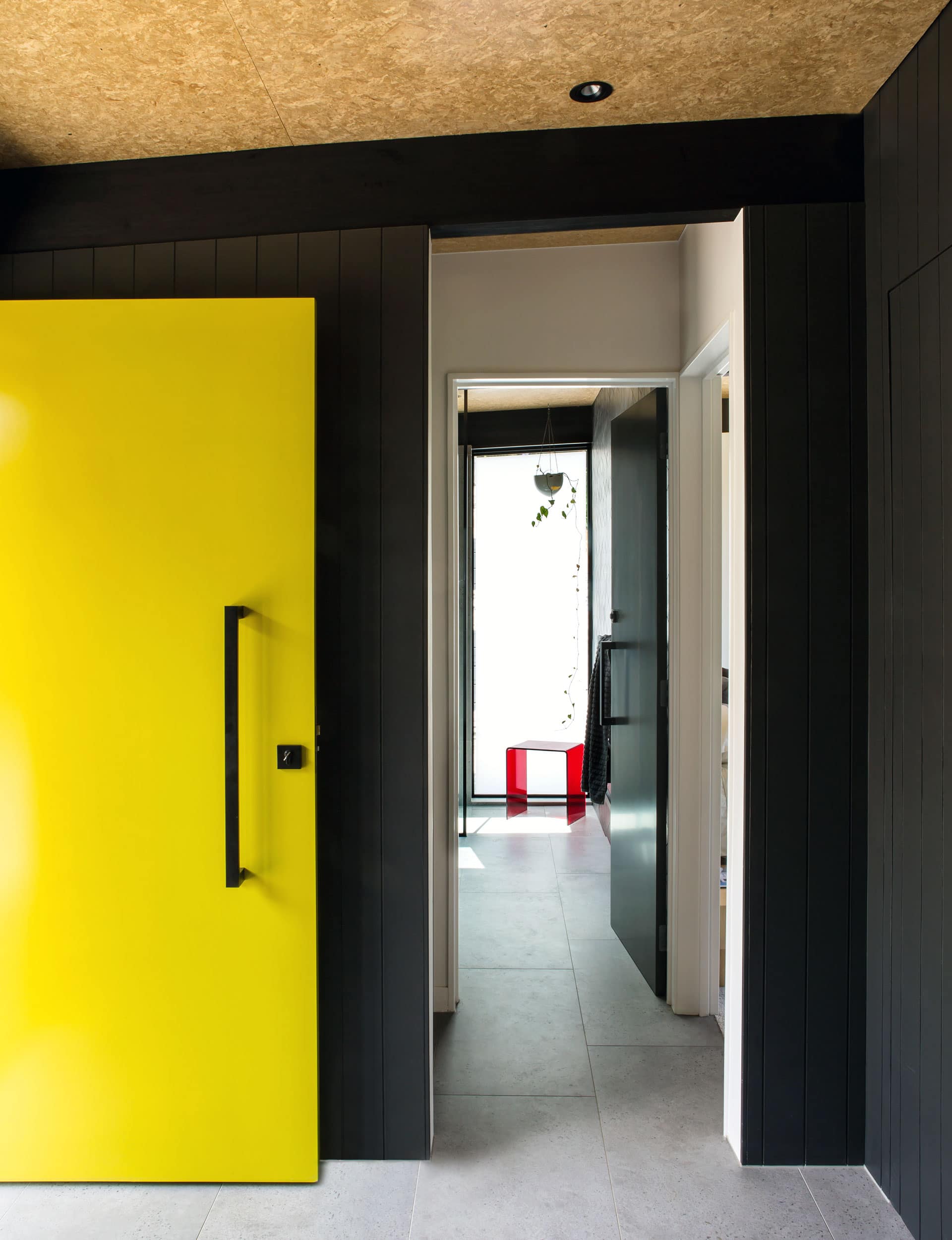 Black, you register. Sunlight. Then: biscuit-toned ceiling. It’s Strandboard, a bit unusual but cheap. Dorrington has been using it this way since he saw Chilean architect Mathias Klotz do so about 10 years ago. “I quite like using products in ways that maybe they’re not supposed to be used,” says Dorrington. “It’s normally one of the ugly ducklings in the material palette, but we’re celebrating it.”