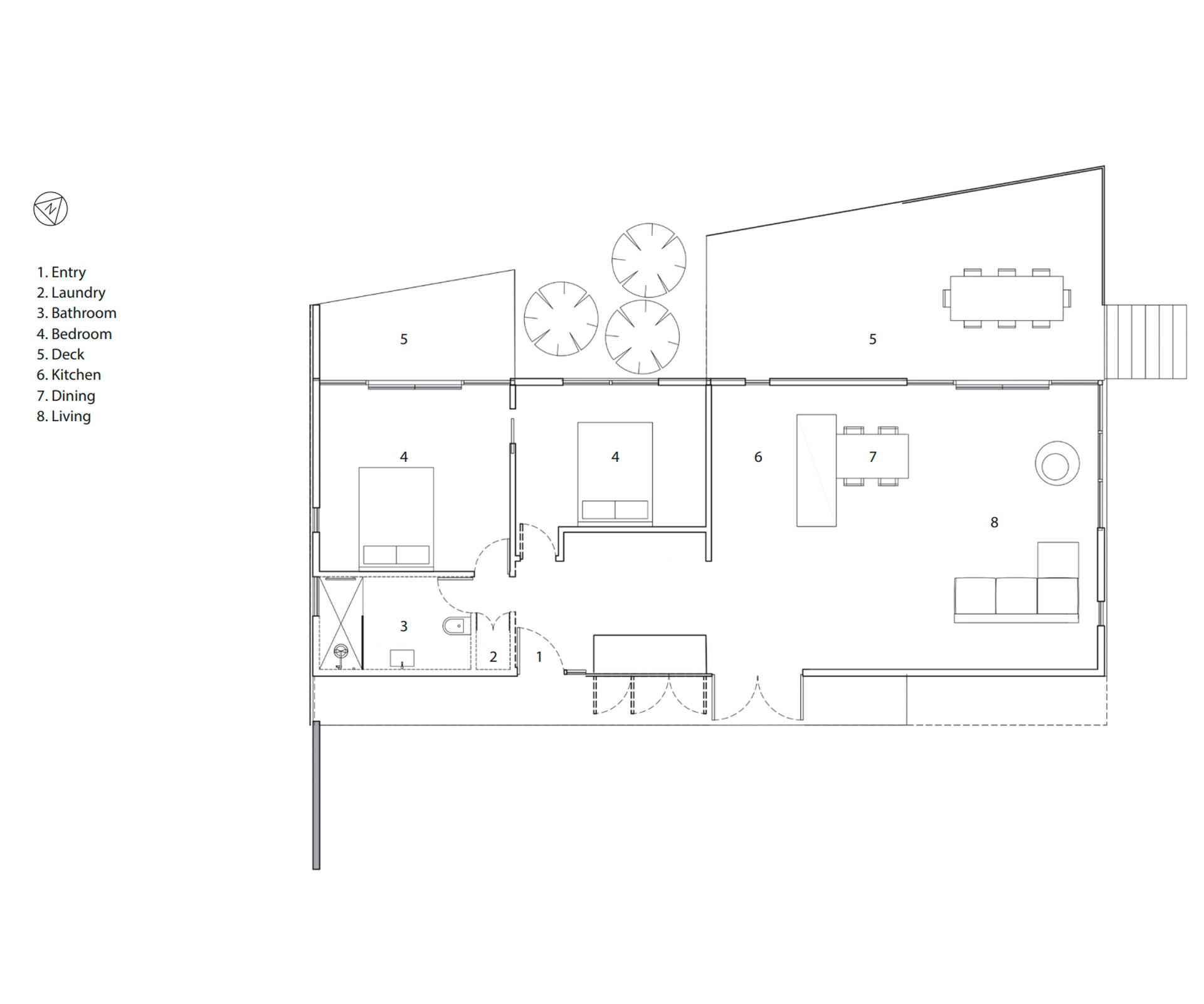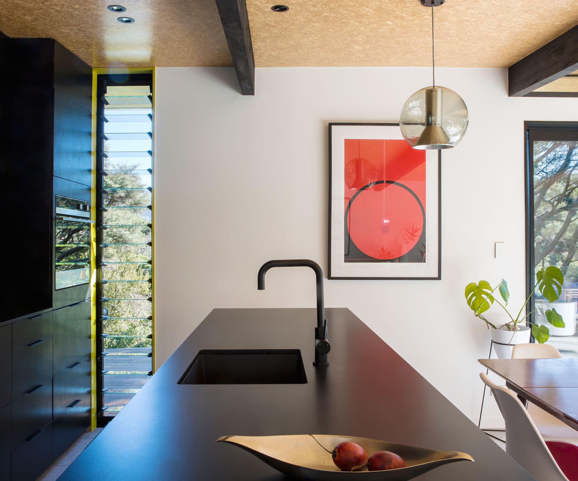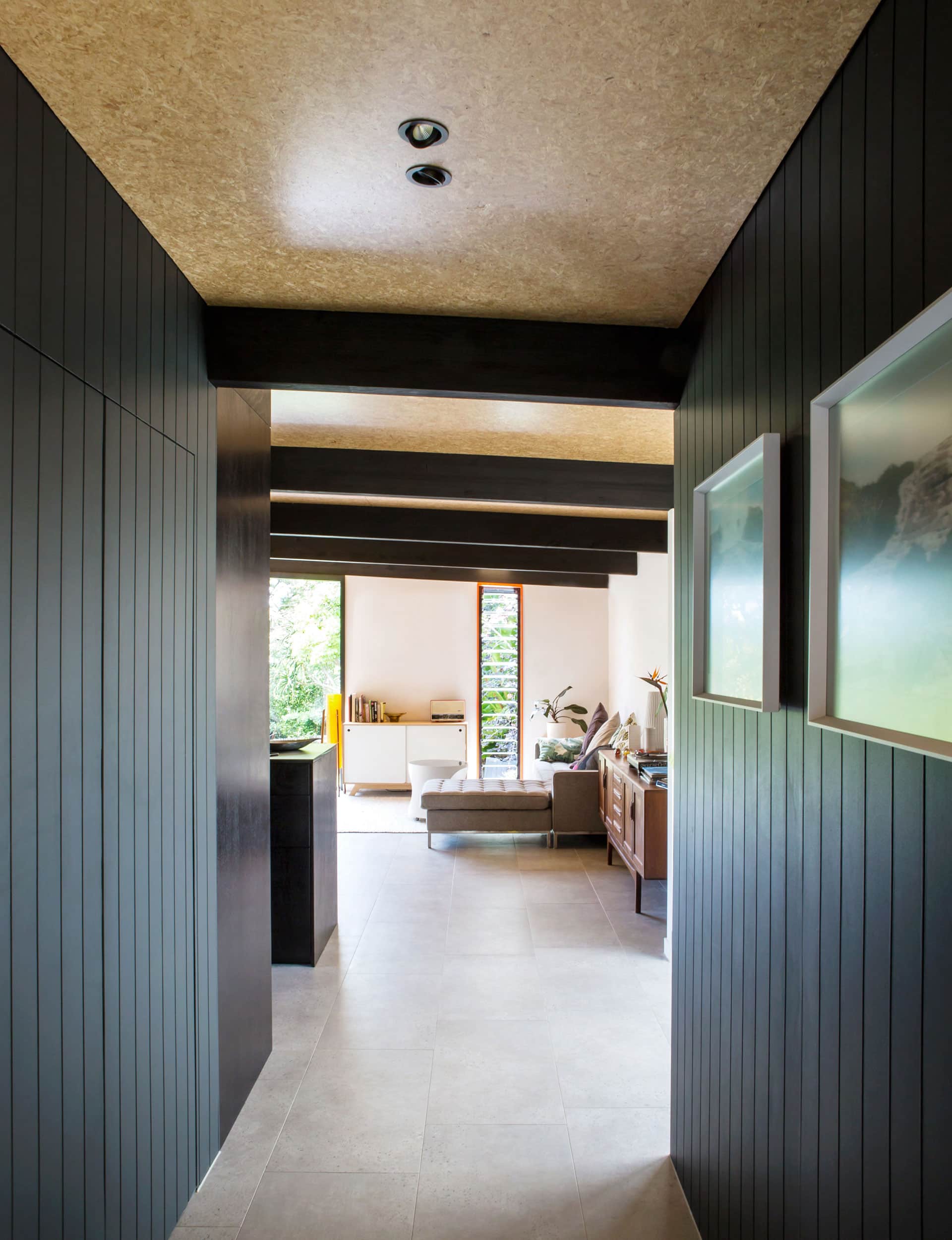 Coming in? Through that chink in the wall and turn left. The black cladding ducks inside, too, running down a short, wide hallway and hiding a series of doors: storage, two bedrooms. Its no-nonsense, mid-century march is picked up overhead, with black-laminated beams spaced at two-metre intervals throughout.