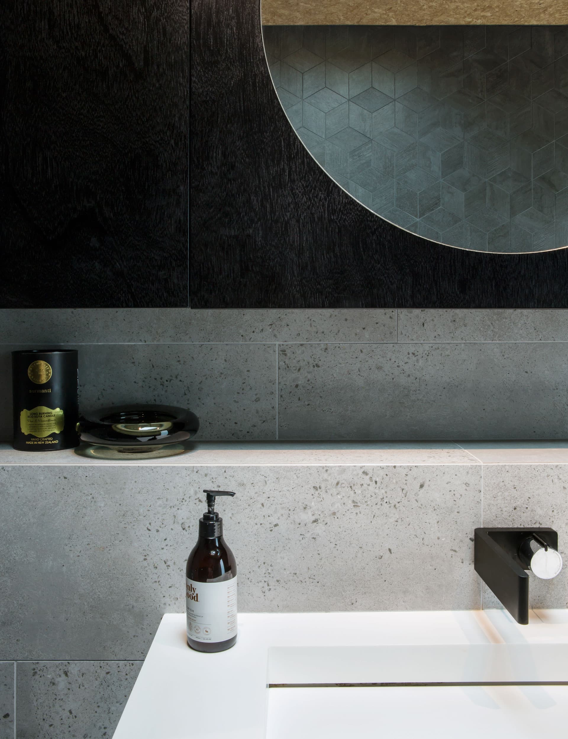 What’s with the black? “Goths,” shrug Flack and Wilkinson in unison. Dorrington: “It’s just nicer, the blackened timber. It’s quite a careful and sophisticated palette. A black kitchen doesn’t look like a kitchen anymore.” And it’s leavened by light. Even on a drizzly day, light billows into this house, sheeting across the biscuit ceiling and porcelain-tiled floor. Everything black is warmed up and textured; foiled by the bush, it hints at ponga trunks, the soft undersides of manuka.