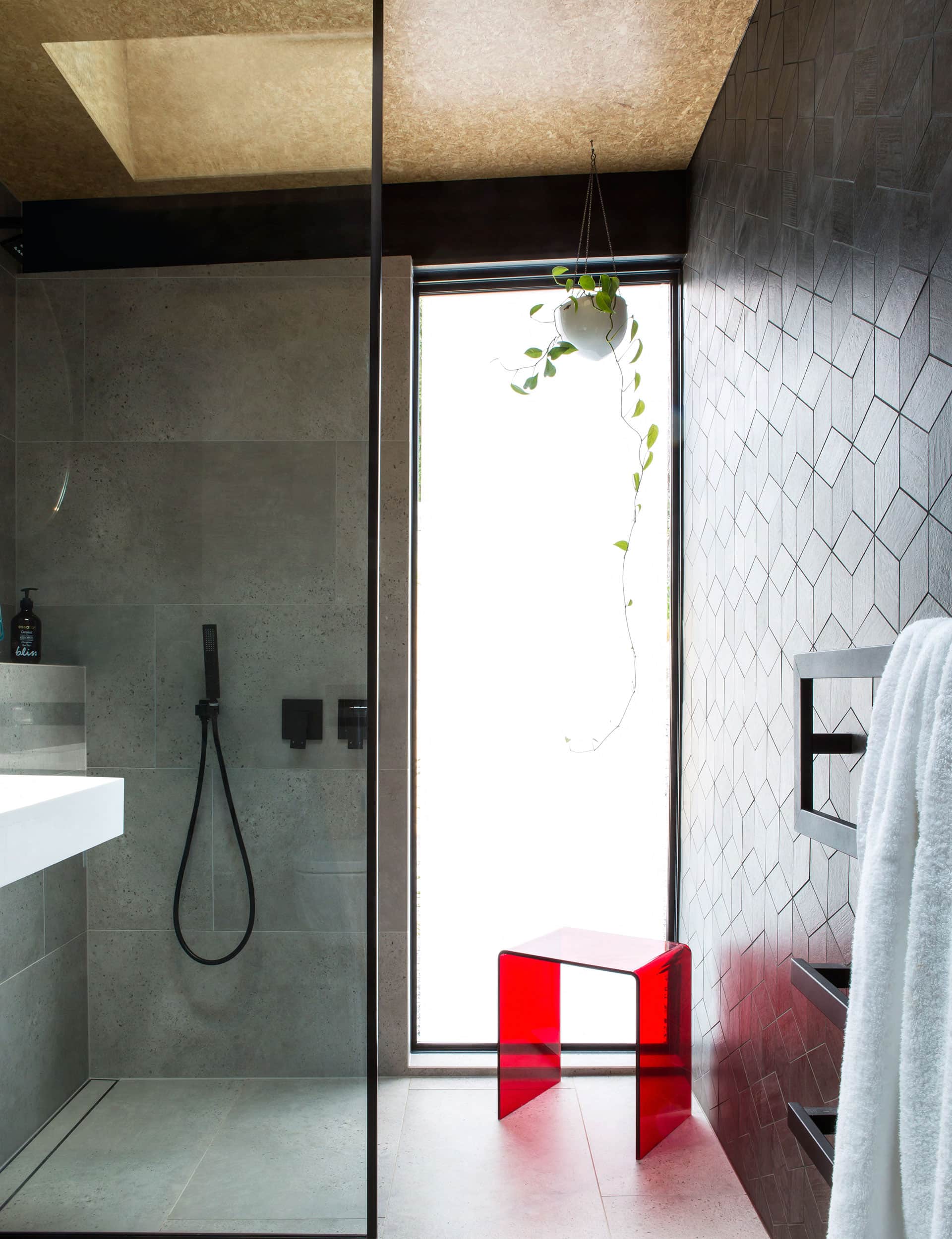 In the bathroom, practical, shallow cupboards and a ledge span one wall. Opposite is a wall of diamond tiles. With the door open, a tall window becomes “a light at the end of the tunnel”, says Dorrington.