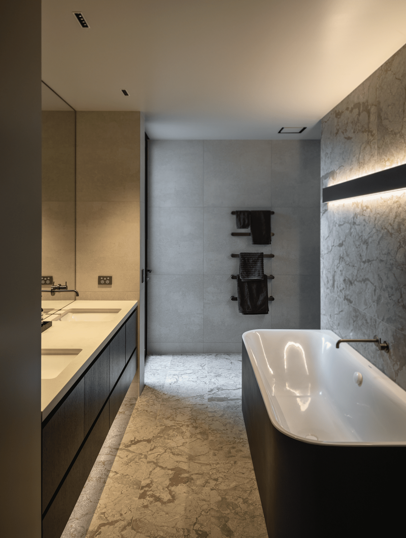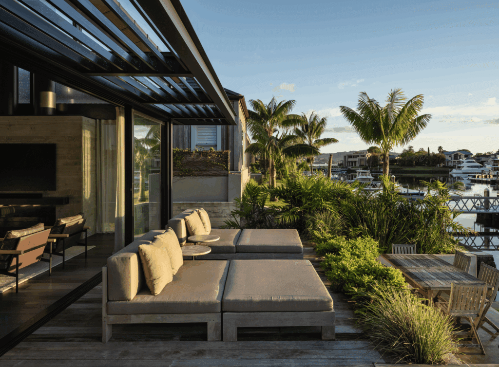 Sliding shutters with operable louvres can be configured to enclose the loggia, mitigate sea breezes, and provide shade. They also create privacy when entertaining or enjoying the media room and bar, where the family likes to watch sport or a favourite show.
